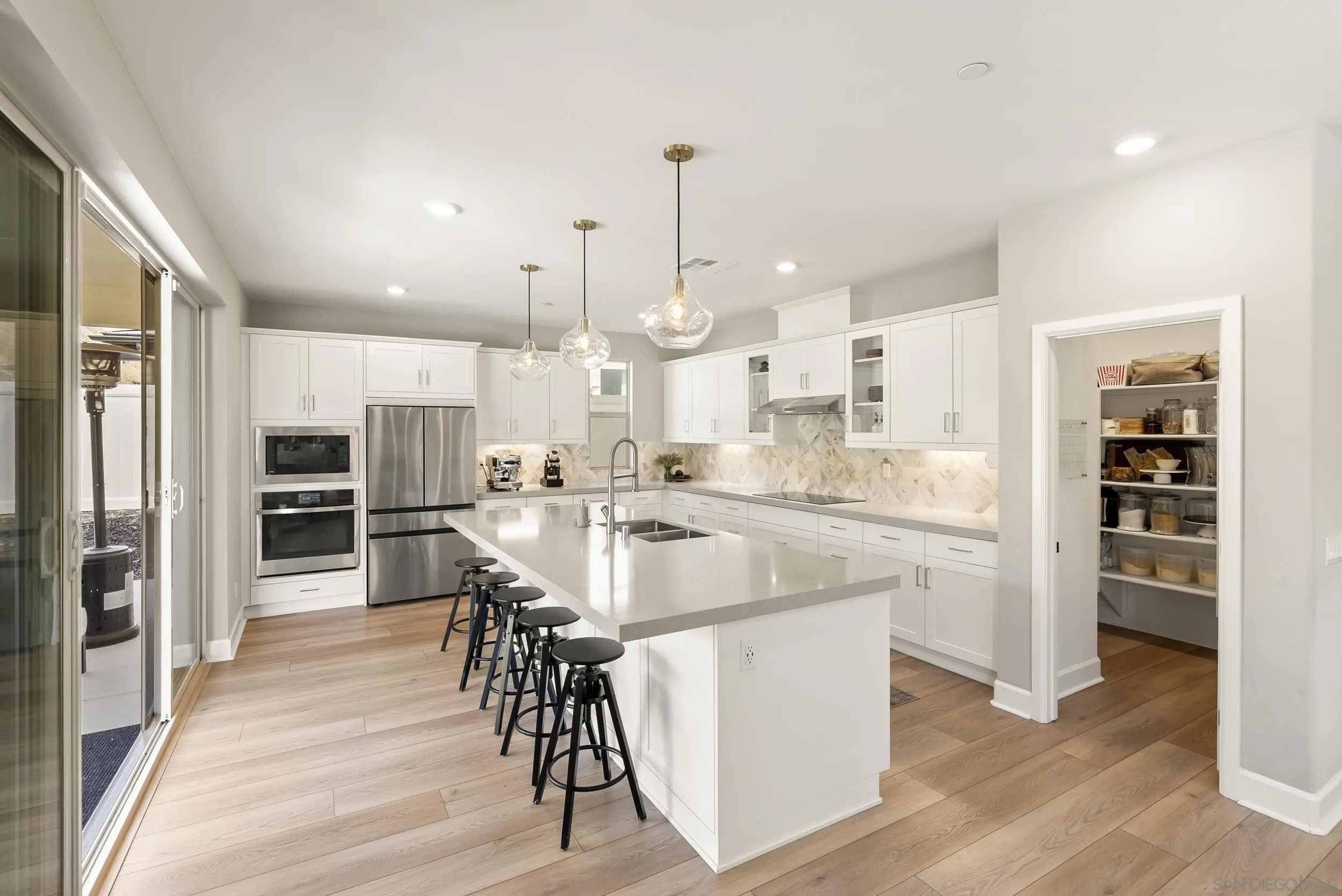 Located in the sought-after Skylark community of San Marcos, this beautifully upgraded newer home offers privacy, hillside views, and access to nearby trails with no direct neighbor behind. Built in 2023, the home features a flexible five-bedroom layout including a desirable downstairs ensuite bedroom, ideal for guests, multigenerational living, or a private home office. Inside, the open floorplan is designed for modern living with abundant natural light, luxury vinylwide-plank flooring, recessed lighting, and seamless indoor-outdoor flow. The chef’s kitchen features a large center island, quartz countertops, an induction cooktop, stainless steel appliances, walk-in pantry, and extensive cabinetry, all opening to the main living space and covered outdoor patio through oversized sliding doors.