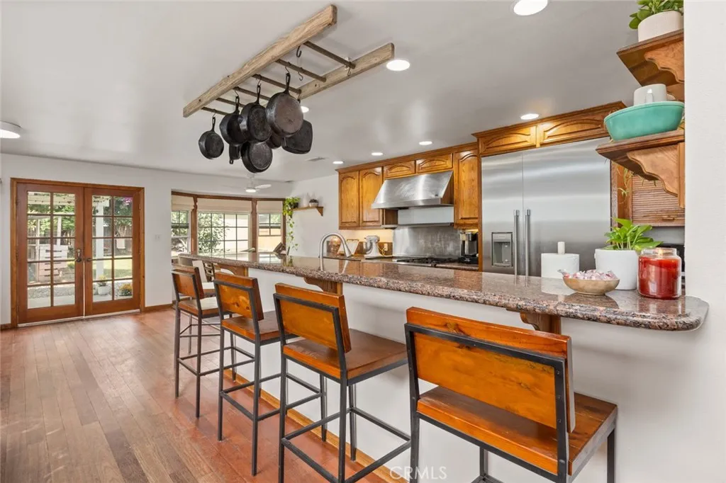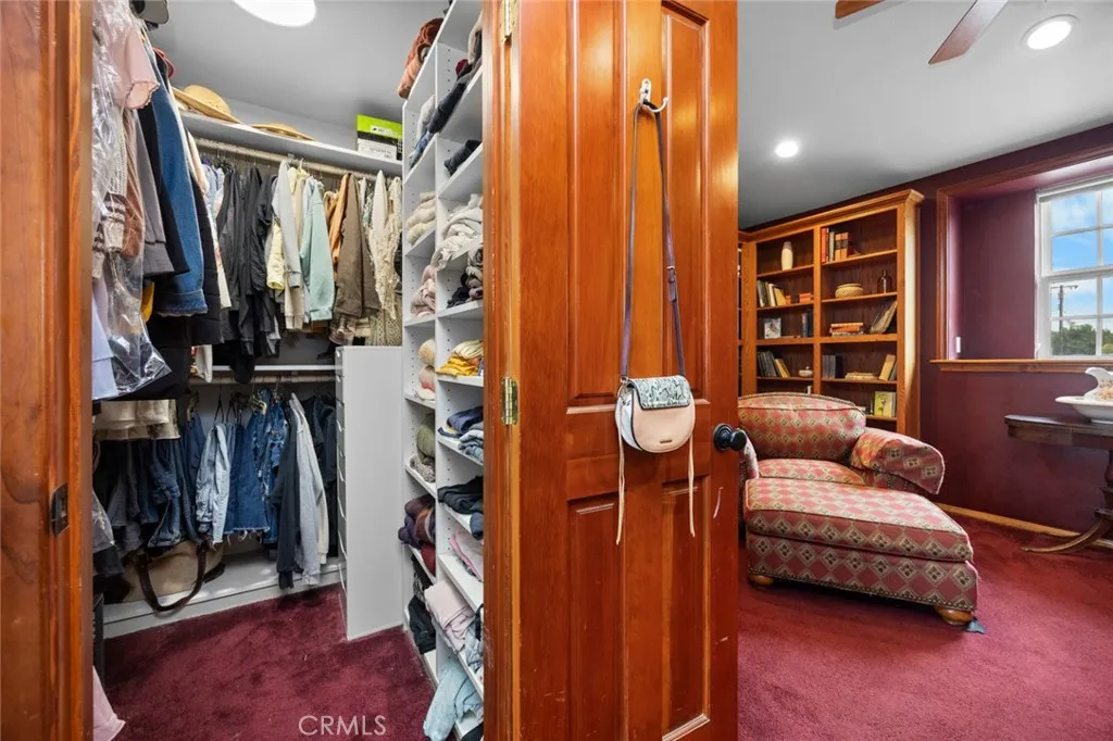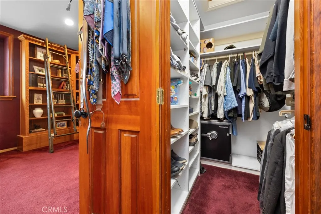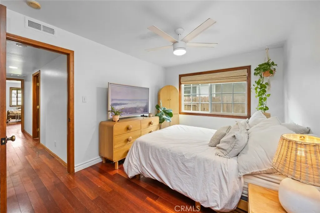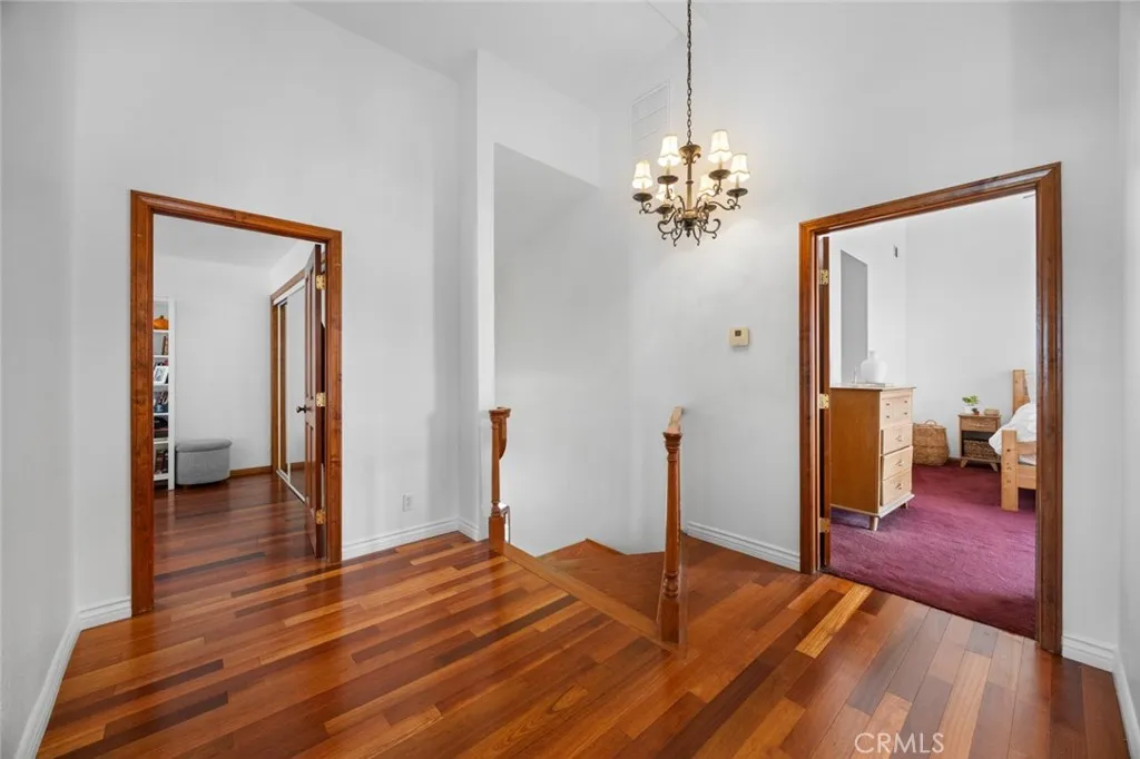 Must see! This very spacious 2-story home has 5 bedrooms, 3-1/2 baths, a bonus room/office and 2 separate AC/heating systems (downstairs and upstairs) along with 2 Primary bedrooms. It has a tankless water heater, whole home water filtration system and copper plumbing. There are upgraded building materials including 3/4 inch solid exotic Kempas wood flooring, custom wood-built library bookshelves, upstairs Primary bath cabinetry and kitchen custom cabinetry. All windows are Milgard vinyl framed with wood windowsills and are dual paned. The kitchen has granite counters with porcelain tile flooring, built in refrigerator, built in stove/range and a walk-in pantry. All interior doors are solid fir with 4 panels and Baldwin solid, oil-rubbed bronze doorknobs. The upstairs Primary bedroom has vaulted ceilings, dual walk-in closets and a library (with fireplace). The upstairs Primary bathroom has Travertine stone, a double sink with granite countertops and an open shower with double shower heads. There is a large private balcony with Terracotta tile connected to the Primary bedroom. The downstairs bathrooms have ceramic tile. Two of the downstairs bedrooms have walk-in closets. The spacious backyard (7,884 Sq Ft) is perfect for entertaining and has a gate with direct access to the bike trail, which is a 6-mile ride to Seal Beach. Backyard trees include: lemon, apple, avocado, apricot and orange as well as an artichoke bush. Additionally, there is a large shed with barn doors. The home is located within the ABC school district with access to Whitney High School and is close to par