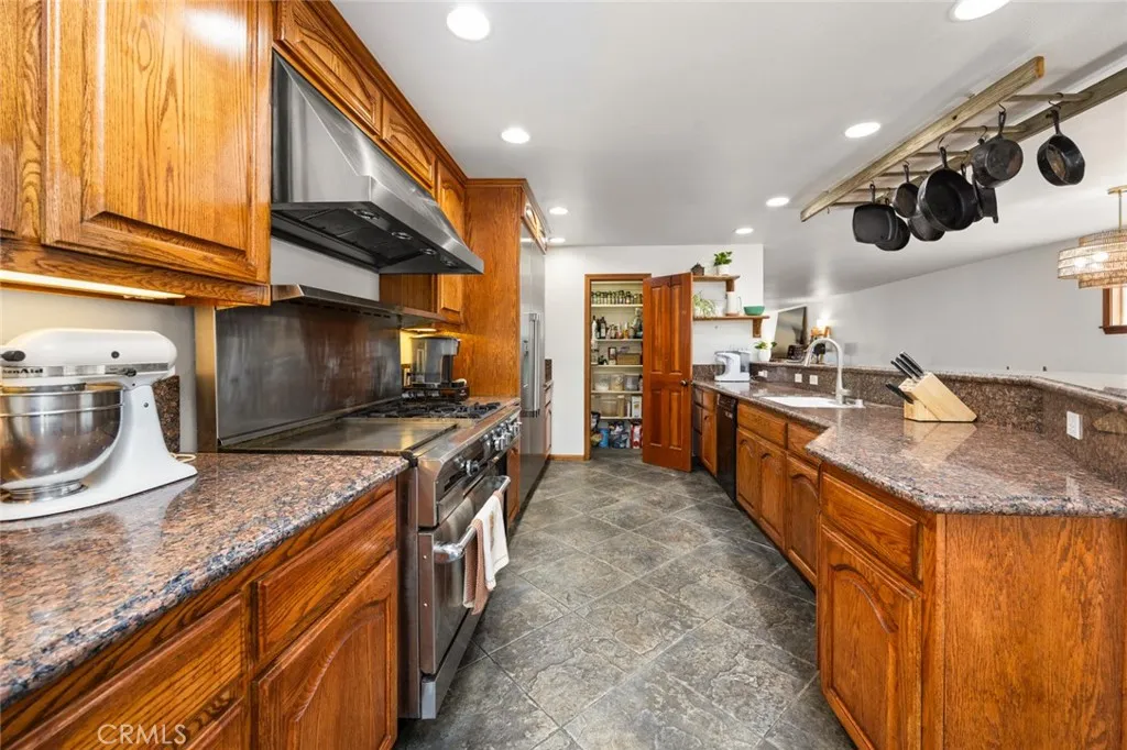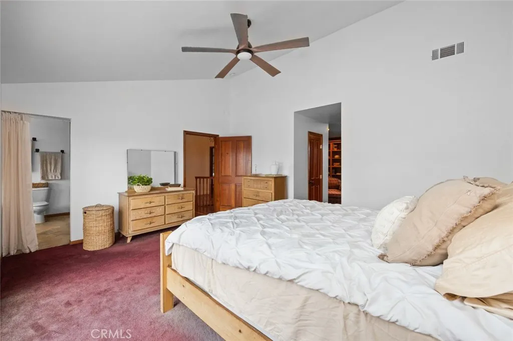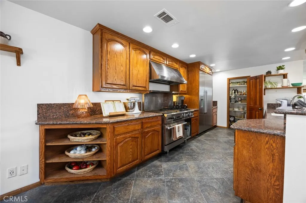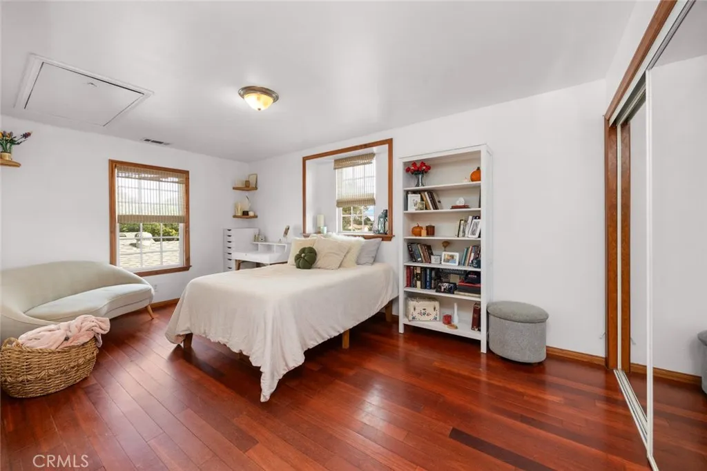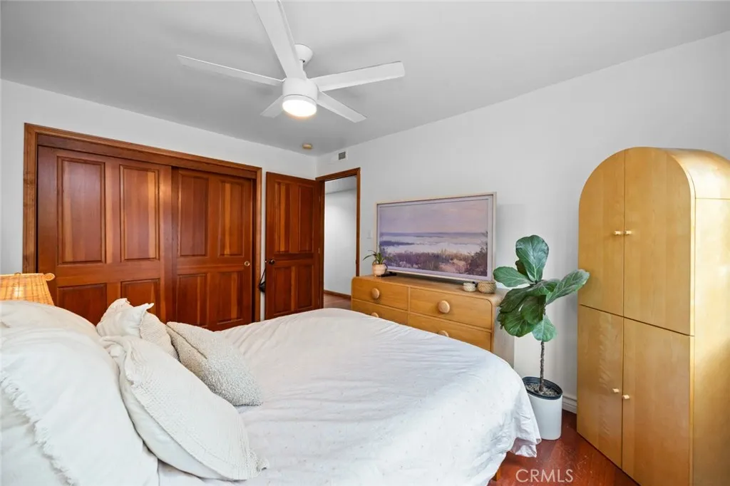 Must see! This very spacious 2-story home has 5 bedrooms, 3-1/2 baths, a bonus room/office and 2 separate AC/heating systems (downstairs and upstairs) along with 2 Primary bedrooms. It has a tankless water heater, whole home water filtration system and copper plumbing. There are upgraded building materials including 3/4 inch solid exotic Kempas wood flooring, custom wood-built library bookshelves, upstairs Primary bath cabinetry and kitchen custom cabinetry. All windows are Milgard vinyl framed with wood windowsills and are dual paned. The kitchen has granite counters with porcelain tile flooring, built in refrigerator, built in stove/range and a walk-in pantry. All interior doors are solid fir with 4 panels and Baldwin solid, oil-rubbed bronze doorknobs. The upstairs Primary bedroom has vaulted ceilings, dual walk-in closets and a library (with fireplace). The upstairs Primary bathroom has Travertine stone, a double sink with granite countertops and an open shower with double shower heads. There is a large private balcony with Terracotta tile connected to the Primary bedroom. The downstairs bathrooms have ceramic tile. Two of the downstairs bedrooms have walk-in closets. The spacious backyard (7,884 Sq Ft) is perfect for entertaining and has a gate with direct access to the bike trail, which is a 6-mile ride to Seal Beach. Backyard trees include: lemon, apple, avocado, apricot and orange as well as an artichoke bush. Additionally, there is a large shed with barn doors. The home is located within the ABC school district with access to Whitney High School and is close to par
