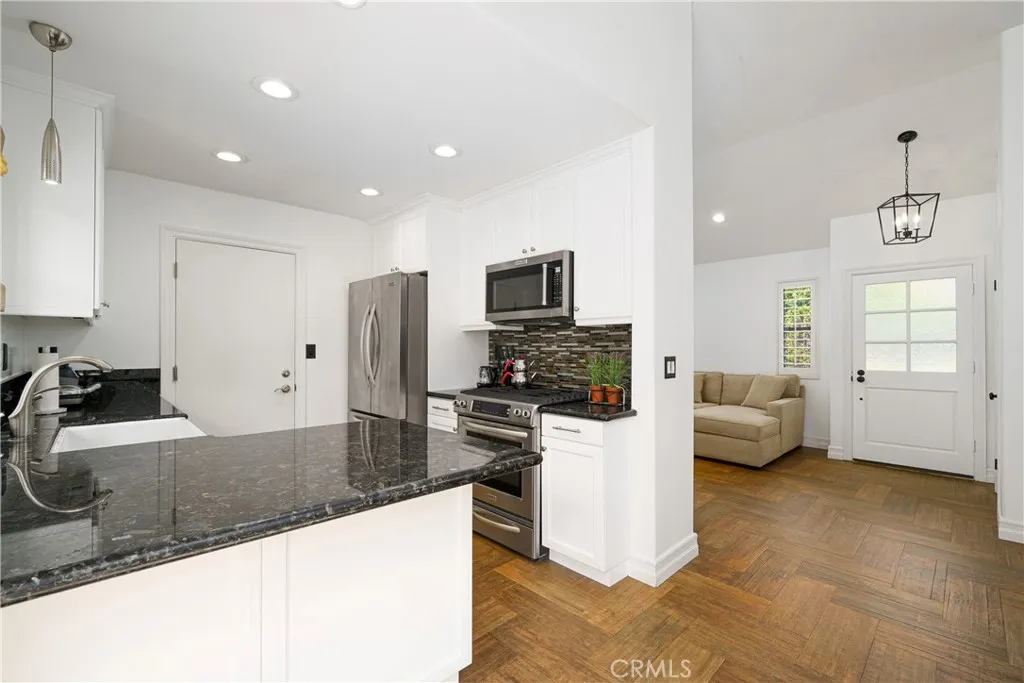 Welcome to your turn-key beautifully upgraded modern 2 bedroom, 2 bathroom, SINGLE-LEVEL end unit home in the prestigious South Lake community of WOODBRIDGE! Enter through a beautifully manicured front yard welcomes you with lush, low-maintenance artificial grass and a charming white picket fenceoffering classic curb appeal with modern convenience. Step into this light and bright home featuring a spacious living room with soaring cathedral ceilings that create an airy, open ambiance. A custom-built entertainment center anchors the space with style and functionality, perfectly complemented by a cozy fireplace that adds warmth and charm. This stunning Updated Kitchen combines style and function with granite countertops, a designer glass tile backsplash, and a spacious ceramic farmhouse sink and breakfast bar. Soft-closing cupboards provide a quiet touch of luxury, while sleek stainless-steel appliances offer both elegance and performance. Spacious primary suite featuring mirrored closet doors, built in closet and a modern barn door leading to a tiled en-suite bath. Enjoy a walk-in shower with dual shower heads, a dual-sink vanity, updated lighting, and two medicine cabinets for extra storage. Second bedroom features a built-in closet and its own charming private patio. Guest bathroom includes a bathtub and a new mirror. New paint, new carpet, built-in closets, custom entertainment center, newer HVAC, ceramic wood-look flooring, and designer shutters throughout. Enjoy private back patio. Perfect for entertaining, sitting/lounge space, A built-in gas BBQ station, complete with