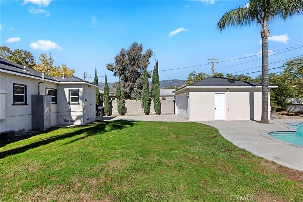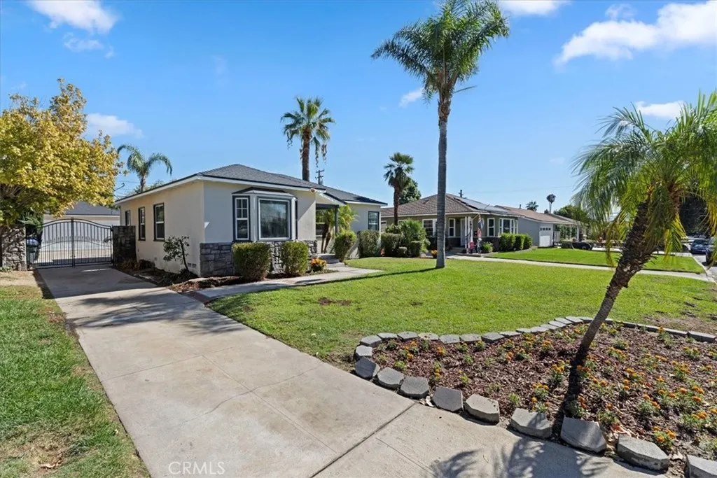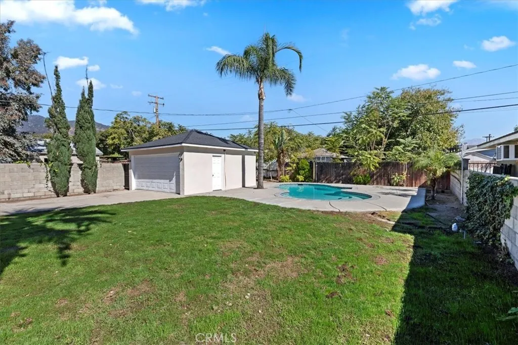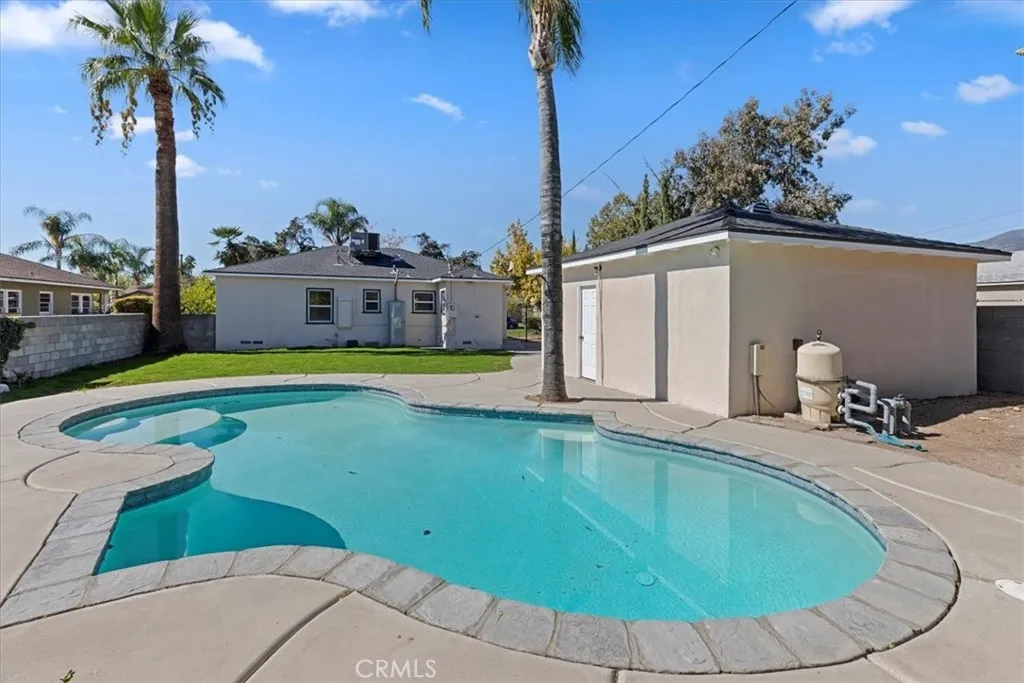 This beautiful pool home is move in ready with new exterior and interior paint; upgraded kitchen & bath; new carpeting in living room, dining area and two bedrooms; and newer windows. The living room has a bay window and new upgraded carpeting. A sparkling bathroom has a tub and separate shower and new vanity with double sinks. The bright remodeled kitchen has new white counters and cupboards with self-closing drawers. A desirable interior laundry room is located off of the kitchen for easy access to rear yard and also makes a great mud room. Automatic sprinklers front and back with block walls in the back and great curb appeal in the front offering lots of room in both the front & rear yards. The 2-car detached garage with rollup door is located at the rear of property with attractive wrought iron gate access. The detached garage might be a good option and consideration for a conversion to an ADU (Accessory Dwelling Unit). This is a fantastic opportunity for a first-time buyer to own a well-maintained 1950's home with three bedrooms; a spacious yard and built in pool. This home offers close freeway access and is close to schools, shopping, medical facilities and minutes away from two major golf courses. Metrolink commuter rail is within 7 miles. Not for rent or lease. Don't miss out on this property.