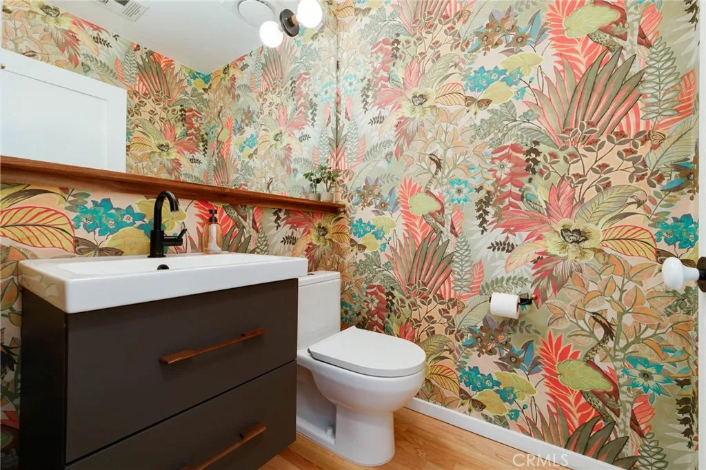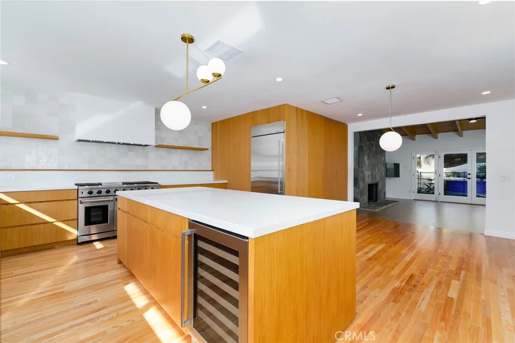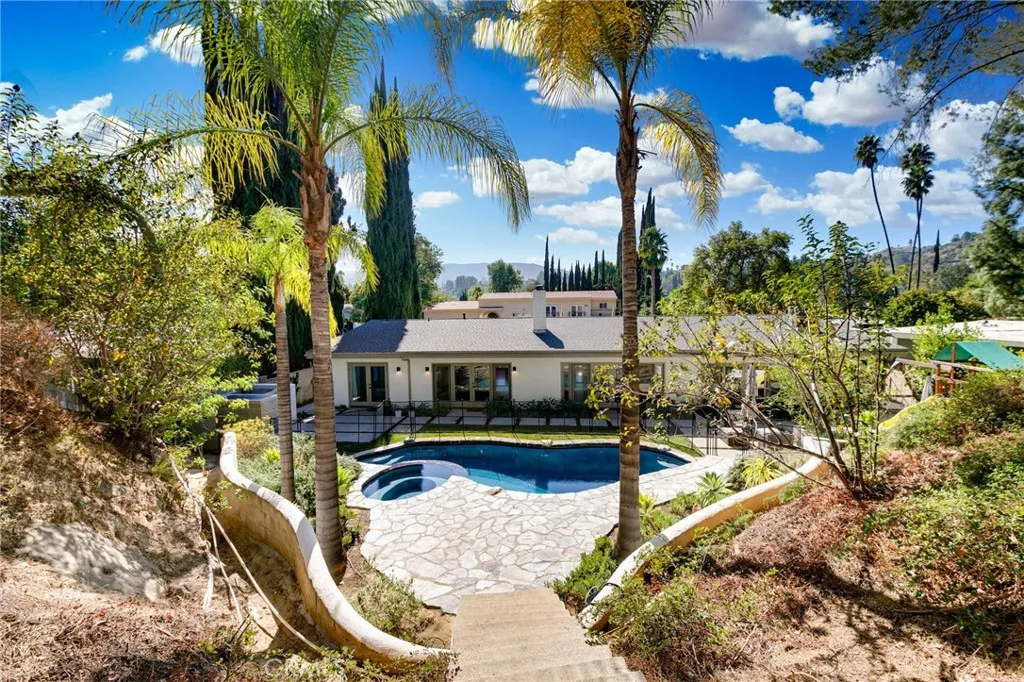 Newly remodeled mid-century modern stunner designed by a renowned architect, nestled on tree-lined street south of the boulevard. Set on nearly 15,000 sq ft of meticulously landscaped grounds, this 4-bedroom, 3.5-bathroom home spans 2,864 sq ft of light-filled living space. Clean modern lines and lush, drought-tolerant gardens frame the exterior, creating a peaceful, private retreat. A custom wood front door opens into a bright, expansive living area with new floors, exposed wood-beam ceilings, and striking double-sided fieldstone fireplace. Walls of glass line the back of the home, opening to a resort-style backyard complete with heated pool, hot tub, outdoor fireplace, view terrace, and playsetideal for year-round entertaining and family enjoyment. At the heart of the home is the remodeled gourmet kitchen featuring an eat-in island, breakfast bar, custom white oak cabinetry, and stainless steel appliancesperfect for both casual meals and entertaining. The luxurious primary suite is a true sanctuary, boasting spa-like bath with dual vanities and spacious walk-in closet. Additional highlights include owned solar panels, and eco-conscious landscaping for effortless, sustainable living. Dont miss your chance to call this architectural gem home!