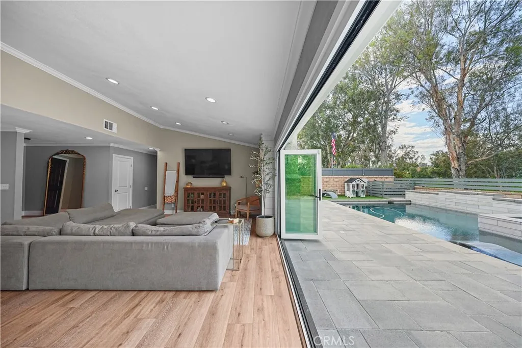 TAKE ONE LOOK AT THAT YARD, AND YOU WILL DO WHAT EVERYONE DOES. YOU WILL ASK YOURSELF, 'WHY"? You will believe they spent about $200,000 on their backyard paradise consisting of artificial turf, a stack stone wall, the concrete pavers, the luxurious pool with 3 waterfalls, the 10'X10" spa, the SMOKER and separate bar-b-q ($8.6K), the free standing outdoor fireplace with flatscreen TV and the outdoor refrigerator. What helps make this home so special is the easy access to this fantasy rear yard through the Win-Dor Bi-Folding Doors ($21K installed) that make up nearly the entire LR and DR walls facing the rear yard. Look at the photos and accompanying 3D Matterport Virtual Tour which are neither a trick nor an illusion. That wall just kind of disappears. Talk about "Open Concept!" To answer the question, "We thought this was going to be our forever home and we wanted it to be special and perfect." They may have spent more on the inside of the house than on the outside. As with many homes on the market, this single story charmer also has raised panel doors, Shaker Style soft close cabinets/drawers with dovetail joint construction, textured ceilings, vinyl windows/sliders, door/window casings, crown molding, oversized baseboards, wide-blade Plantation Shutters, Decor plugs/switches, recessed lighting, a pulldown attic ladder in the garage, a 2 year old HVAC system, remodeled kitchen/baths and Luxury Vinyl Flooring. This home is in a highly desired neighborhood in the heart of Mission Viejo, near schools/shopping, with easy access to transportation AND has a panoramic view overl