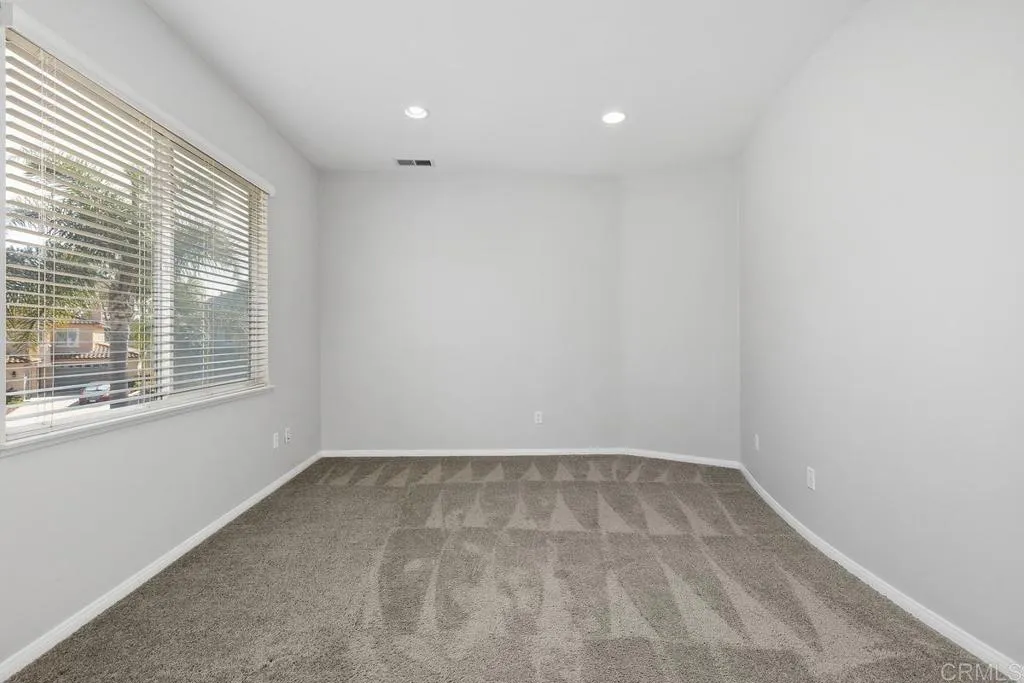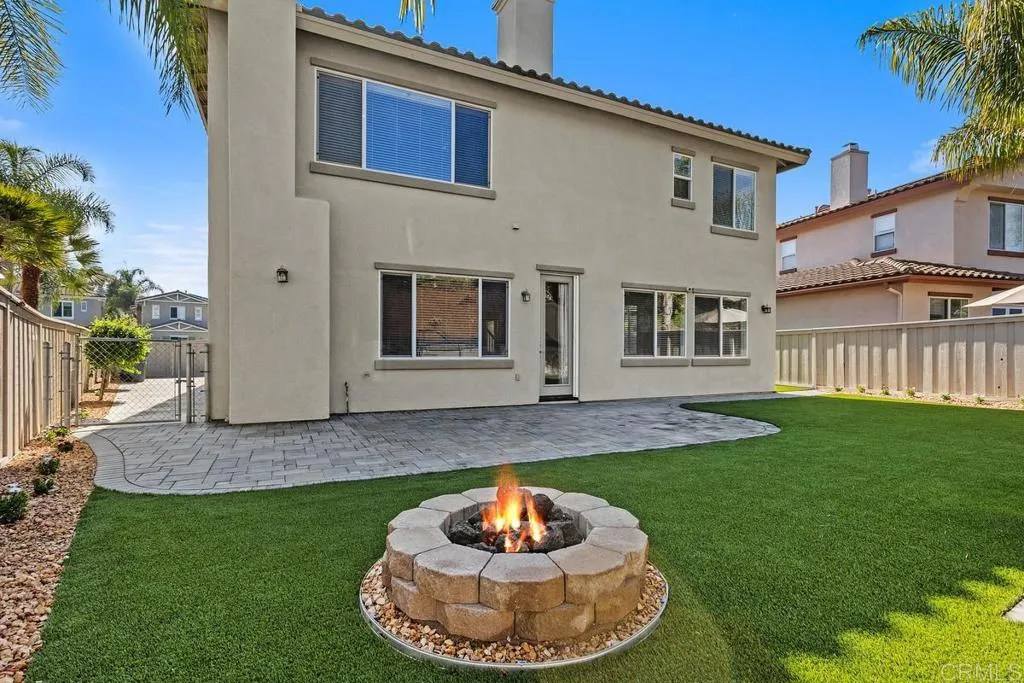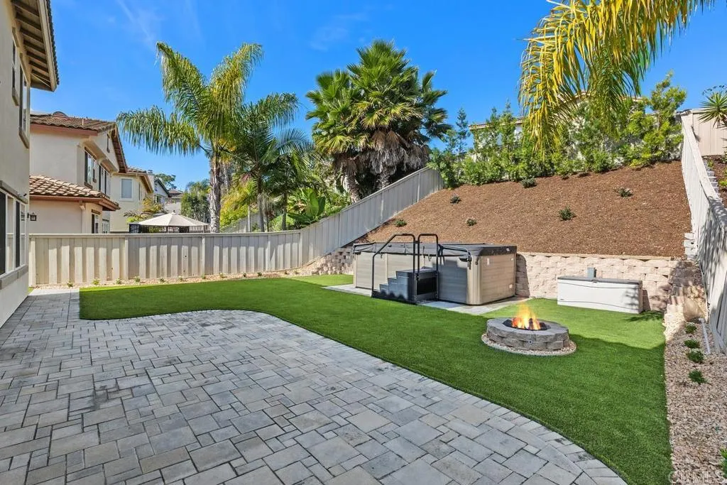 Welcome to this exceptional 4-bedroom+ office and 3-bath Calavera Hills home with owned solar, a main-level room, full bath, and a large yard with a swim spa. A soaring two-story foyer welcomes you and flows into the formal spaces. The two-story dining room showcases a wall of windows that fill the space with natural light and seamlessly lead into the adjacent formal living room. Luxury vinyl plank floors extend throughout this level, leading to the heart of the home: an expansive kitchen with classic white cabinetry, a center island with breakfast bar, double ovens, and a daily dining area. The family room centers on a fireplace with a media niche and a wall of windows to the yard. Completing this level are a bedroom with French doors, a full bath with a walk-in shower, and a laundry room with a utility sink and upper cabinets. An elegant, curved staircase leads to the generous primary suite with a fireplace, two walk-in closets, and a private retreat that closes with French doors. The primary bath includes a large walk-in shower with a bench, an oversized soaking tub, two vanities plus a seated vanity, and a separate water closet. Three additional bedrooms, a hall bath, and an expansive walk-in linen closet complete the upper level. Outdoors, enjoy turf, a paver patio, a gas fire pit, a large swim spa, and two oversized side yards, one turf and one concrete. Additional features include dual-zoned AC and furnace (new in 2021), Ecobee thermostats, ceiling fans, and a Ring camera system. Conveniently located near Lake Calavera Preserve with access to Calavera trails, parks,