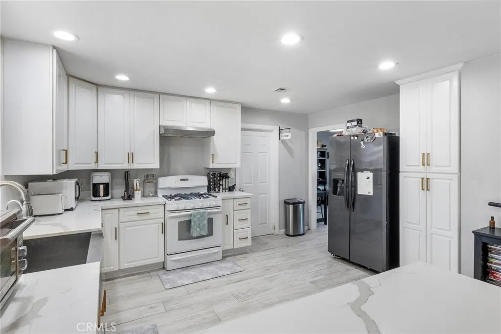 Welcome to this stunning 3-bedroom, 2-bath home offering a comfortable living space on an expansive lot. Step inside to discover elegant light gray wood-look tile flooring that extends through most of the home, creating a cohesive and modern feel. The spacious kitchen features recessed lighting, crisp white cabinetry, sleek white counter tops, and a large single-bowl sinkperfect for everyday living and entertaining. Enjoy meals under a stylish modern light fixture in the dining area, while both bathrooms showcase beautiful tile flooring and matching tile back splash in the showers, complemented by energy-efficient LED lighting. The primary bedroom offers a private en suite bathroom for added comfort, while the guest bedrooms feature cozy carpet flooring and ceiling fans. Additional highlights include recessed lighting throughout the home, a generous laundry room, and a large covered patio overlooking the spacious backyardideal for outdoor gatherings. The backyard also includes small sheds and an enclosure, offering extra storage and versatility.The property features a two-car driveway, an attached two-car garage, and a convenient roundabout for easy access. The front exterior is accented with attractive brick and stone detailing, adding timeless curb appeal. With plenty of space and potential both inside and out, this home is ready to welcome its new owners.