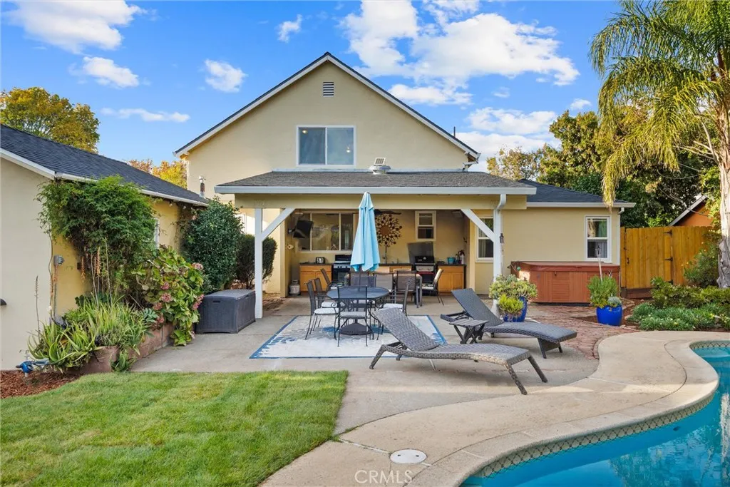 Welcome to this beautifully updated 4 bedroom, 3 bathroom Chico home located in the wonderful Barber district. From the inviting front porch to the remodeled kitchen and original hardwood floors in the dining room and bedrooms, this home blends timeless character with many recent updates. Inside, youll love the extra-large living area and the remodeled kitchen. There is an upstairs bonus room (possible 4ht bedroom!) with its own bathroom. Step outside and discover your very own summer sanctuary built for entertaining! Enjoy a covered patio with a full outdoor kitchen featuring a stove, BBQ, deep sink, TV, speakers, and ceiling fan. Cool off in the inground gunite pool (refinished 3 years ago), unwind in the spa, rinse off in the outdoor shower, or relax by the waterfall feature with plenty of seating for family and guests. The backyard also includes raised garden beds, a lawn area, side yard, shed, sprinklers, and an oversized one-car garage equipped with a utility sink, washer, dryer, shelving, and workspaceplus a long driveway offering plenty of off-street parking. Conveniently located near downtown, restaurants, shopping, and more, The home has just had a brand new roof as well as landscaping with an automatic irrigation!