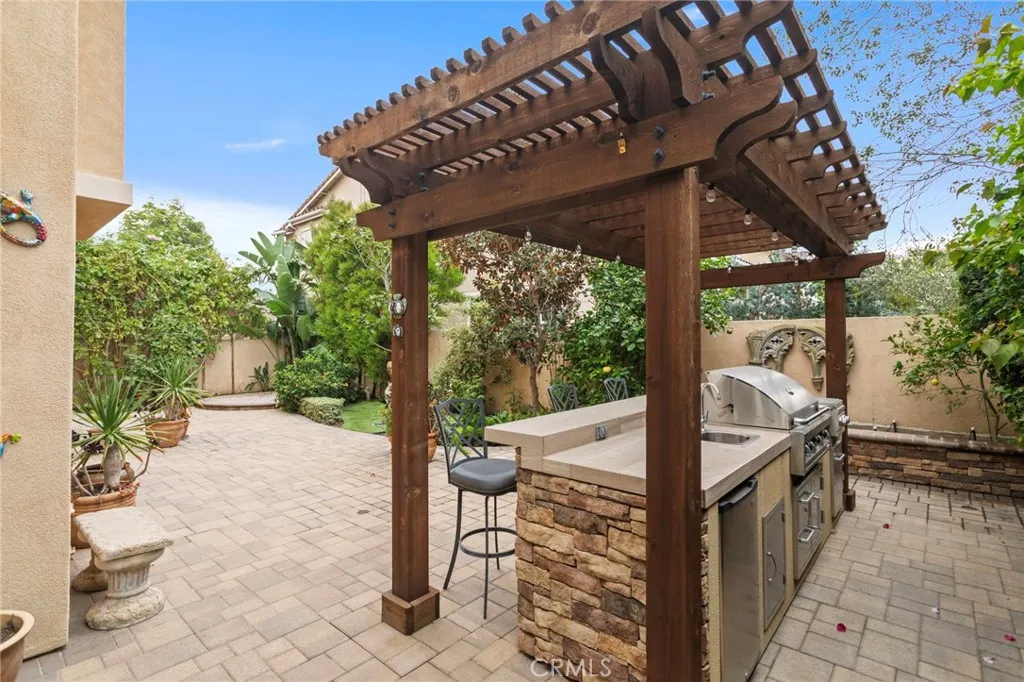 A rare combination of location, luxury, and livability. Nestled within the prestigious guard-gated Armstrong Ranch community, this beautifully appointed home offers sophistication, warmth, and effortless comfort just moments from South Coast Plaza, world-class dining, and the arts. Step inside and discover a design that welcomes both quiet evenings and lively gatherings. The gourmet kitchen is the centerpiece of the home, featuring a generous island with prep sink, granite countertops, stainless steel appliances, three Sub-Zero refrigerators, double ovens, a six-burner range, and a built-in microwave. A cozy breakfast nook and abundant cabinetry provide charm and functionality, while the open flow to the spacious family room with its fireplace and media niche creates the perfect setting for everyday living and entertaining. Entertain elegantly in the formal dining room complemented by a full butlers pantry, ideal for hosting dinner parties. Upstairs, the expansive primary suite serves as a serene retreat with a sitting area, two custom walk-in closets, and a luxurious bath featuring dual vanities, a soaking tub, and a separate shower. Each bedroom has its own private bath, and a main-level bedroom ensures convenience for guests or multigenerational living. A sound-treated room offers flexibility as a fifth bedroom, studio, or workspace. The backyard features beautifully designed landscaping, a charming pergola, a built-in barbecue, and plenty of space for outdoor entertaining, along with a motorized awning with lights. An approximately 140 sq. ft. builder-added flex space,