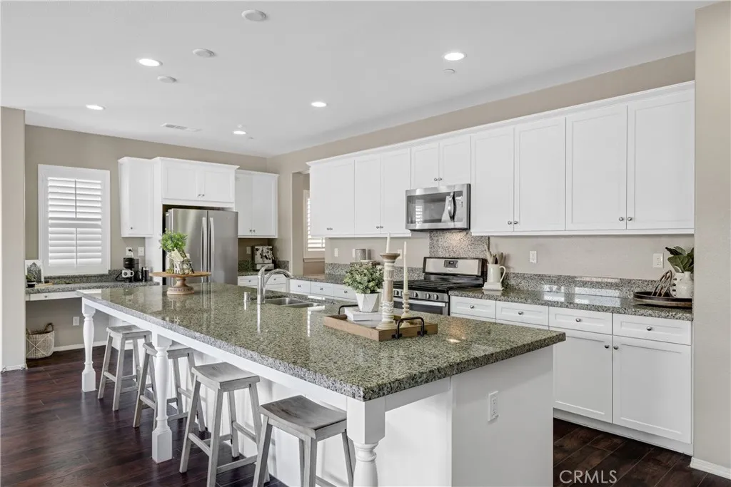 Highly sought-after single level home, ideally located in the prestigious and highly desirable Heritage Lake community, offering the best in resort-like living. The manicured drought resistant landscaping and Spanish influenced stacked stone entry creates a stunning first impression. Step inside and soak in the light filled interior with gorgeous wood laminate floors, a neutral palette, plantation shutters, and recessed lighting throughout the well-designed open concept floor plan, all providing an ideal living environment. The living area is a welcoming gathering space around the fireplace, perfect for relaxing with loved ones. The ample dining space has sliders opening to the back yard patio, a superb indoor-outdoor living area for entertaining. The expansive kitchen is a dream with Granite countertops, timeless White Shaker cabinetry, stainless-steel appliances, prized coffee bar/workspace, and abundance of countertop and storage space, and a huge center island with breakfast bar. The Primary Suite is a peaceful retreat with a roomy primary with gorgeous tile flooring, Quartz topped dual vanity, soaking tub, and oversized step in shower. Two spacious guest bedrooms and a sparkling guest bath complete this superb floor plan. The backyard is a tranquil oasis with easy care landscaping. Additional fine features include a tankless water heater and a convenient indoor laundry room. Just a short walk to Heritage Lake, Heritage Lake Park and local schools. Residents enjoy resort-style amenities including a 7,000 sq. ft. clubhouse, access to a private 25-acre lake for catch-and-