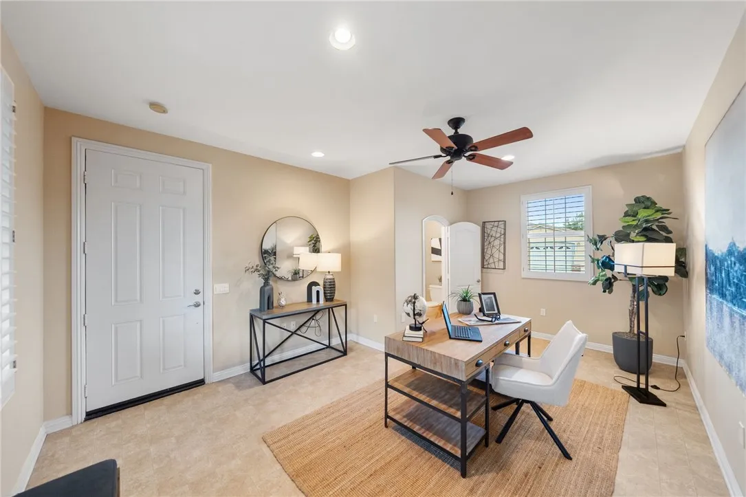 Welcome to Four Seasons, Hemets premier 55+ active adult community offering resort style living surrounded by scenic hills and golf course views. The main home features three bedrooms and two full baths, and the property also includes an attached Casita with its own separate exterior entrance, providing an ideal fourth bedroom + Bath for multi generational living or office space. Inside, the main living spaces offer hardwood floors, crown molding, shutters and recessed lighting. The kitchen includes granite countertops, ample cabinetry and a comfortable layout that opens to the living area. The living room features a custom built in and a warm fireplace, creating an inviting space to relax or entertain. A separate laundry room with a sink and additional storage adds everyday convenience. The backyard is designed for privacy and comfort with a spa and a custom fire pit overlooking the surrounding hills and portions of the golf course. Residents of Four Seasons enjoy an impressive list of amenities including a junior Olympic community pool, a year-round heated spa, clubhouse, ballroom, fitness center with treadmills and ellipticals and a game room. This vibrant community provides an active lifestyle with beautifully maintained grounds and a welcoming atmosphere. Experience resort style living in one of Hemets most desirable 55+ neighborhoods. This home combines comfort, style and exceptional amenities in a peaceful golf course setting.