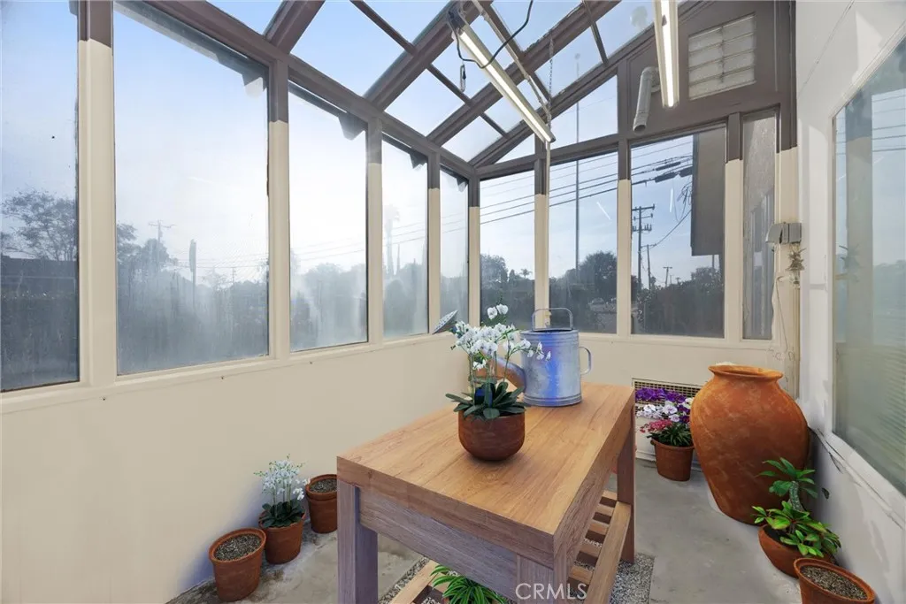 A unique opportunity awaits with this one-of-a-kind corner-lot property showcasing a huge workshop, a thoughtfully designed ADU, and built-in greenhouse that brings indooroutdoor living to life. The greenhouse is conveniently located just off the entry, offering easy year-round access for gardening, complete with drip system, lighting & drainage for effortless plant care. Inside, a show-stopping floor-to-ceiling wrap-around marble fireplace creates a luxurious statement the moment you walk in. Two bedrooms feature built-in cabinetry for sleek organization, while the indoor laundry area also provides abundant storage space. The detached ADU with its own restroom and tiled shower is ideal for guests, rental income, a private office, or multigenerational living. For hobbyists or those needing substantial workspace, the property has a large workshop attached to the garage, complete with shelving. Outdoors is a very large covered patio and a lush, fully landscaped yard.