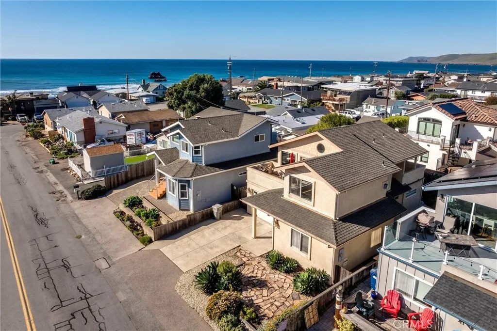 Located near the beach on desirable numbered streets, this ocean-view property offers an articulated silhouette with multiple decks, a sheltered entry, and an ample driveway providing extra parking. The property currently holds a vacation rental license, making it ideal for both personal enjoyment and income potential. A finely crafted entry door opens to a welcoming foyer with access to the garage and lower-level living areas. The garage includes washer and dryer hook-ups. The lower level features three bedrooms and two full bathrooms. One bedroom enjoys a street-facing window with a peek of the ocean, while another includes a sliding door to the rear yard. The upper level boasts vaulted ceilings, expansive glass areas, ocean views, and a convenient half bath. The well-appointed kitchen offers ample storage, quality countertops, and distinctive ceiling details. The living area includes a fireplace and additional ocean-view windows. A rear patio provides north-facing views and a peek of the ocean. An easy-care yard and nearby beach access at 24th Street complete this coastal offering.