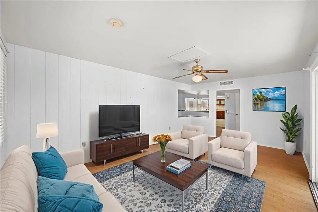 Welcome to this beautifully maintained single-story home in the highly sought-after 55+ community of Sun City Civic Association. With 1,845 sq ft of comfortable living space on a generous 7,840 sq ft lot, this 3 bedroom, 2 bath charmer offers the perfect blend of warmth, function, and lifestyle. From the moment you arrive, you're welcomed by a stunning glass-paned front door and charming curb appeal. Step inside to find ceiling fans thoughtfully placed throughout, adding both comfort and style. The layout features spacious living areas ideal for both relaxing and entertaining. The kitchen is a true standout, offering a double oven, electric cooktop, and a roomy pantryperfect for whipping up meals or hosting holiday dinners. Just off the kitchen, youll find a generous dining space that flows effortlessly into the living area. The primary suite is private and serene, while the secondary bedrooms offer ample space for guests, hobbies, or a home office. With two full bathrooms and plenty of storage, every detail is designed for ease of living. Enjoy an oversized 2-car garage with additional space for storage or a workbench setup. Outside, the large backyard is ready for your personal touchideal for gardening, relaxing, or simply enjoying the Southern California sun. Located in a vibrant 55+ community, the HOA includes access to amazing amenities: two pools, a spa, fitness center, tournament shuffleboard courts, lawn bowling, horseshoe pits, and a wide range of clubs and social events that make every day feel like a getaway. All of this within a mile of grocery stores, restauran