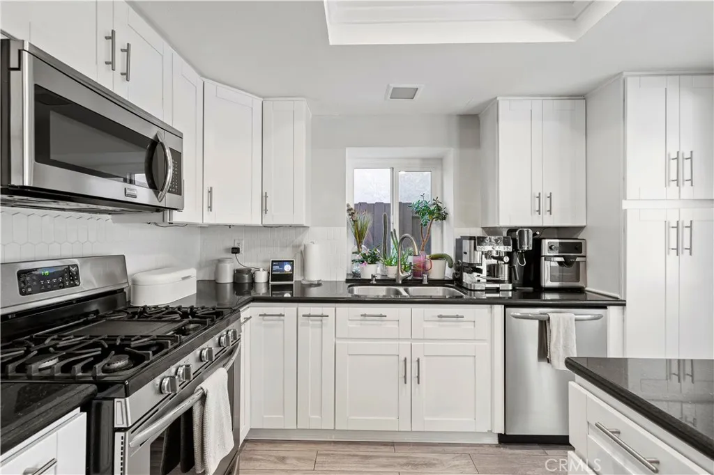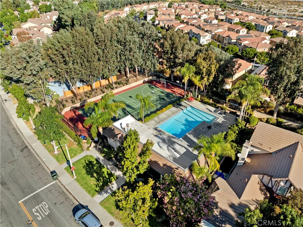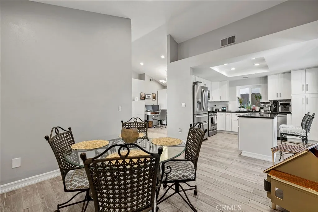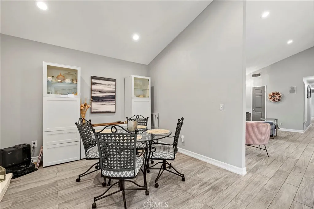 PICTURE PERFECT single-story, traditional charmer on a cul-de-sac with a big manicured yard with peek-a-boo views! You'll love the high ceilings, neutral tones, and updated kitchen and baths, wood plank style tile throughout, and recessed lighting. The kitchen features newer creamy white cabinetry, granite counters, stainless steel appliances, center island breakfast bar, with view of the private yard. The adjacent family room features a white brick fireplace. The spacious living and dining rooms feature vaulted ceilings and picture windows. The primary is ensuite with a remodeled bath with granite counters and decorative tiled shower and a fabulous built-in wardrobe. Two additional bedrooms, one with an open concept closet and built-in Murphy Bed, and an additional bathroom with tile shower are featured. Laundry is also open concept in the hallway and includes beautiful shelving storage. The garage boasts a wall of custom cabinetry. There is also a Quiet Cool whole house fan! The backyard is absolutely beautiful and boasts a luxurious hot tub spa, low maintenance Lawn Kings artificial turf, specimen plantings, WiFi controlled sprinklers, and a brick ribbon patio with a shade bar cover. All front yard maintenance is covered by the HOA. Excellent amenities like four pools, spa, sports courts in the community are nearby. NO MELLO ROOS! This is a fantastic commuter location with access to the 14 freeway and lots of amenities close by. An absolutely turnkey property in a great location lovingly maintained.