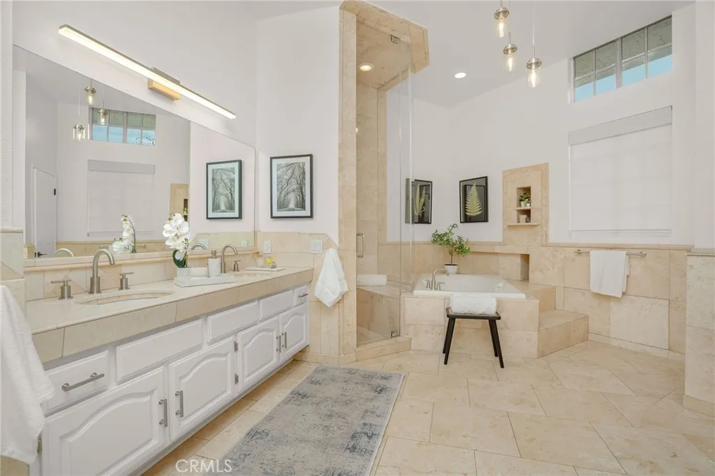 Set in a quiet cul-de-sac in the heart of Agoura Hills, this beautifully refreshed home stands out with a spacious, thoughtful layout, inviting outdoor space, and uniquely versatile primary suite. Updated, charming, and move-in ready, this home is easy to enjoy today and well suited for the years ahead. Fresh paint, carpet, updated lighting, and modern hardware bring a refined feel throughout. The floor plan balances formal and casual spaces with easy flow and plentiful storage. A large entry opens to the living room with high ceilings and a fireplace, leading into the formal dining room and adjacent built-in bar. The centrally located kitchen includes new stainless-steel appliances, ample cabinetry and counter space, a center island, and a bay window overlooking the backyard. A directly connected dining space is ideal for casual meals and conversation while an adjacent family room, with a second fireplace, invites relaxation and gathering. The main level includes a large powder room, multiple storage closets, a laundry room, and access to the three-car garage with new epoxied floors. A downstairs guest suite with private backyard access adds flexibility for guests, a playroom or a home office. Upstairs are three generously sized bedrooms, including one with a cozy built-in window seat. A Jack-and-Jill bathroom connects two bedrooms and opens to the hallway for easy access from the third. A loft-style nook creates a great space for study, hobbies, or play. The primary suite is a standout feature, offering far more than a typical bedroom. Double doors open to a spacious sitt