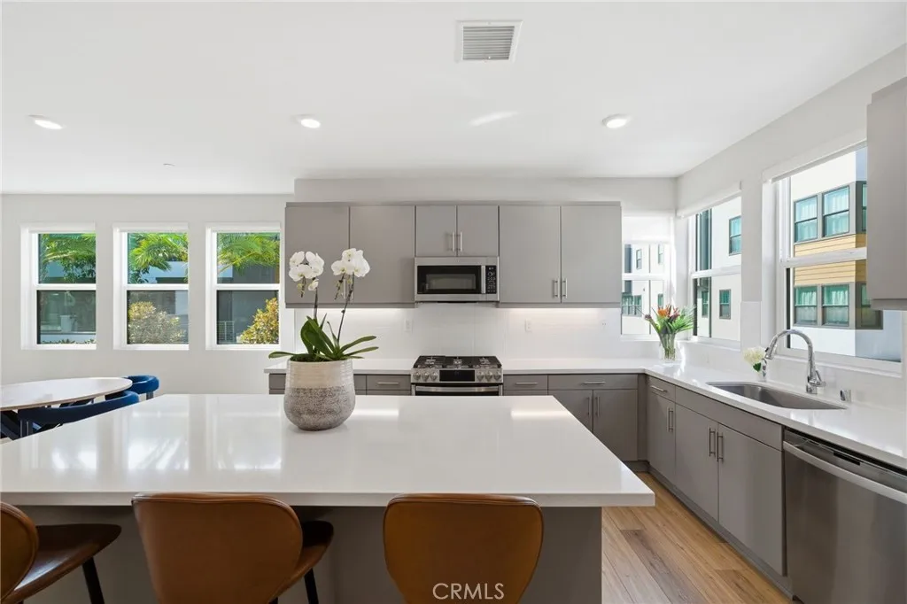 Welcome to this beautifully upgraded modern townhome built in 2022, offering approximately 2,144 square feet of thoughtfully designed living space. With four bedrooms and three-and-a-half bathrooms, this home blends contemporary style with everyday functionality. As a premium end-unit in the desirable ParkerOne community, it boasts one of the best locations in the neighborhood. Its corner position allows for abundant natural light and serene views overlooking the community pool, creating a bright, airy, resort-like feel. The main level features a private bedroom with a walk-in closet and en-suite bathideal for guests or multigenerational living. The attached two-car garage includes epoxy flooring and custom cabinetry for a clean, functional finish. Upstairs, the open-concept second level is perfect for living and entertaining. The gourmet kitchen includes stainless steel appliances, ample counter space, a walk-in pantry, and a large island. It flows seamlessly into the dining and living areas, complete with a dual built-in workspace and access to a private balcony. The third level offers a spacious primary suite with an en-suite bath, along with two additional bedrooms and a full bathroom. On the fourth level, a versatile nook opens to a private rooftop deckideal for relaxing or entertaining. Additional highlights include durable laminate flooring, custom built-ins, fully owned solar panels, over $150,000 in upgrades, and all appliances included. Conveniently located in Orange with easy access to major freeways, shopping, dining, and entertainment.