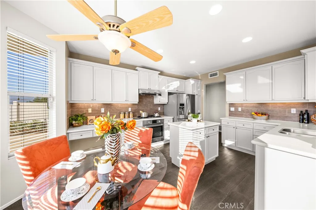 Welcome to 7 Hollyleaf in the Canyon Vistas community of Aliso Viejo. Recently updated with fresh paint and featuring wood-grain porcelain tile flooring throughout, this home offers a spacious, open floor plan. The entry opens into a formal living and dining area defined by two-story ceilings, a central chandelier, and plantation shutters. Toward the back of the home, the kitchen includes a center island with a raised bar, ample cabinetry, and a breakfast nook detailed with a ceiling fan. This space flows directly into the family room, which features a fireplace, LED recessed lighting, bay windows, and a glass door leading outside. A convenient main-floor bedroom and an adjacent full bathroom complete this level. Upstairs, the primary suite is situated to maximize the canyon and city light views. It features a walk-in closet and an en-suite bathroom with dual vanities, a separate oval soaking tub, a bidet, and a glass-enclosed shower. The suite also includes a large retreat area with dimmable recessed lighting, which can easily be converted into a fifth bedroom. The second floor is completed with the remaining two bedrooms, a generously sized secondary bathroom offering dual sinks and a tub/shower enclosed with glass doors and a dedicated laundry room. Transitioning outside, the backyard is thoughtfully designed to capture the propertys expansive canyon, sunset, and city light views, stretching as far as the Saddleback Mountains. The grounds feature low-maintenance xeriscape landscaping, mature citrus trees, and fragrant roses. A newly added second-floor patio deck provides