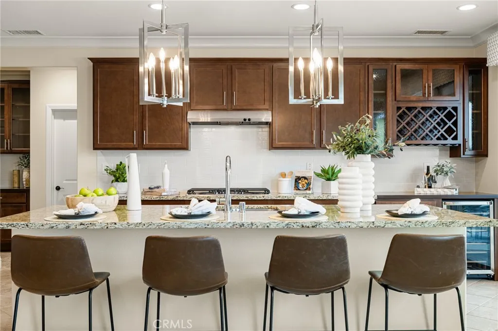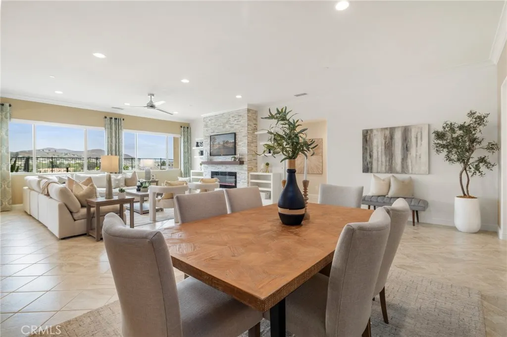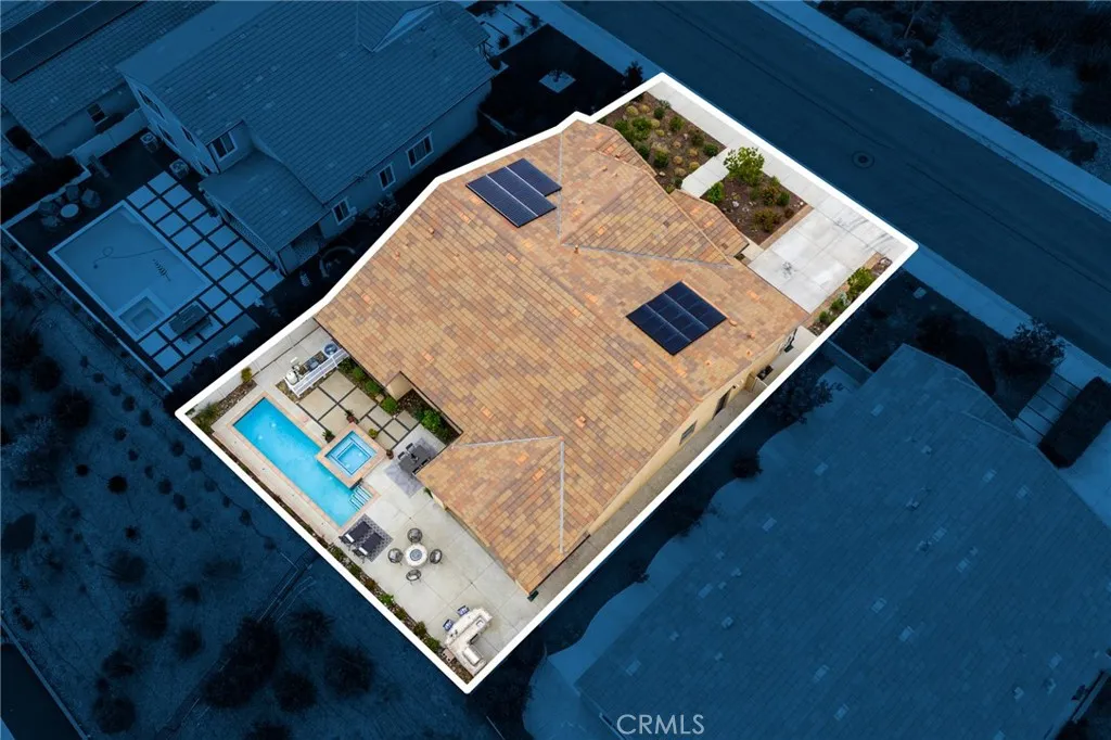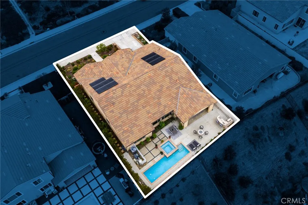 A luxury pool home awaits you in the gated community of Province at Audie Murphy Ranch, in Menifee, boasting hundreds of thousands in designer upgrades and breathtaking mountain views. This one-of-a-kind home offers 4 bedrooms, 2.5 baths, an office, owned solar plus Tesla battery, a 30' x 8' lap pool, a 7' square 10-person spa, Govee lights and extra electrical throughout the home. The exterior of this ranch style property boasts drought tolerant landscaping and custom steps up to the quaint porch overlooking the hillside. A beautiful custom glass front door and retractable screen greet you into the home offering tall ceilings, tile floors, custom paint, recessed lighting, crown molding, custom window coverings throughout and a highly desirable floor plan. Off the entrance of the 3100 sqft property are two large secondary bedrooms with walk-in closets, one with a built-in bookshelf which share a secondary bath featuring dual sinks and a shower tub combo, that sits across from a powder bath. A junior suite offers an extra-large bedroom with a massive walk-in closet, built in bookshelves and would be the perfect game room. The Great Room features a custom stone fireplace with heat protected floating mantel, built-in open cabinets and floating shelves and large view windows. The dining room offers a quiet cool whole house fan. The gourmet kitchen features granite counters, subway tile backsplash, an eat-up island, stainless steel appliances, wine fridge, wine rack and large walk-in pantry with extra shelves built-in. Behind the kitchen is an open office boasting a shiplap wall