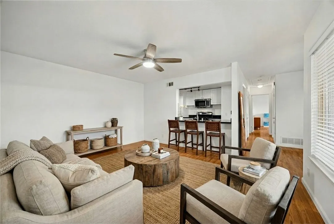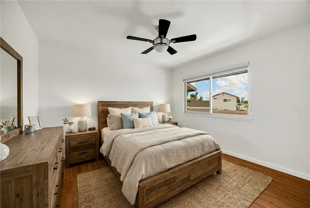 Welcome to this beautifully updated 2-bedroom, 1-bath upper-level corner unit in the highly desirable Broadmoor community in Placentia. With no neighbors below, this home offers exceptional privacy and a peaceful living environment surrounded by lush landscaping and mature trees. Step inside to find wood-look laminate flooring throughout, with added waterproof protection in the kitchen and bathroom. The remodeled kitchen and bathroom cabinetry provide a fresh, modern feel, while dual-pane windows enhance energy efficiency and comfort. The home also features a newer A/C unit (approximately 67 years old) to keep you comfortable year-round. Get ready to store plenty of extras in your attic with a pull down ladder. Attic has had plywood added for convenience of storing items. Enjoy your spacious private balcony, perfect for relaxing or entertaining. The 4-burner gas range and oven make home cooking a breeze. Additional highlights include a one-car garage with extra storage space and convenient proximity to the community laundry area. The Broadmoor community is known for its well-maintained grounds, greenbelts, and inviting amenities, including a swimming pool and peaceful walking paths. The HOA offers exceptional value with low monthly dues covering water, trash, and earthquake insurance. Located within the highly regarded Placentia, Yorba Linda Unified School District, this home is ideal for a variety of lifestyles. Its prime location near the 57 freeway provides easy access to Cal State Fullerton, Brea Mall, local dining, shopping, and nearby parks such as Tri-City Park. Move
