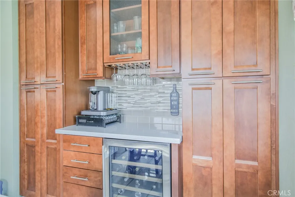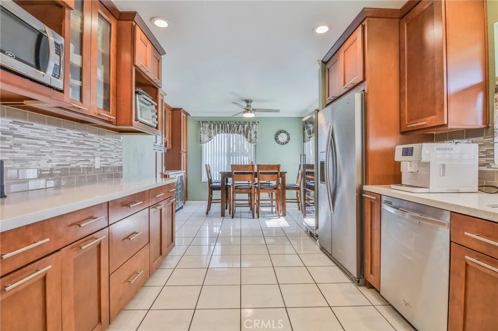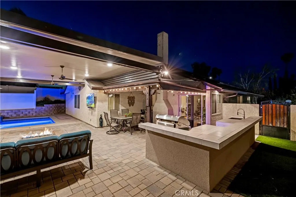 Nestle in the desirable Valencia community, this well-maintained single-family residence offers 3 bedrooms 3 baths, and appoximately 2,083 square w feet with of throughtfully designed living space. A gated front entry welcome you with manicures landscaping, creating an inviting first impresion. Inside, the home opens to a bright and spacious living area featuring clean tile flooring at the entrance, and warm laminate floors throughout the main living space, enhanced by abundant natural light. The Kitchen is positioned to the left of the home and offers generous functionality with ample cedar cabinetry, quarts countertops, a stainless-steel-faucet, and dedicated space for dinning. Additional features include a breakfast bar and a built-in wine refrigerator, making it ideal for both everyday living and entertaining. The right wing of the home has been fully remodeled and includes a comfortable family room, three bedrooms with walking in closet, and a dedicated office space. One bathroom is conveniently designed with dual access between two bedrooms, while the primary suite offers privacy with is own bath, featured with dual sinks, a separate enclosed shower and toilet area, and an expansive walk-in- closet. The primary bedroom also showcases a custom ceiling design and upgraded lighting. The back yard is designed for relaxation and entertainment, accessible through sliding glass doors. Enjoy a fully equipped outdoor space complete with a built-in barbecue, patio furnishings, a swimming pool with waterfall features, and retractable awing controlled via mobile divice. The surro