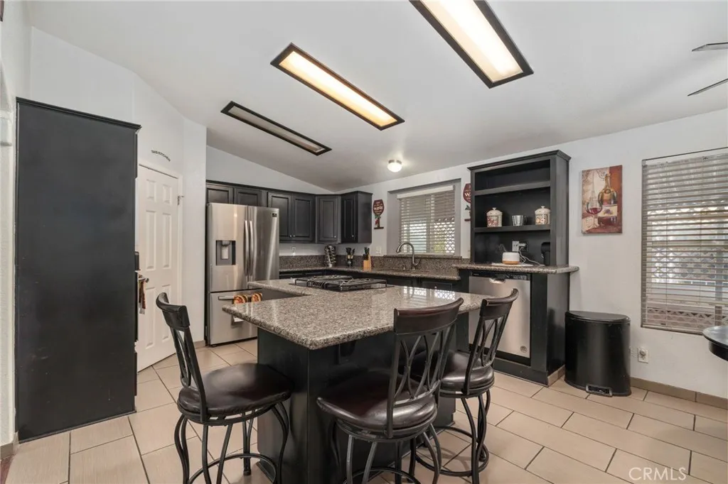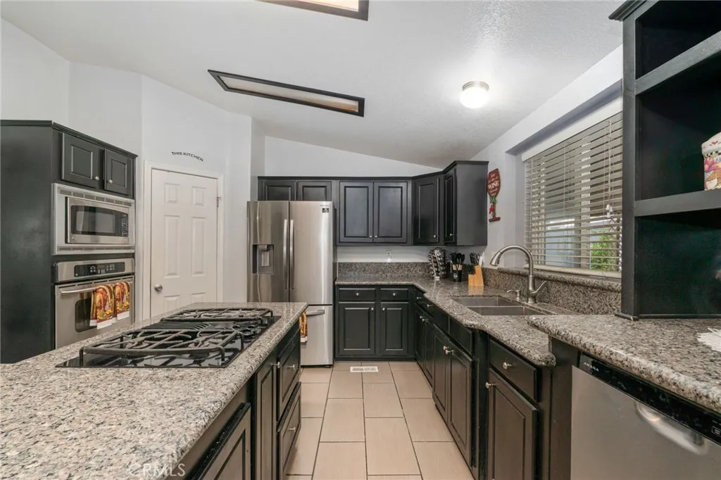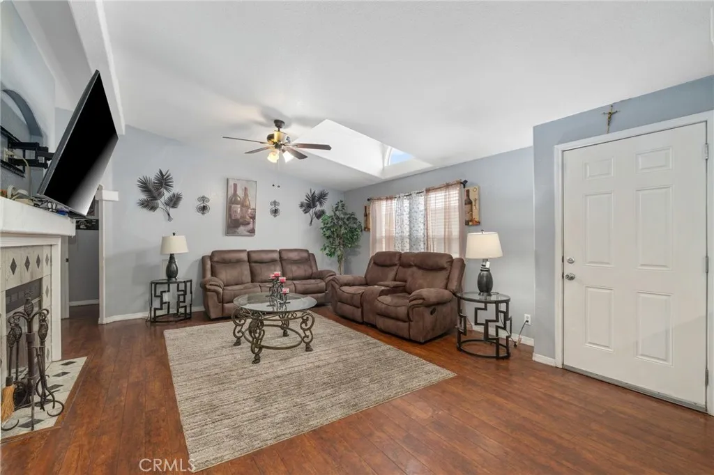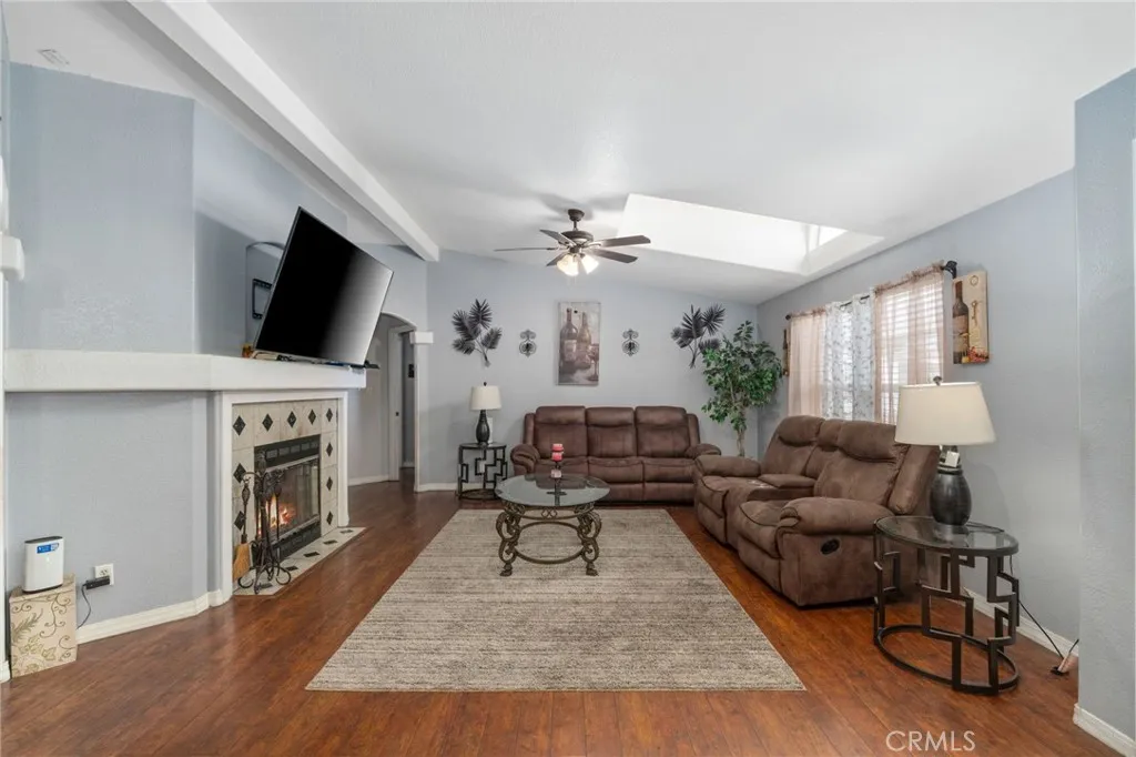 Welcome to this beautifully maintained mobile home located in the desirable Capri Estates all-age community at 16860 Slover #54, Fontana. From the moment you step inside, youre greeted by a spacious living room featuring a tiled wood-burning fireplace, ceiling fan, and a skylight, perfect for relaxing or entertaining. As you move through the home, youll appreciate the elegant archways that lead into the kitchen. The kitchen is thoughtfully designed with mocha brown cabinetry, granite countertops, an extra-deep dual stainless-steel sink with a modern faucet, a built-in oven and microwave, dishwasher, and a stainless-steel refrigerator. The L-shaped center island is ideal for cooking and gathering, featuring a cooktop, additional counter space, and a breakfast bar for casual dining. A walk-in pantry and tiled flooring complete this functional and stylish space. Adjacent to the kitchen is a separate dining area with a ceiling fan, perfect for hosting meals. The home also offers a convenient indoor laundry room with a washer and dryer included, a utility sink, storage cabinets, and direct access to the carport. The spacious primary bedroom features an ensuite bathroom with a dual-sink vanity, walk-in closet, separate glass-enclosed shower, and a relaxing soaking tub. On the opposite side of the home, youll find two additional bedrooms and a secondary bathroom, ideal for family or guests. Additional features include ceiling fans in all bedrooms, a newer roof replaced within the past couple of years, and a fully gated perimeter for added privacy. The long driveway and storage con