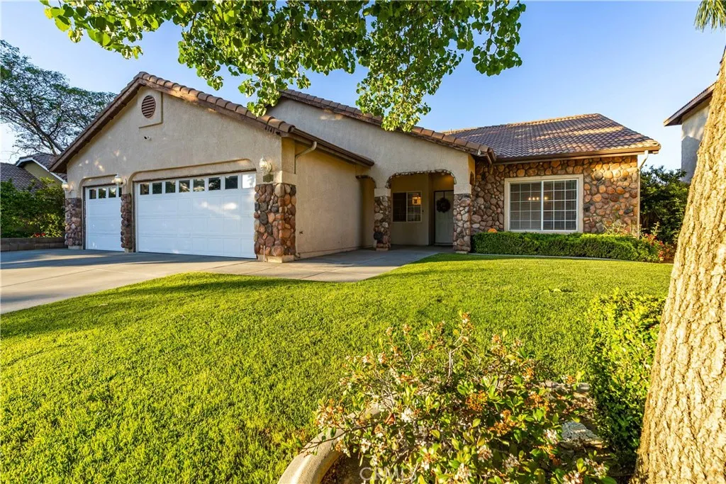 ***LIVE BEAUTIFULLY*** Single Story Palmdale Home w/ A 3 Car Garage, No Rear Neighbors, And Gorgeous City Light Views! Step inside to a bright and airy formal living and dining space featuring vaulted ceilings, an open-concept feel, and an abundance of natural light. The home boasts upgraded flooring throughout and stylish modern pendant lighting that elevates the entire space. Enjoy a cozy family room with a fireplace that opens seamlessly to the kitchen and backyard, perfect for both relaxing and entertaining. The kitchen offers a functional layout with a center island, bar seating, upgraded custom cabinetry, and ample storage, along with custom built-ins throughout the home for added convenience. Retreat to the spacious primary suite complete with high ceilings, a large walk-in closet, and a spa-like bathroom featuring a soaking tub and a separate enclosed glass shower. Bathrooms include dual vanities, adding both comfort and functionality. Step outside to a beautifully designed backyard showcasing an expansive covered patio with extended concrete hardscaping, ideal for outdoor dining and gatherings. The yard also features mature landscaping and a combination of block wall and wrought iron fencing that provides privacy while still capturing the stunning city light views. With no rear neighbors and an elevated setting, this home offers a peaceful outdoor retreat with plenty of space to relax or entertain. The front yard is just as inviting, featuring lush green grass and large mature trees that create beautiful curb appeal and a welcoming first impression. A rare single s