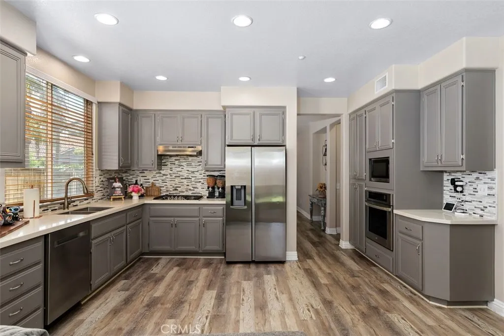 Welcome to refined living in the highly sought-after Montecito Gated Communitywhere comfort, style, and privacy come together in this beautifully reimagined residence with a spacious loft. Offering four generously sized bedrooms plus versatile loft, this home is thoughtfully designed to accommodate both everyday living and effortless entertaining. From the moment you enter, youll notice the bright, open layout that creates a warm atmosphere. The heart of the home is the expansive kitchen, which flows seamlessly into the family roomperfect for gathering with friends or enjoying quiet evenings in. Outfitted with sleek quartz countertops, stainless steel appliances, and ample cabinetry, this space is as functional as it is stylish, ideal for both casual meals and culinary creativity. For more formal occasions, separate living and dining areas provide an elegant setting, enhanced by large windows that invite in natural light and highlight the homes tasteful design details, including durable vinyl wood flooring that adds both charm and practicality. Each of the four bedrooms offers comfort and flexibility, complete with soft carpeting, one with vinyl, and generous closet space. The loft area adds even more versatilitywhether you need a home office, media room, or a quiet retreat, this bonus space adapts to your lifestyle. Additional highlights include a newer, high-quality HVAC system, ensuring year-round comfort and energy efficiency. Living within Montecito means enjoying a secure, gated environment with beautifully maintained grounds, scenic walking paths, and a welcoming nei