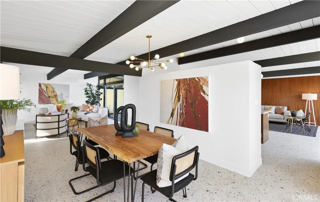 Welcome to this incredible Joseph Eichler Model LJ-124 home located in one of the most sought-after, tree lined neighborhoods in Orange County. This spacious 4-bedroom 2 bath residence spans 1973 sq ft blend of modern comfort and functional design. The apprx 400 sq ft sky-view open air atrium offers additional living space year round (see Matterport floor plan). Tucked on a quiet street, this excellent-condition Eichler honors everything mid-century modern lovers crave: huge lot, abundant natural lighting, clean lines, walls of glass & signature Eichler atrium blurring indoor/outdoor living. Home features post-&-beam architecture, tongue-&-groove ceilings w/exposed beams, iconic globe lighting & original brick fireplace. Sep dining & chef-inspired kitchen w/large peninsula, pantry, generous storage. All new custom designed and Eichler inspired mid century cabinetry throughout kitchen, laundry and bathroom vanities. Kitchen thoughtfully designed with custom quartz counters, soft close and stainless steel premium appliances, bespoke refrigerator. This model retains a unique central air and heating system. Designer int/ext premium paint, new terrazzo tile flooring throughout. Fully renovated bathrooms, plumbing and premium finish Khohler fixtures. Recently updated roof w/ sky lights throughout. Light-filled living rm, Indoor laundry for full-size W/D. Flexible bonus/office rooms, primary suite w/ large walk-in closet, frameless glass shower and direct backyard access. Newly landscaped backyard perfect for entertaining with a unique seamless in/outdoor flow. Nothing spared in t