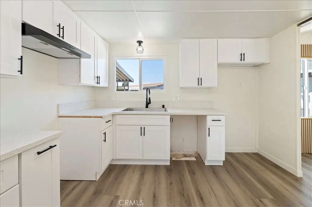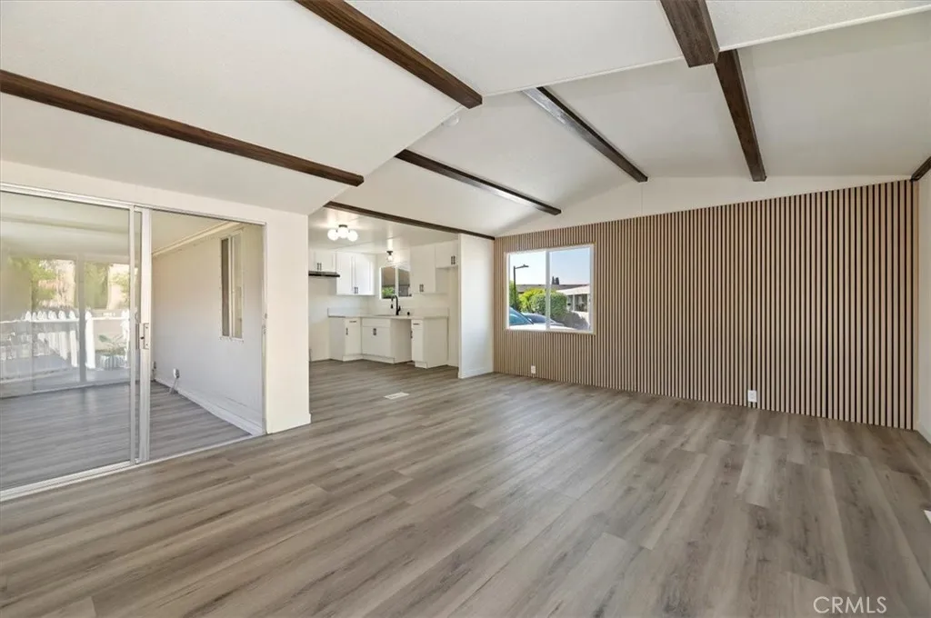 Welcome to the finest home in the highly sought-after Western Skies Mobile Home Park! This 2-bedroom, 1-bathroom residence has been meticulously transformed from top to bottom, offering high-end designer finishes and a modern aesthetic that rivals any new build in Anaheim. Step inside to an open-concept living space flooded with natural light. The vaulted ceilings are accented by striking dark wood beams, creating a perfect contrast against the crisp white walls and contemporary wide-plank flooring. The living room features a custom vertical wood slat accent wall, providing a sophisticated focal point for your entertainment area. The chef-inspired kitchen is a showstopper, featuring bright white shaker-style cabinetry with matte black hardware and elegant quartz countertops and a modern subway tile backsplash. In addition to the two spacious bedrooms, this home features a massive bonus roomperfect for a home office, gym, or second living area. The home also includes the rare convenience of a dedicated separate laundry room, ensuring your chores stay tucked away. While most mobile homes offer little more than a small patio, this property boasts a huge, private grassy yard! Fully fenced with a charming white picket border, its the ultimate space for pets, gardening, or weekend BBQs