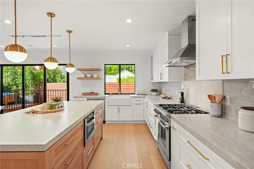 Situated on a quiet tree-lined street in one of Encino's most coveted neighborhoods, this turnkey single-story home has been beautifully remodeled and completely reimagined. Natural light floods the open-concept floor plan, highlighting the wide-plank European oak hardwood floors and lofty ceilings found throughout. At the heart of the home, the designer chefs kitchen features a stunning 8 foot wide Taj Mahal island, bespoke cabinetry and top-of-the-line Bosch appliances. Thoughtfully designed for both everyday living and effortless entertaining, the kitchen flows seamlessly into the spacious living and dining room. A chic bar area with a beverage fridge adds an extra touch of convenience, while oversized sliding glass doors open to reveal a walk-out deck, expanding your living space outside for a seamless indoor-outdoor living experience. Mature ficus trees provide privacy to the serene backyard retreat, which is complimented by low-maintenance artificial turf. The home offers three generously sized bedrooms, highlighted by a luxurious primary suite that boasts a custom walk-in closet and spa-inspired bathroom, complete with a soaking tub, glass-enclosed rainfall shower, double vanity and smart toilet. Additional features include a stylish powder bathroom, state-of-the-art security system, Ecobee smart thermostat, high-efficiency 5-ton heat pump system, brand-new aluminum windows, a two-car garage with epoxy flooring and premium fixtures throughout. Located within the top-rated Hesby Oaks School District, this property is just moments from Ventura Boulevards renowned shops