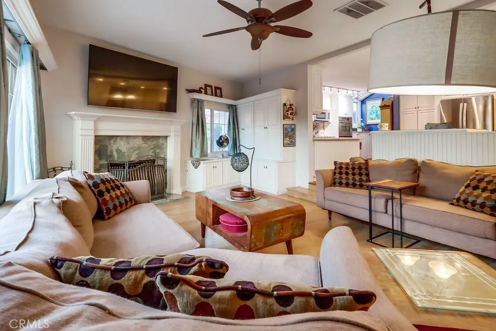 Thoughtfully designed Lakewood home with open floor plan with almost 2600 sq ft of living space. This home is an entertainer's dream with living room, family room, space for a formal dining room table and al fresco dining out back. The huge chef's kitchen features crisp white cabinetry, double oven, recessed lights, stainless steel appliances, ample storage space with office / workspace. The adjacent family room with additional built in storage is perfect for cozy movie nights by the fire. Two bedrooms downstairs with a full bath and large laundry room. Upstairs there is a private suite with three closets, huge bathroom with a relaxing shower area and a private balcony. Step out back to your own private oasis which boasts a sparkling swimming pool and charming covered cabana area with space for both a sitting area and dining area. Garage is being used for storage and is conveniently located near the swimming pool - perfect for water toys and party supplies or as a potential ADU with its own access. Inside laundry and air-conditioning add to the list of amenities. This house has it all and is located in one of the most sought after neighborhoods of Lakewood, walking distance to summertime Concerts-in-the-Park at del Valle Park, excellent schools, shopping, and nearby access to 405 & 605 freeways.