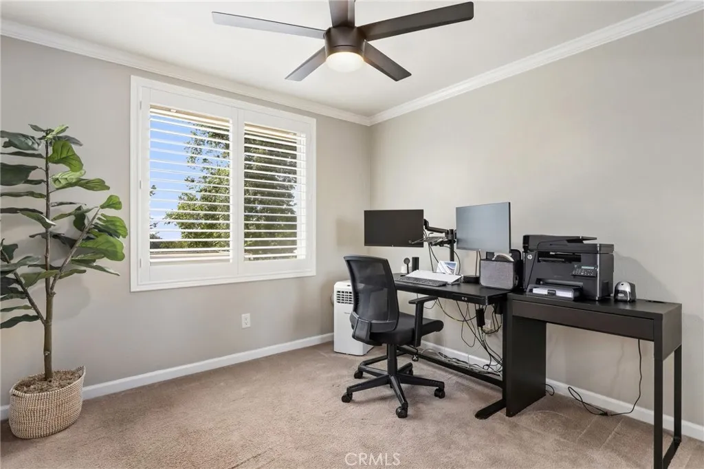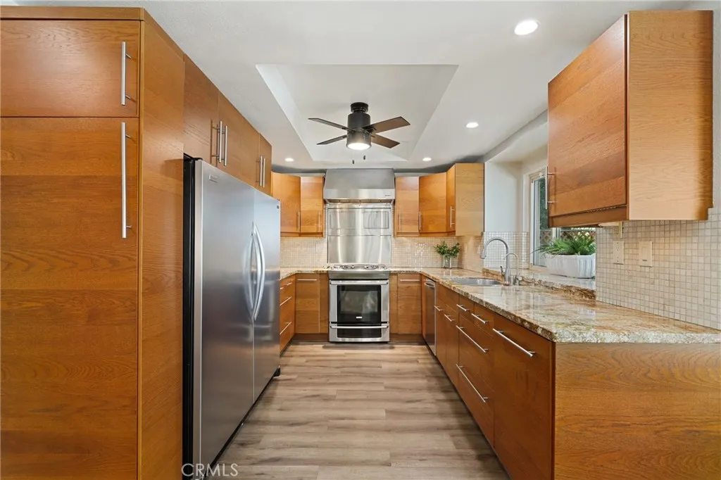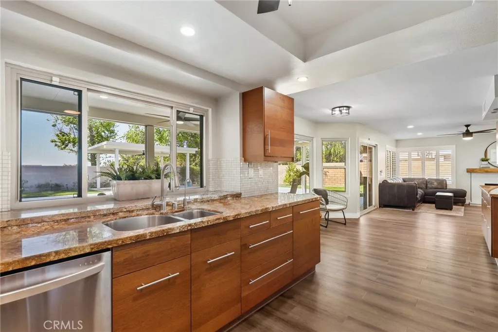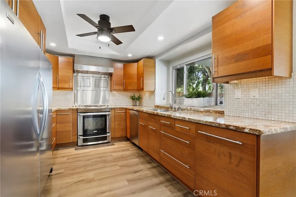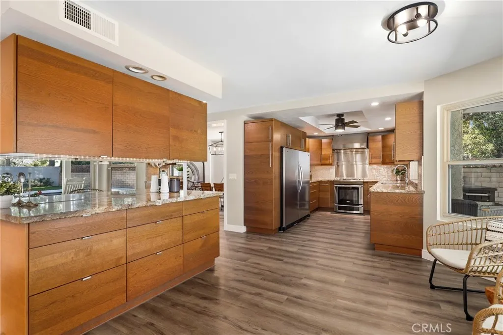 Nestled in a quiet, highly desirable neighborhood of Upland, this beautifully upgraded pool home offers the perfect blend of comfort, style, and functionality. From the moment you arrive, the stunning curb appeal, spacious 3-car garage, and wide drivewaycomplete with RV potentialset the tone for what awaits inside. Step through the front double door entry to soaring vaulted cathedral ceilings and an inviting formal living and dining area, filled with natural light and enhanced by updated lighting fixtures and ceiling fans throughout. The main level showcases attractive luxury vinyl flooring and a thoughtfully designed floor plan, including a charmingly updated guest bathroom. At the heart of the home is the upgraded kitchen, featuring stainless steel appliances, a built-in refrigerator and freezer, a cozy breakfast nook, and a convenient built-in buffet counter offering abundant storage. The kitchen flows seamlessly into the family room, where a warm gas fireplace and custom built-in desks create a perfect space for relaxing or working from home. Both rooms overlook the serene backyard, creating a true indoor-outdoor connection. The backyard is a private retreat, complete with a beautifully updated pool and concrete decking, two covered patio areas, a lush lawn, mature fruit trees, and plenty of space for entertaining or unwinding in peace. Upstairs, the oversized primary suite offers a luxurious escape with its own gas fireplace, generous closet space, and an updated en-suite bathroom featuring dual sinks, a large walk-in shower, and a separate soaking tub. Three additiona