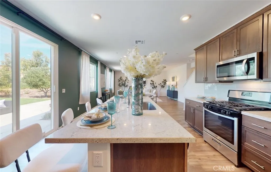 FORMER MODEL HOME on a premium corner lot in the highly desirable Audie Murphy Ranch community. Located on a premium corner lot, this beautifully designed 5-bedroom, 3-bath home offers nearly 3,000 sqft of open, light-filled living space, including fully PAID-OFF SOLAR, providing long-term energy efficiency and savings on utility costs. From the moment you step inside, the home feels elevated yet welcoming, with wide-plank flooring, clean architectural lines, and a layout that flows naturally from one space to the next. The main living area connects seamlessly to the dining space and kitchen, creating a comfortable environment for both everyday living and entertaining. At the center of the home, the kitchen features a large island, abundant cabinetry, and direct access to the backyard through sliding glass doors, enhancing indoor-outdoor flow. Upstairs, a spacious loft provides flexible use as a second living area, office, or media space. The primary suite is generously sized and filled with natural light, while additional bedrooms are well-proportioned to accommodate a variety of needs. Originally designed as a model home, the property reflects upgraded finishes and a thoughtfully planned layout throughout. The backyard offers a low-maintenance outdoor space, and the corner lot location provides additional openness and privacy. Residents of Audie Murphy Ranch enjoy access to resort-style amenities including pools, spa, parks, BBQ areas, and recreational facilities. A well-designed home that offers comfort, efficiency, and long-term value in one of Menifees most sought-afte