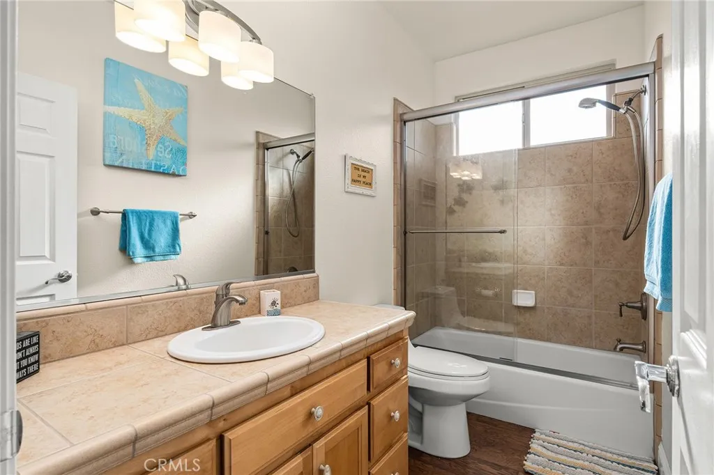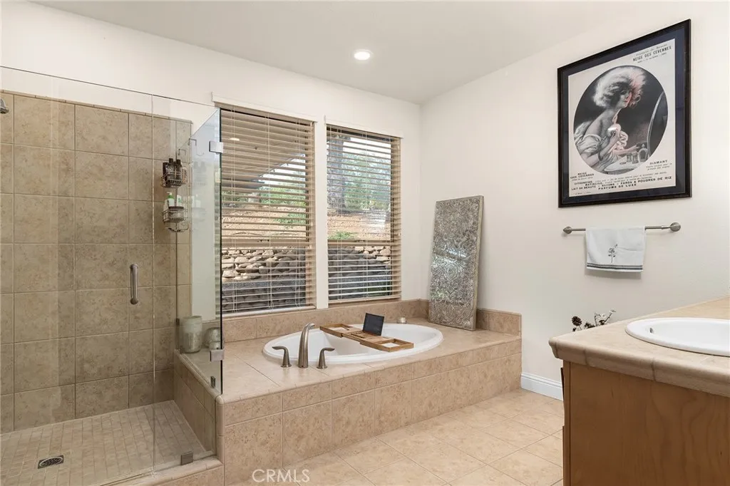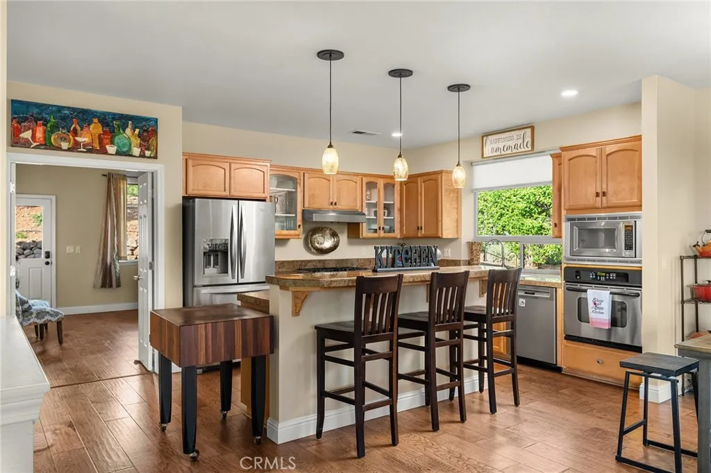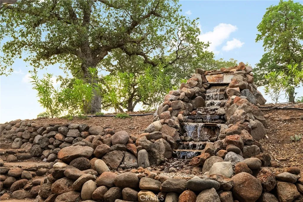 Welcome to Canyon Oaks where you can find this beautifully maintained home in a luxury golf communitywhy mow the lawn when you can go golfing instead! Fresh exterior and interior paint enhance this inviting 3 bed, 2 bath residence with a low-maintenance yard and exceptional outdoor living. Enjoy a raised front patio with hillside views, plus a private backyard retreat featuring a stunning waterfall cascading down the slope, stamped concrete, a spacious firepit area, and a pavilion with bistro lighting and smart-controlled lighting systems for effortless ambiance. Inside, the open floor plan showcases engineered wood flooring throughout the main living spaces. The family room offers warmth with its gas fireplace, raised hearth, built-in bookshelf, oversized windows framing the outdoor scenery, and a smart lighting system for customizable comfort. The kitchen is a chefs delight with a generous island, abundant honey-toned cabinetry, granite counters, and a built-in gas stove. Off the kitchen is a large bonus rooman ideal flex space limited only by your imaginationwith direct access to the backyard oasis. A spacious laundry room with extensive storage and a sink sits conveniently nearby. Guest bedrooms are thoughtfully positioned with a shared bath, while the private Primary Suite features double-door entry, a large walk-in closet, backyard access, and a spacious bath with walk-in glass shower, soaking tub, double vanity, and oversized window. The downstairs garage offers two-car parking plus workshop or golf cart space, measuring approx. 28.5' wide by 20' deep with a 16' x 8'
