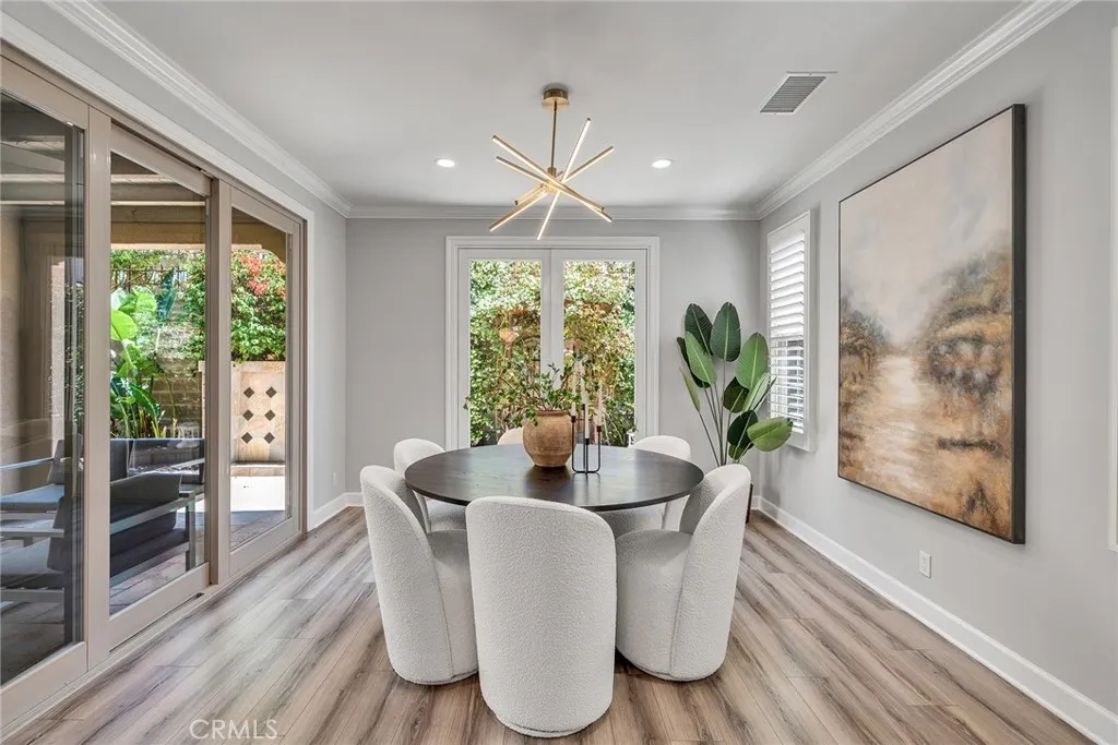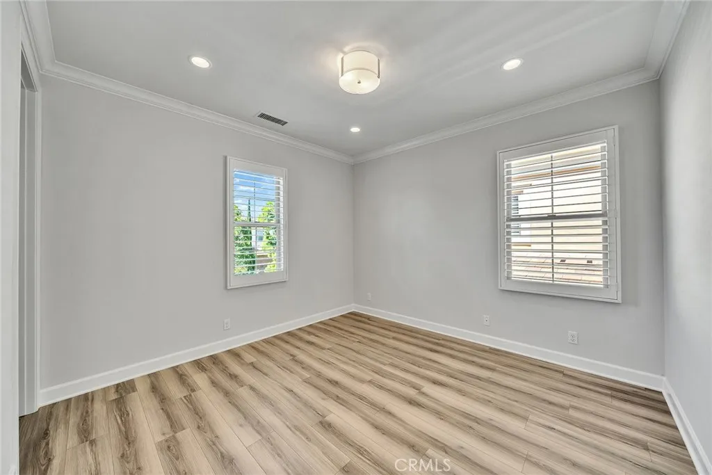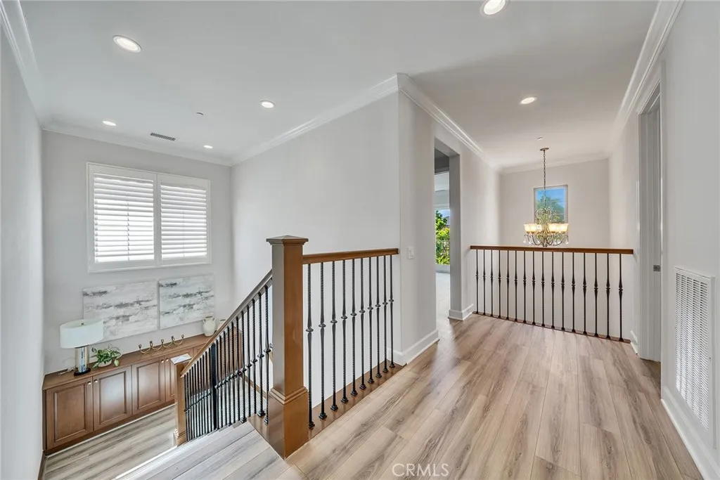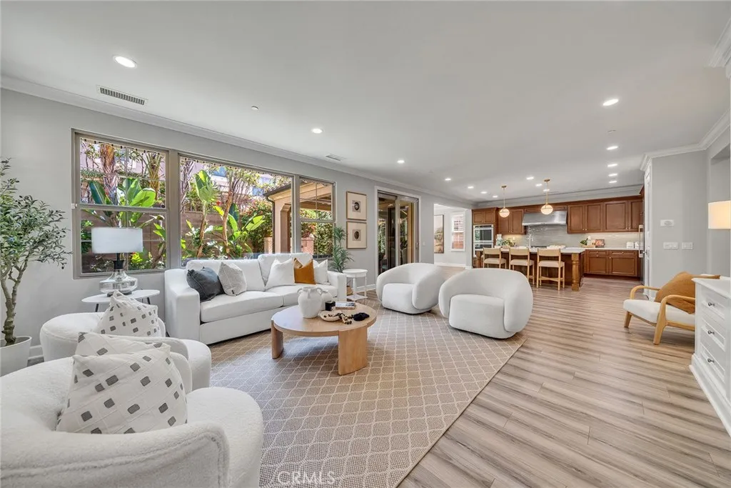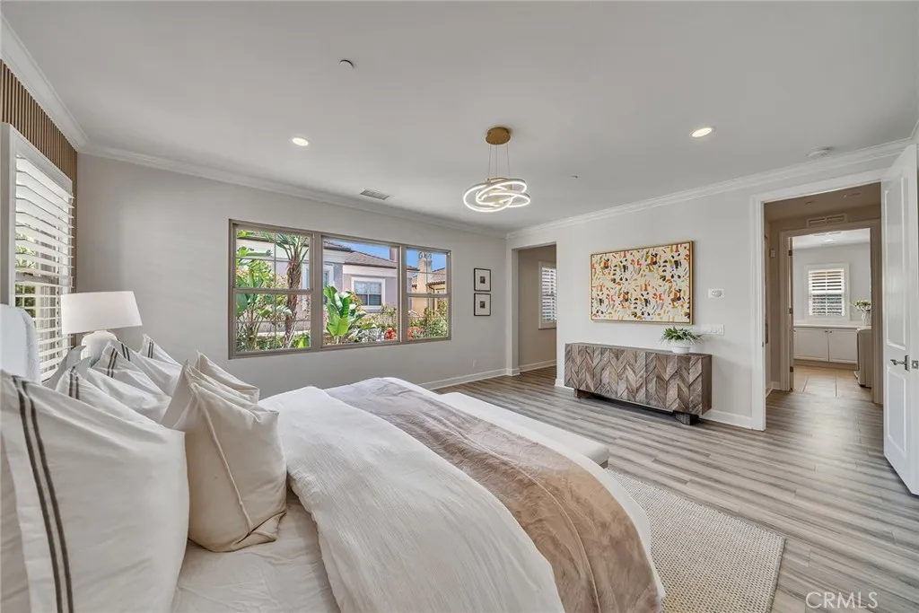 Welcome to 80 Rossmore a beautifully upgraded 4-bedroom, 4-bathroom home with a spacious loft, nestled in Irvine's prestigious Stonegate community. The expansive open-concept floor plan is designed for both comfortable everyday living and effortless entertaining. The gourmet kitchen is a true showstopper, featuring wood recess-panel cabinetry, granite countertops with a designer backsplash, a professional 6-burner gas cooktop with griddle, elegant pendant lighting, and a generous walk-in pantry. It flows seamlessly into the dining room and great room anchored by a cozy gas fireplace and extends out to the bright California room and a delightful backyard perfect for gatherings or quiet relaxation. A main-level bedroom and full bath provide ideal accommodations for guests or multi-generational living. Upstairs, brand-new luxury laminate flooring sets a fresh tone throughout. A versatile loft offers endless possibilities as a media room, office, or play space. Two additional en-suite bedrooms ensure privacy and comfort, while the expansive primary suite impresses with dual quartz vanities, a glass-enclosed shower, soaking tub, and a custom walk-in closet with built-in cabinetry. Both the downstairs bedroom and primary suite have been thoughtfully remodeled with designer wood slat accent walls, adding warmth and architectural character to each space. Additional highlights include a fully paid-off solar system for significant energy savings, a brand-new full-size refrigerator, and a whole-home water softener making this a truly turnkey opportunity. Stonegate residents enjoy