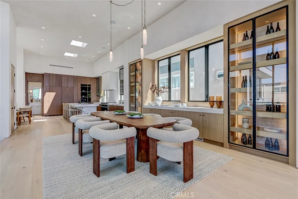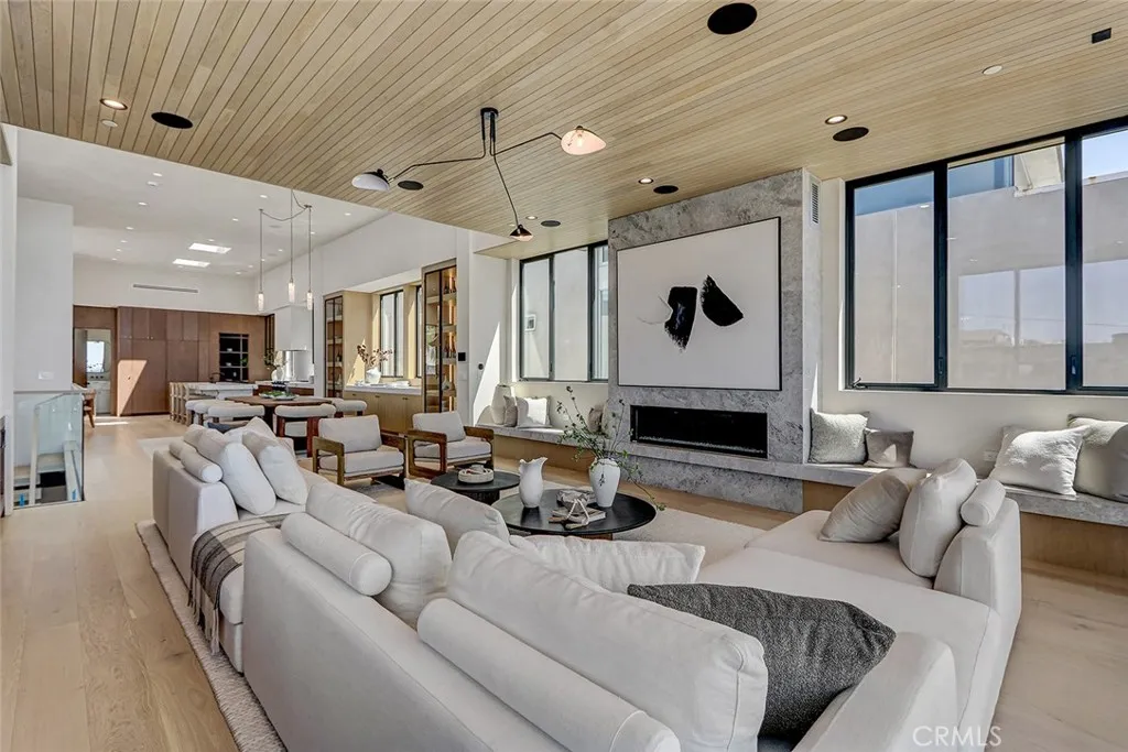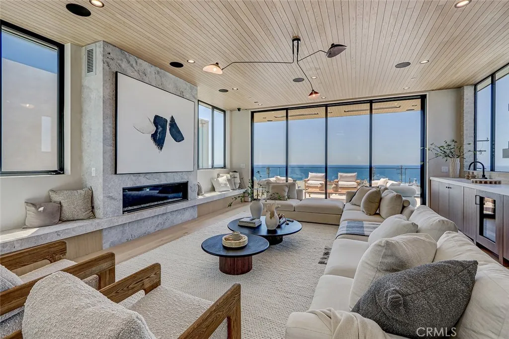 Welcome to 1404 Manhattan Avenuean exceptional coastal residence just five homes from the ocean and two blocks from premier dining and shopping. Offering approximately 4,274 square feet (BTV), the home features five bedrooms, five-and-a-half baths, and a versatile recreation room, combining scale, design, and rare on-site parking in the Sand Section. Developed by TriWest, built by Pillar Construction and Designed by Kate Lester, the entry opens through a custom steel door into a refined foyer with stone detailing. The primary suite is a private retreat with a fluted stone fireplace, 10-foot ceilings, ocean views, and a spa-like bath with full-slab shower, dual vanities, and a custom walk-in closet. A floating staircase and three-stop elevator connect all levels, where abundant natural light and ceiling heights over 10 feet create a sense of openness. The top floor, with dramatic 14-foot ceilings, serves as the homes centerpieceoffering sweeping ocean views, including the Manhattan Beach Pier. The chefs kitchen features a honed Arabescato marble island, walk-in pantry, plastered hood, and private BBQ deck. The adjacent family room includes a custom bar with Calcutta Onyx and beverage refrigeration, ideal for entertaining. Additional highlights include a main-level guest suite, laundry and mudroom, and a beach room with custom paneling and a statement bar. Finishes throughout include Roman clay plaster walls, custom oak cabinetry, Miele appliances, and Fleetwood sliding doors. A rare seven-car parking capacityfeaturing a four-car garage with lift potentialsets this home apart