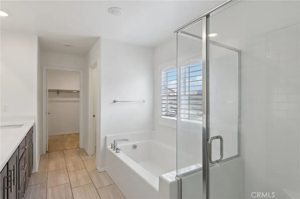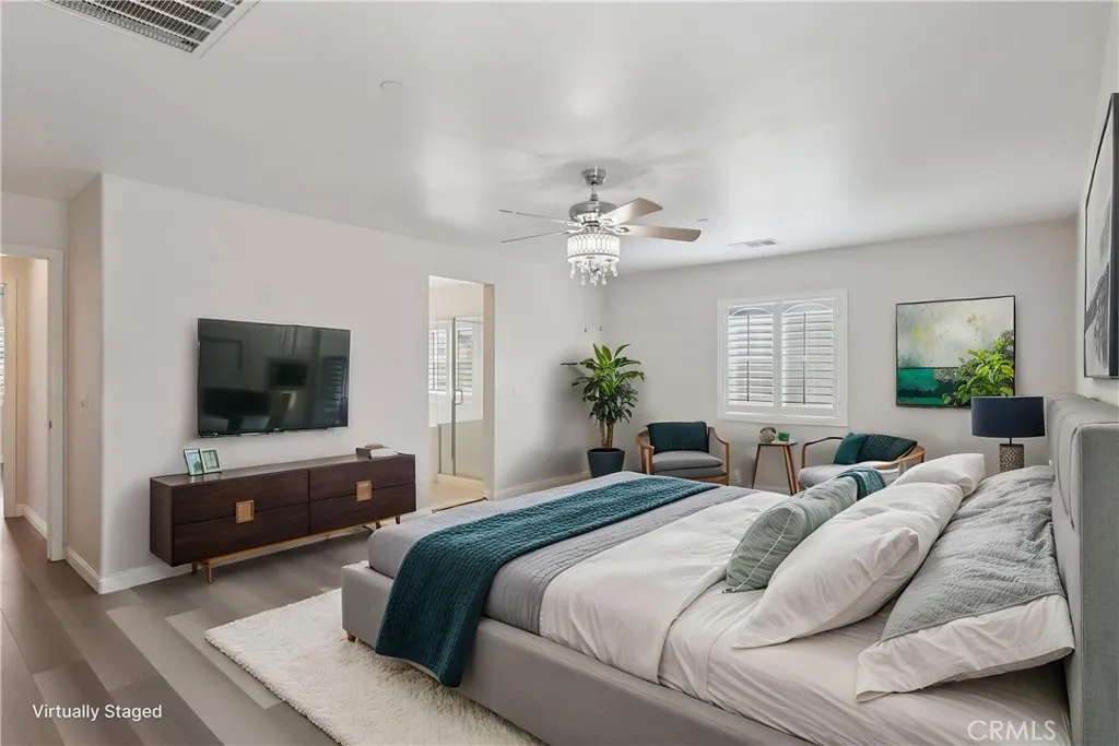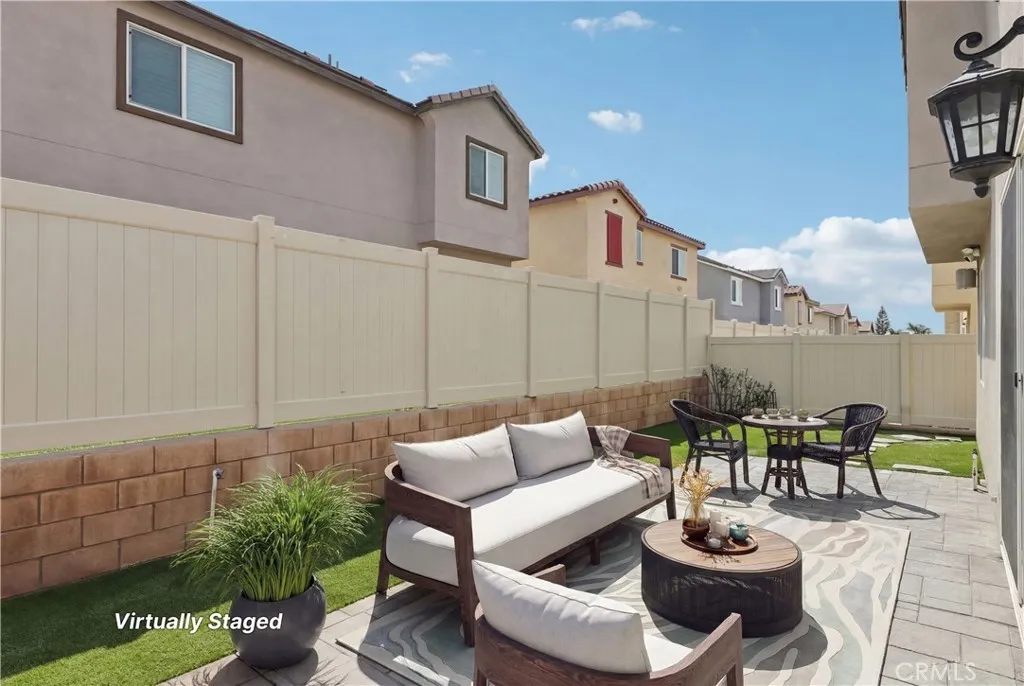 Beautiful two-story home located in a desirable gated community with access to a neighborhood park and playground featuring a green slide, picnic tables, and benches. Inside, a bright open-concept layout is filled with natural light, creating a comfortable and inviting living space. The kitchen features a spacious island with sink, abundant cabinetry, and a built-in microwaveideal for everyday living and casual gatherings. A convenient first-floor bedroom and full bathroom provide flexibility for guests, extended family, or a private home office. Upstairs, the primary suite offers a relaxing retreat with an ensuite bathroom featuring dual sinks, a soaking tub, and a separate glass-enclosed shower. Additional highlights include a dedicated laundry room with built-in cabinetry and a gas shut-off valve for added functionality. Step outside to an entertainment-ready backyard with low-maintenance turf and a stone patio area, perfect for outdoor dining or relaxing evenings. The home also includes owned solar, offering energy efficiency and long-term savings while enhancing overall value. A wonderful opportunity to enjoy comfort, convenience, and a well-maintained community setting.