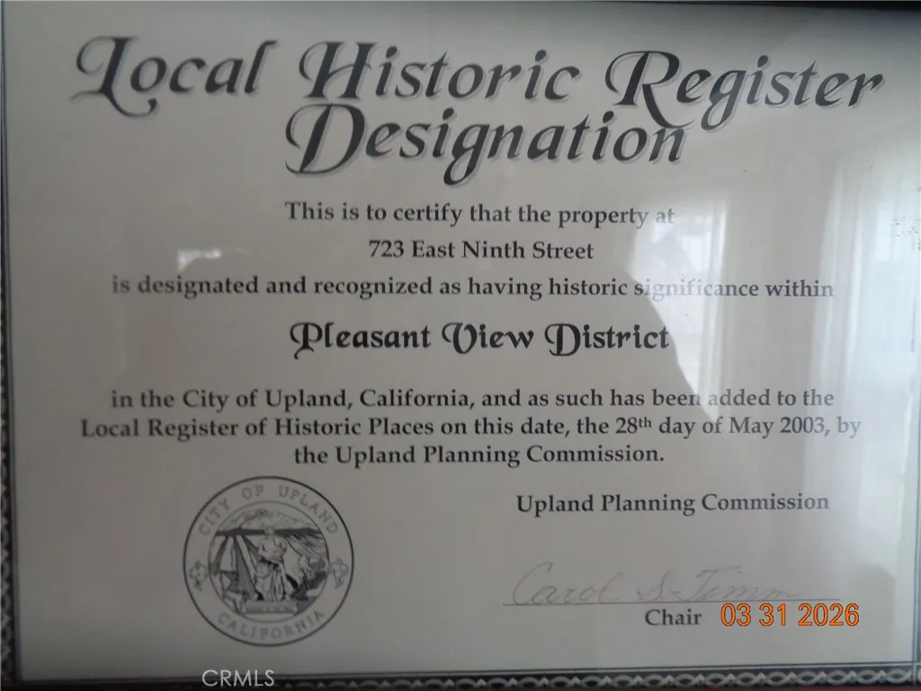 Step back in time and enjoy the charm of a simpler era in this single-story Upland home, set along tree-lined streets with classic picket fence appeal. With historical designation, this 3-bedroom, 1-bath residence showcases original architectural details, including built-in niches and cabinetry. The living room features a gas fireplace, while the spacious dining area is ideal for gatherings. A large family room sits adjacent to the kitchen, which retains its original character and includes an additional dining space. Bedrooms are generously sized, each with ceiling fans and abundant natural light. The home includes indoor laundry with a 220-amp hookup, gas floor heating, and no air conditioningpreserving its vintage authenticity. A private drive-through driveway offers convenient front-to-rear access. The property also features RV parking, a detached two-car garage, and a separate carport, providing flexible use options. The backyard offers exceptional privacy, with a grassy area, large planters, and a built-in BBQ stationperfect for outdoor enjoyment. Award winning Upland schools are nearby. Shopping and world class Upland parks and recreation opportunities abound. The newer roof will give you a head start as you claim your very own piece of the American Dream in beautiful Upland California!