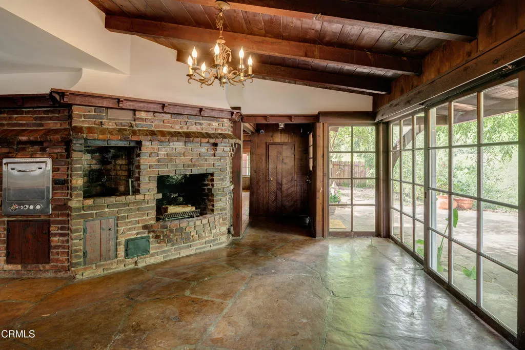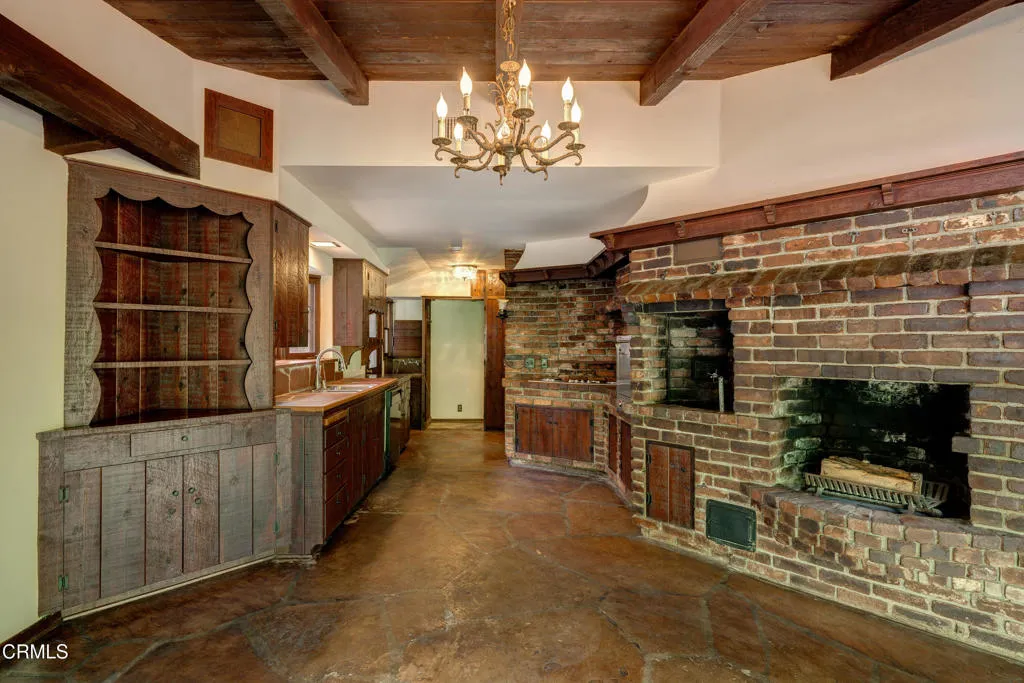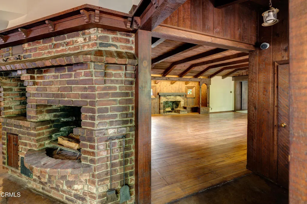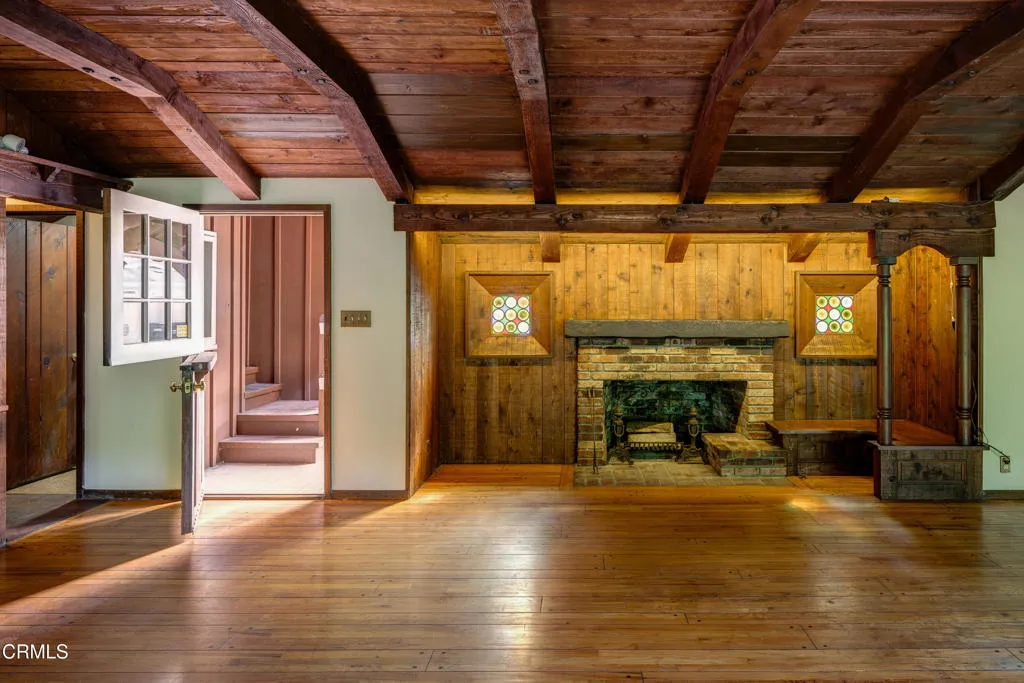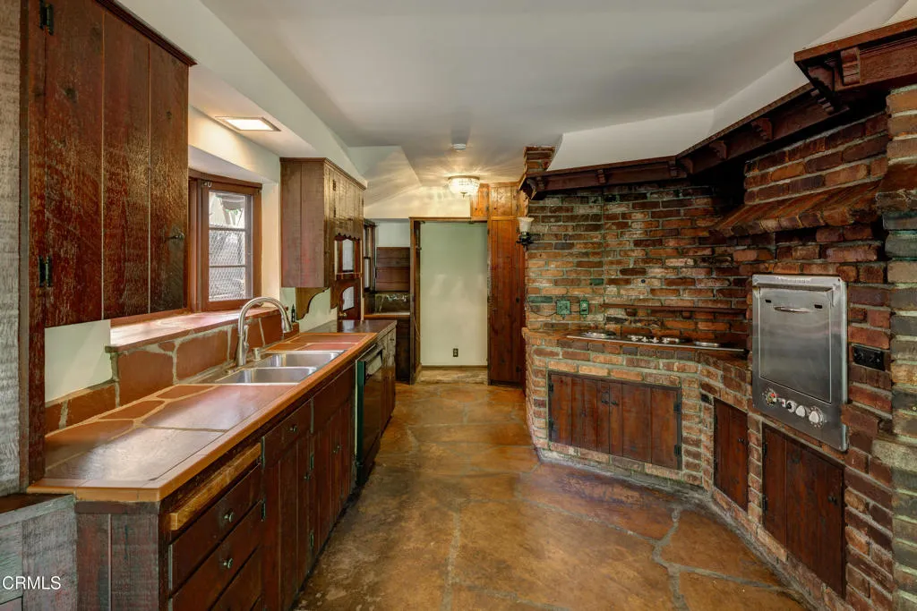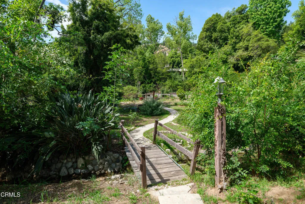 This architectural chef-d'oeuvre stands proudly on Niodrara Dr exuding elegance and timeless distinction. Built by a celebrated Hollywood home builder Robert Byrd known for crafting residences for the stars, the home is a true embodiment of distinctive California design. Upon entering, one is immediately transported into a world of rustic sophistication, where thoughtful details and intricate interiors create an atmosphere of warmth, charm, and enduring style.Nestled on an expansive lot, this enchanting property exudes romance and timeless charm. The sumptuous living room is anchored by a stunning brick fireplace framed with stained-glass windows, while original hardwood floors, exposed beam ceilings, and dramatic custom wood cabinetry create a warm, inviting atmosphere. Large windows offer picturesque views of the magical gardens beyond.Adjacent to the living room, the remarkable original kitchen is truly a work of art. Featuring brick walls, a built-in oven, flagstone floors, and beautifully preserved cabinetry, it blends rustic elegance with intricate wood detailing. The adjoining dining area opens seamlessly to a flagstone patio, perfect for indoor-outdoor living and entertaining.The main level also includes a serene primary suite with beamed ceilings and abundant natural light, along with a stylish powder room. A wooden staircase at the main entrance leads to a private guest suite above the garage, complete with soaring ceilings.Outdoors, the property is further enhanced by multiple terraces, a charming wooden bridge, mature trees, and lush, thoughtfully designed garde