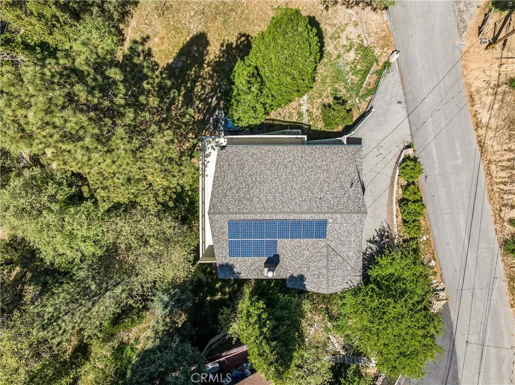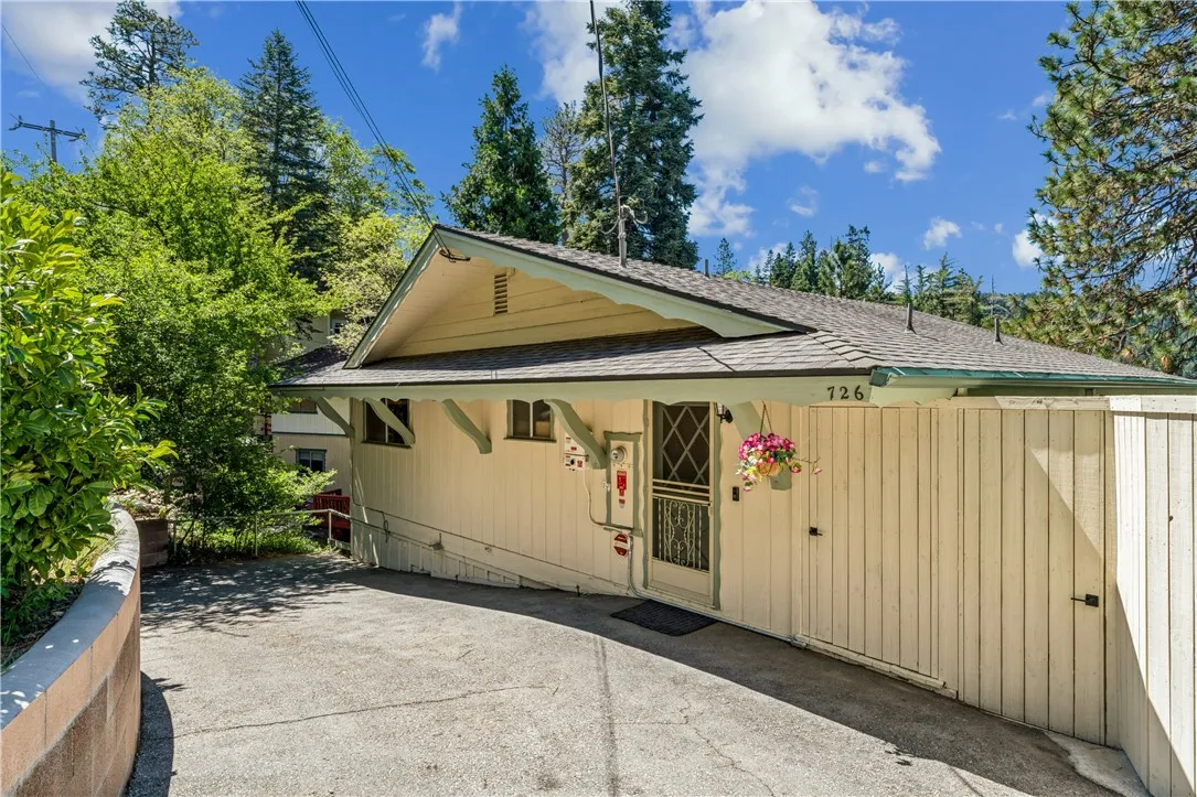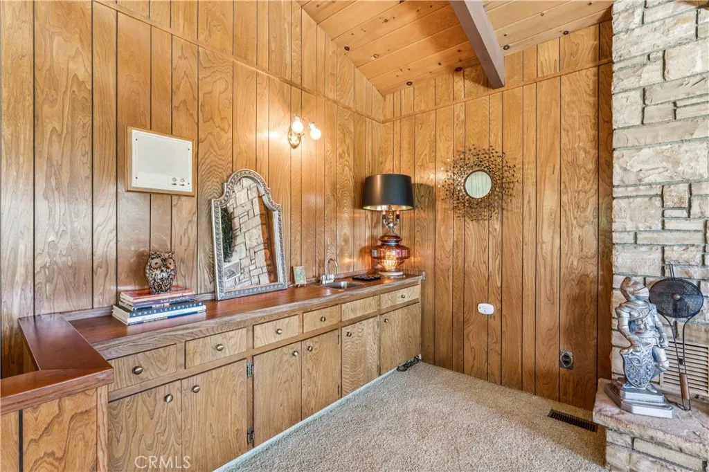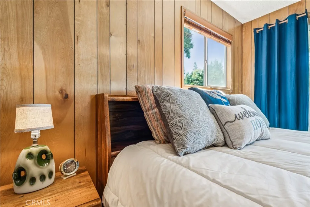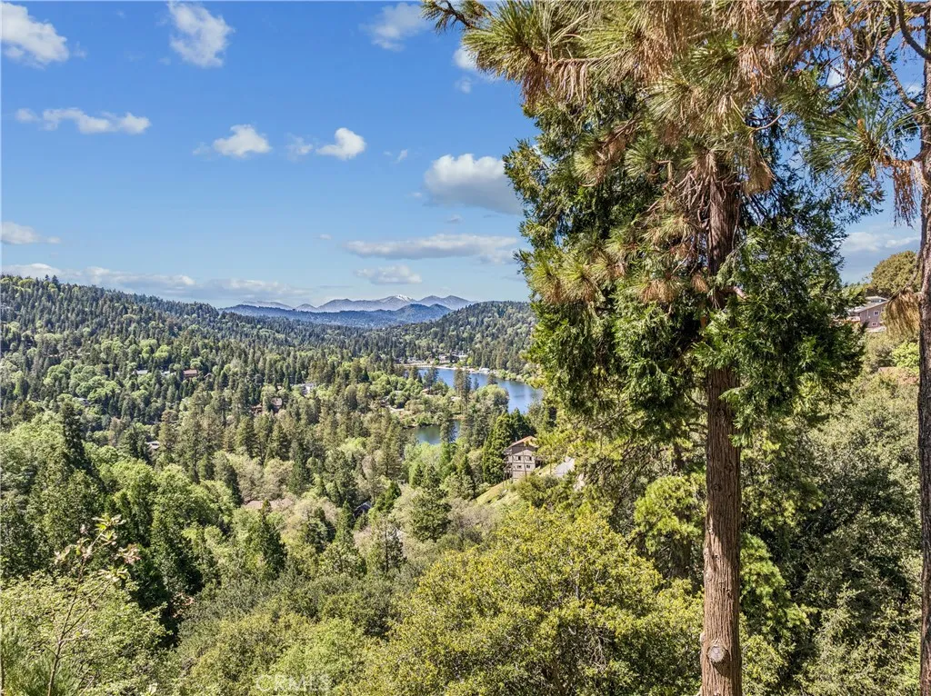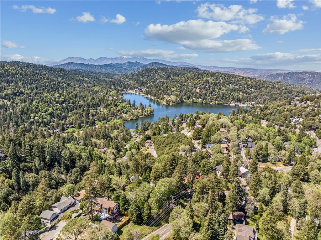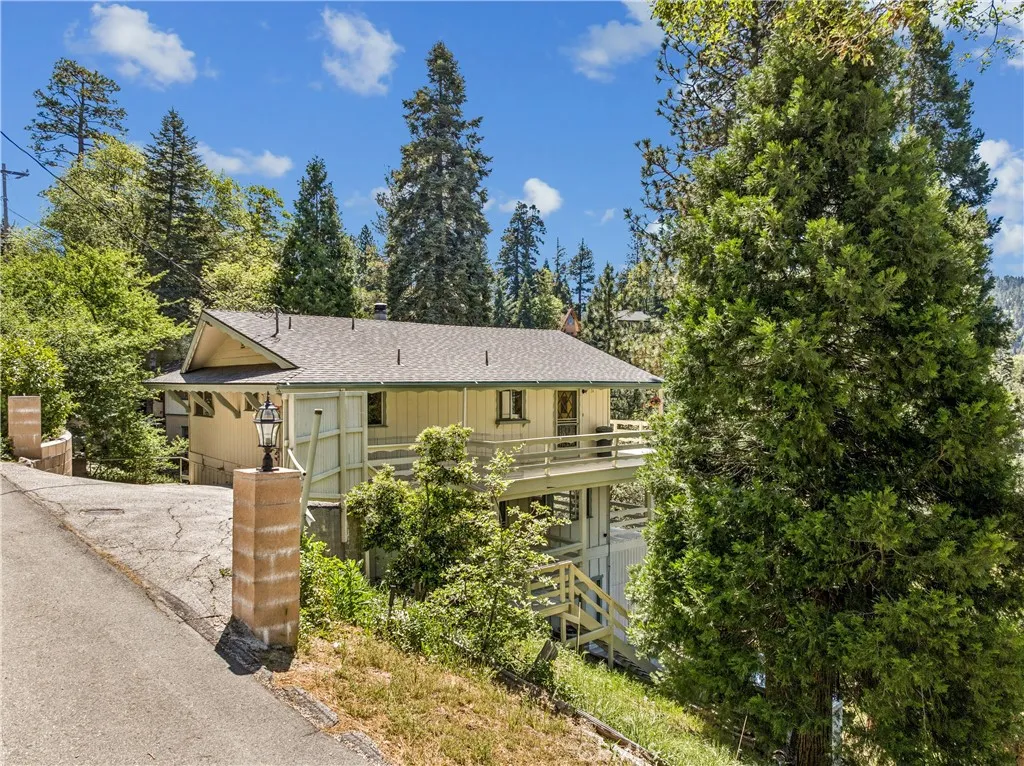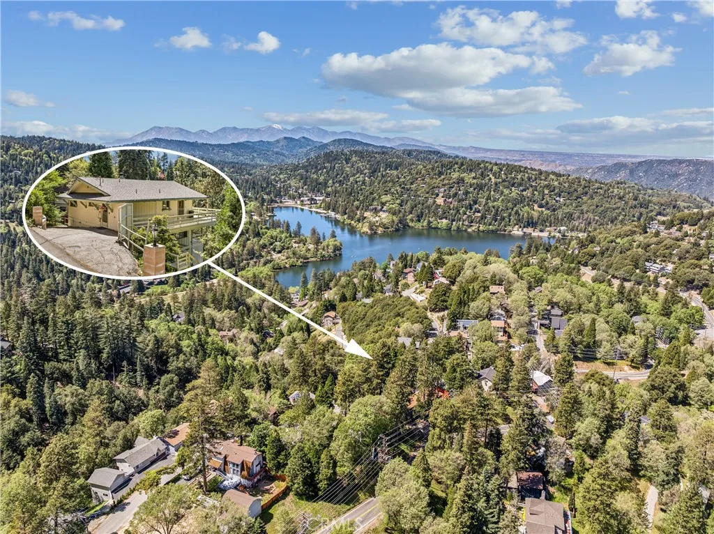 If Don Draper ever escaped to the mountains, this would have been his retreat. With sweeping views of Lake Gregory, this midcentury gem blends timeless design with modern comfort. Three separately deeded lots provide space and privacy, surrounded by whispering pines and calm mountain breezes. Inside, the glow of afternoon light highlights wood paneling and beamed ceilings, capturing the warmth and refinement of a classic era. The open living room features a striking natural stone fireplace and a built-in wet bar, ideal for gatherings, quiet reflection, or creative inspiration. Sliding glass doors open to an expansive wraparound deck with panoramic lake views, perfect for indoor-outdoor living. Downstairs, both bedrooms open to a second deck and a bubbling hot tub, offering a peaceful escape under the stars. A spacious workshop with interior and exterior access provides excellent storage and space for inspired projects. Upgrades over the past few years include a new roof, repainted decks, refreshed terraced landscaping with laurel bushes, a modernized bathroom, leased solar panels, and updated central heating and air. Additional features like a security system, commercial-grade sprinklers, and lockable gates add peace of mind. A home where design meets comfort, this property feels both classic and current - imagine Peggy sketching ideas by the window, Roger appreciating the view, or Joan hosting with effortless grace. Light a fire, pour a drink, and settle into the kind of California cool that never goes out of style.