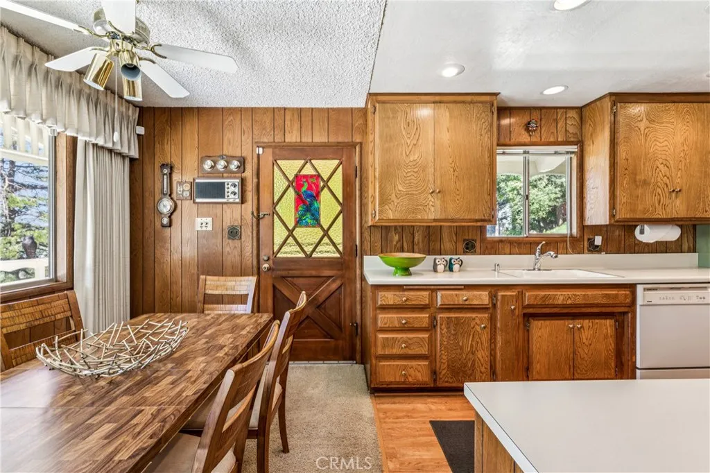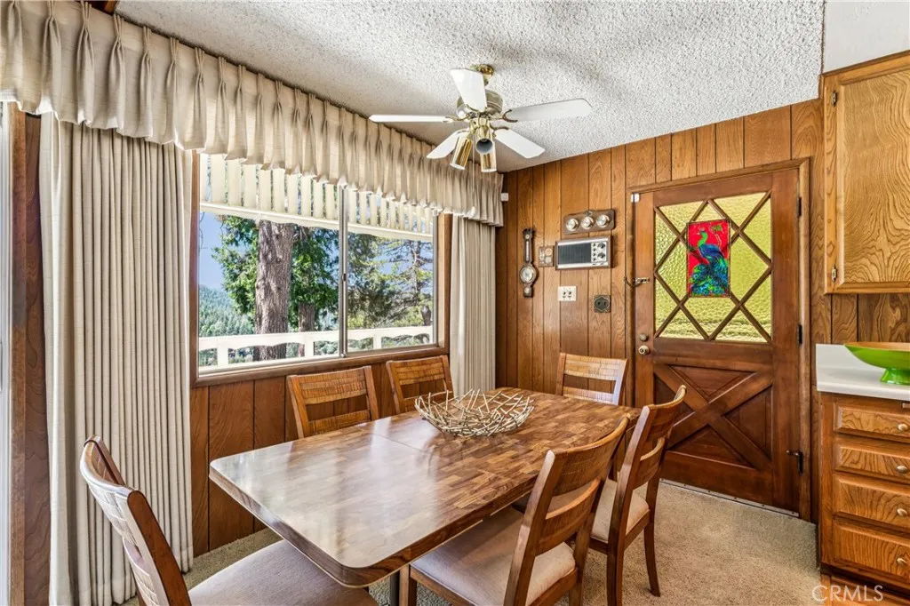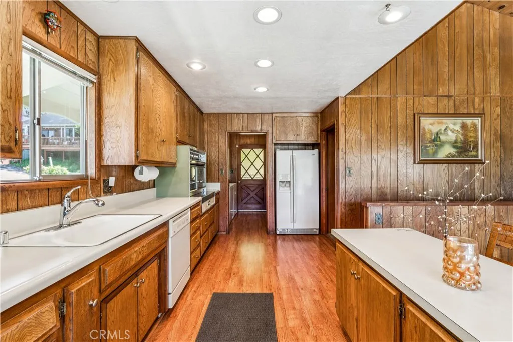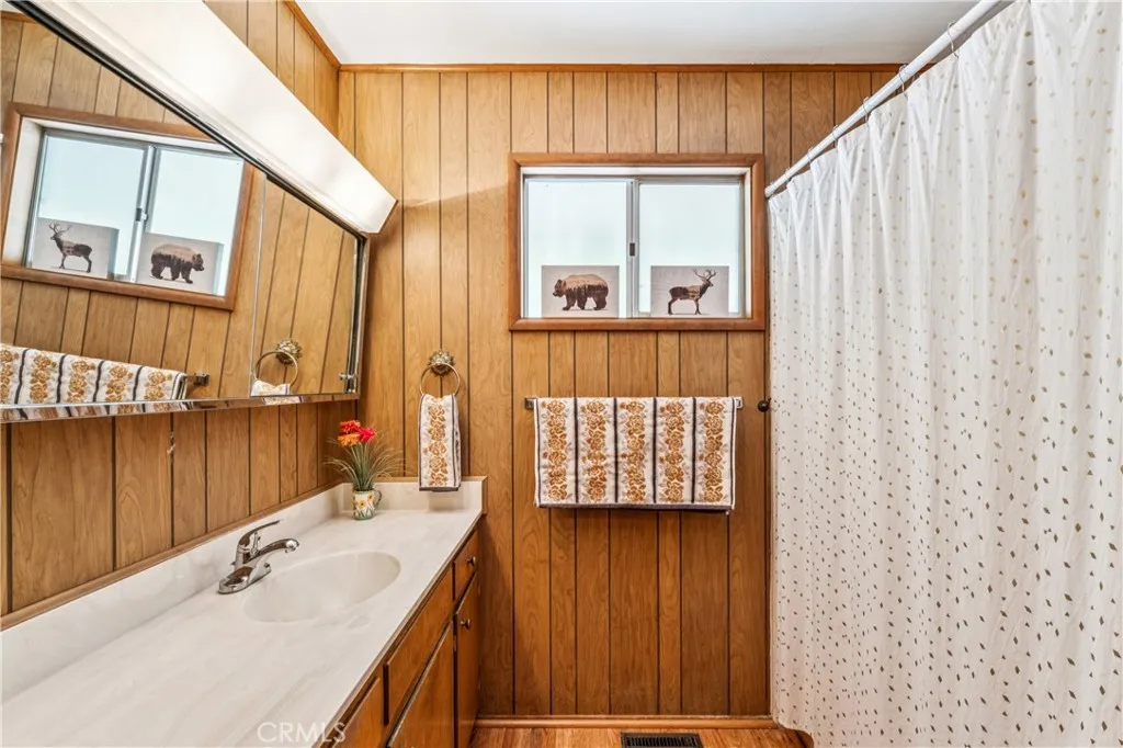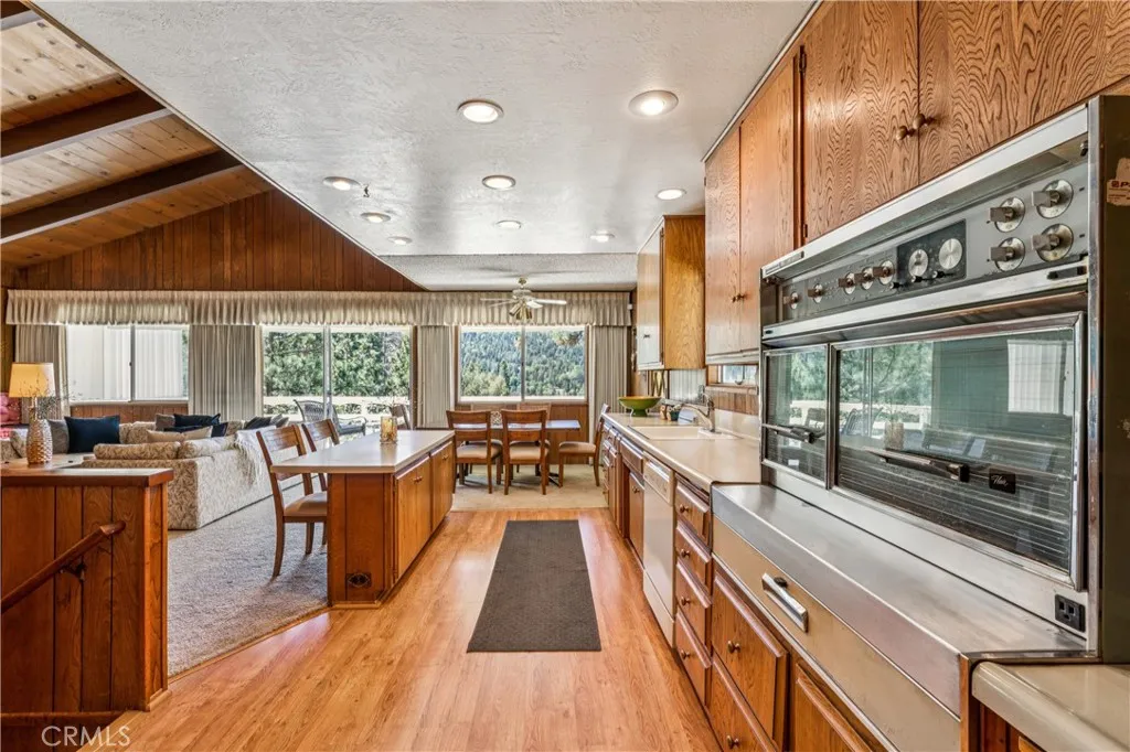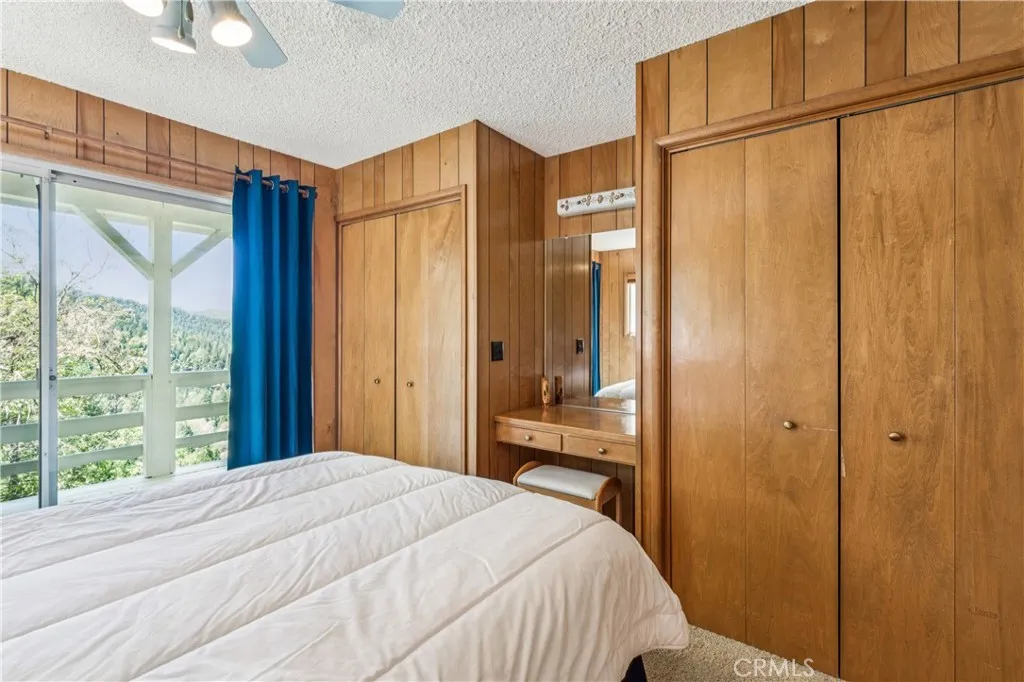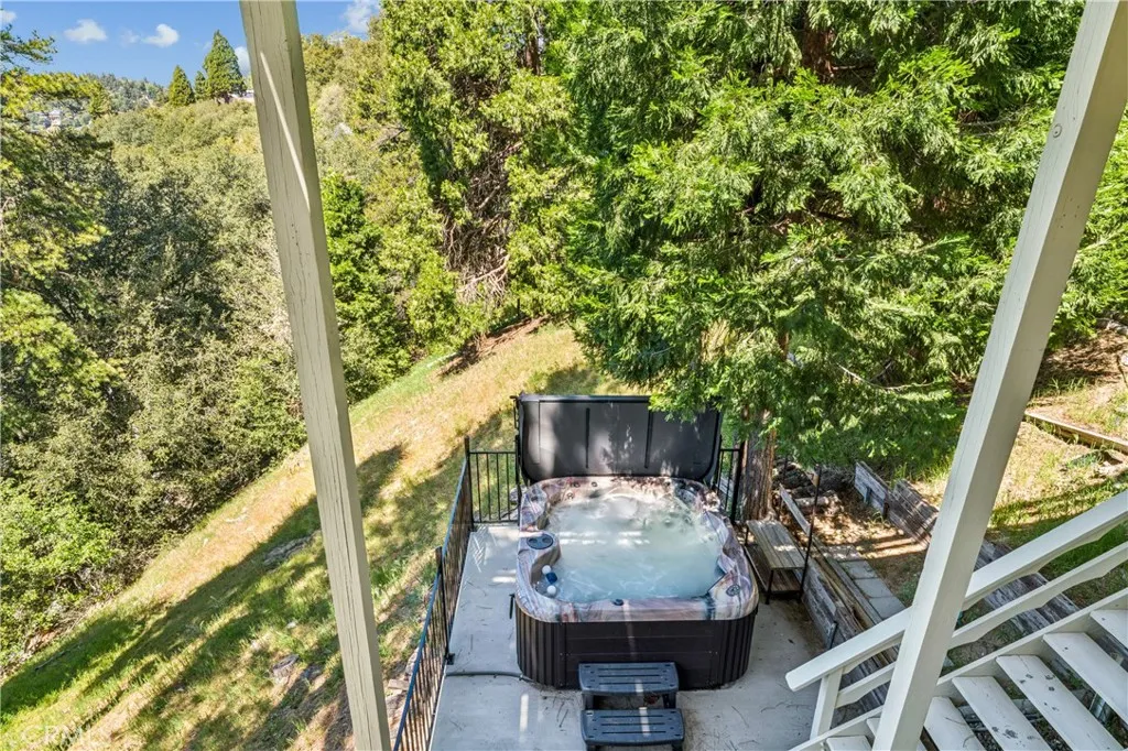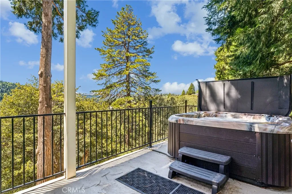 If Don Draper ever escaped to the mountains, this would have been his retreat. With sweeping views of Lake Gregory, this midcentury gem blends timeless design with modern comfort. Three separately deeded lots provide space and privacy, surrounded by whispering pines and calm mountain breezes. Inside, the glow of afternoon light highlights wood paneling and beamed ceilings, capturing the warmth and refinement of a classic era. The open living room features a striking natural stone fireplace and a built-in wet bar, ideal for gatherings, quiet reflection, or creative inspiration. Sliding glass doors open to an expansive wraparound deck with panoramic lake views, perfect for indoor-outdoor living. Downstairs, both bedrooms open to a second deck and a bubbling hot tub, offering a peaceful escape under the stars. A spacious workshop with interior and exterior access provides excellent storage and space for inspired projects. Upgrades over the past few years include a new roof, repainted decks, refreshed terraced landscaping with laurel bushes, a modernized bathroom, leased solar panels, and updated central heating and air. Additional features like a security system, commercial-grade sprinklers, and lockable gates add peace of mind. A home where design meets comfort, this property feels both classic and current - imagine Peggy sketching ideas by the window, Roger appreciating the view, or Joan hosting with effortless grace. Light a fire, pour a drink, and settle into the kind of California cool that never goes out of style.