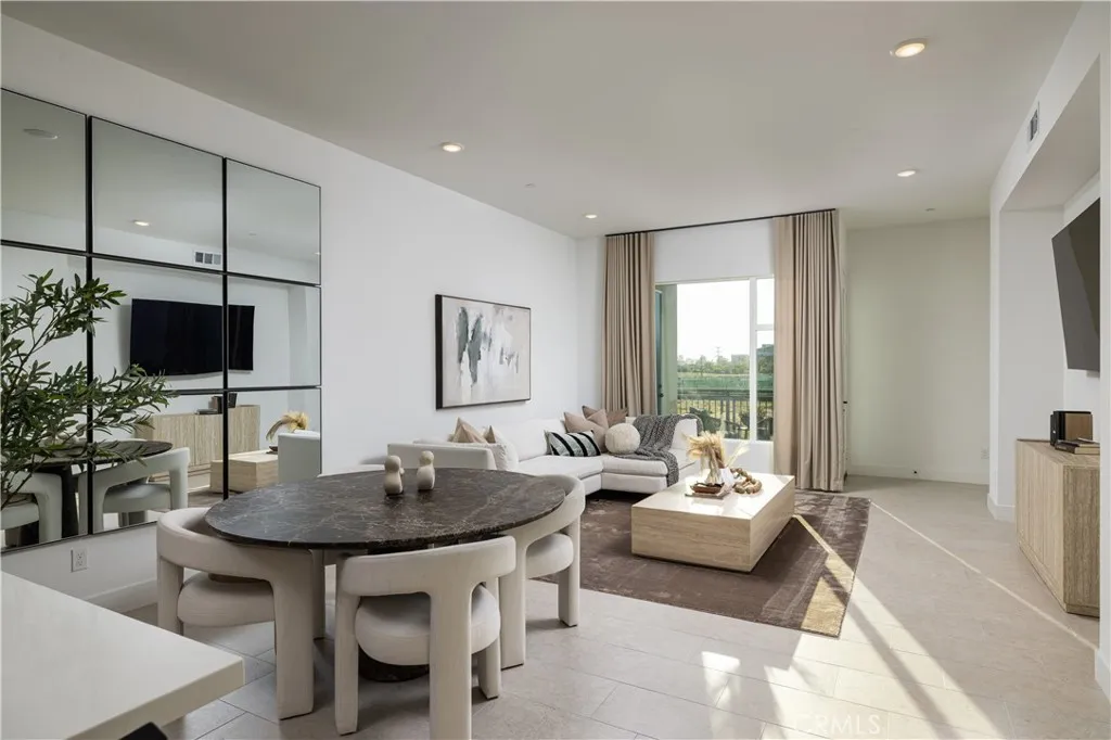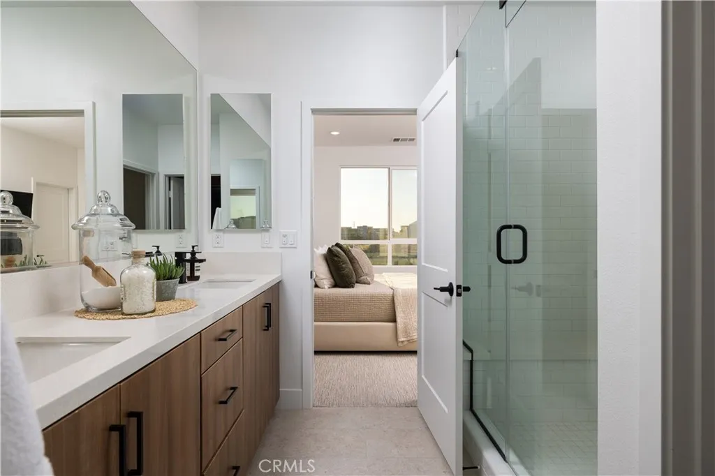 This newly built luxury townhome in The Landing at Tustin Legacy offers the perfect blend of modern sophistication and everyday convenience in one of Orange County's most desirable new communities. Completed in 2023, this light-filled contemporary home welcomes you with an open-concept layout featuring soaring 12-foot ceilings, imported Italian stone floors, and sleek matte black designer finishes that create an atmosphere of understated elegance. Enter the 3-story plan through the thoughtfully designed lower level that includes an ensuite bedroom (or optional office or fitness room) and direct access to the two-car garage. This space also opens directly to a sunny patio, bringing the outdoors in and making for a welcoming curb appeal. Large windows fill the second-level great room with natural light, creating an ideal environment for both entertaining guests and everyday relaxation. The living room flows seamlessly to a private balcony, extending your living area outdoors. The luxe chef's kitchen is finished with full-height maple cabinetry, a complete stainless steel JennAir/KitchenAid appliance suite, and a striking quartz island ready for casual bites and conversation. Upstairs, two generously sized bedrooms each provide ample accommodation with large windows and spacious closets. The primary suite serves as a true retreat, with two walk-in closets featuring professional organizers and a spa-like bathroom with double sink vanity and oversized shower. Modern convenience is built-in, with smart features including paid solar panels, an EV charger, Google Home smart system,