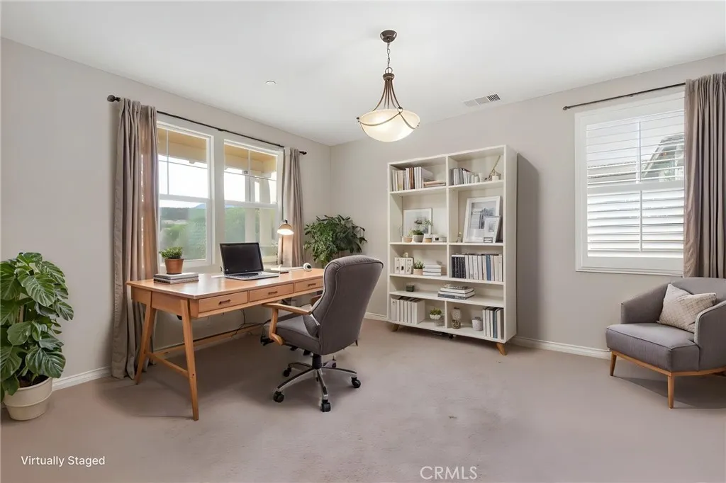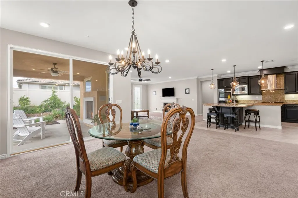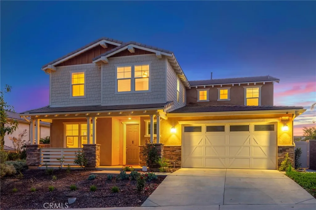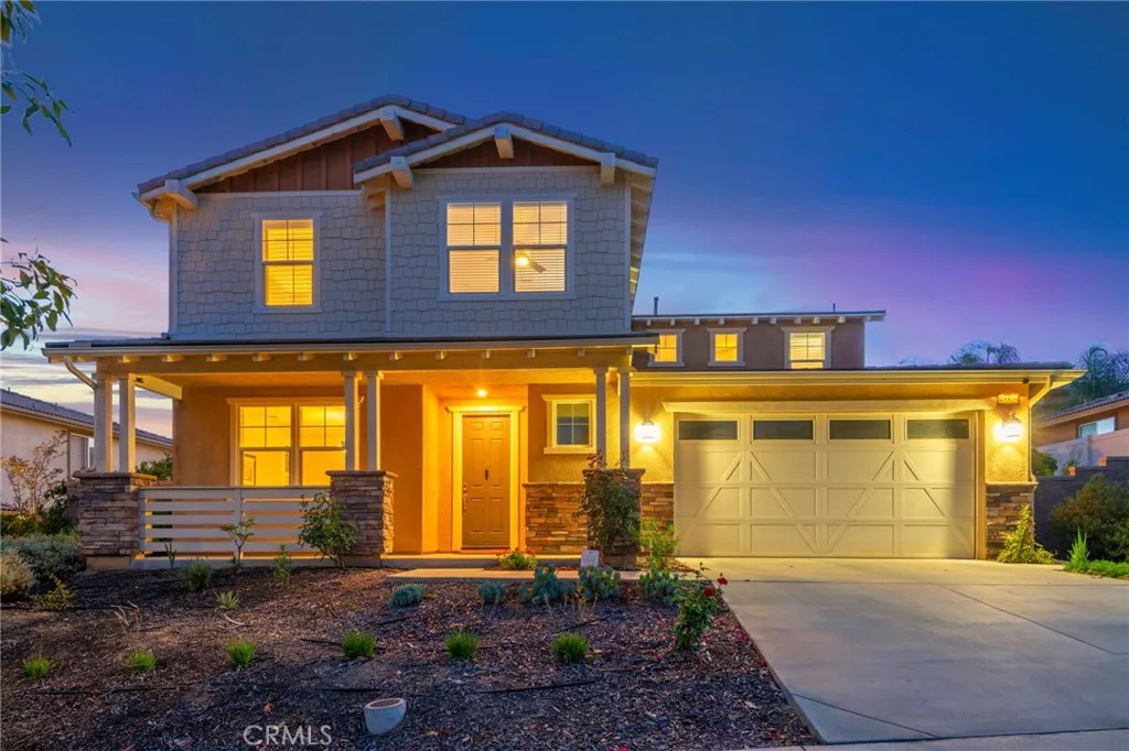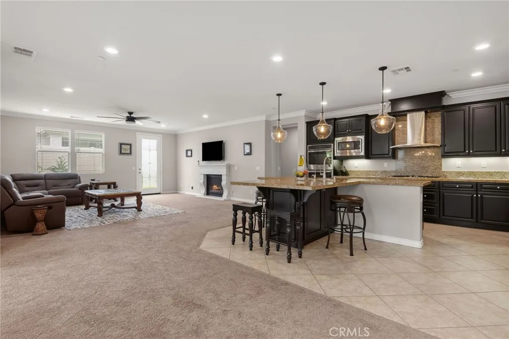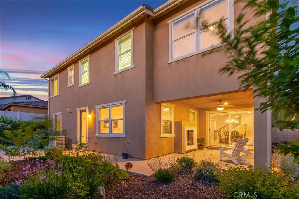 Located in the desirable Terracina community, this home is tucked away on a quiet street that gently dead-ends into a more rural setting, offering a rare blend of neighborhood living with a peaceful, country-inspired feel. Unlike typical tract surroundings, the property enjoys a unique sense of space and charm thats hard to find. A welcoming front porch sets the tone, while the backyard is designed for true California living with a covered outdoor California room complete with a fireplace, seamlessly accessed through a sliding glass doorperfect for year-round entertaining or relaxing evenings under the stars. Inside, youre greeted by wrought iron staircase rails, crown molding, and select plantation shutters, adding timeless character throughout. Thoughtfully designed for both everyday living and entertaining, the home features an extra-large kitchen island, tile flooring, and a walk-in pantry, all flowing seamlessly into the expansive family room and dining areaperfect for gatherings of any size. An optional formal living room offers flexibility and can easily serve as a home office or additional lounge space, while under-stair storage and ample linen cabinetry provide practical organization. The versatile floor plan includes a first-floor bedroom with an adjacent 3/4 bathroom, ideal for guests or multi-generational living, along with an inviting loft for added living space. The spacious primary suite features a private retreat, perfect for a sitting area, workspace, or personal escape. Additional highlights include a whole house fan, tankless water heater, and gutters, en