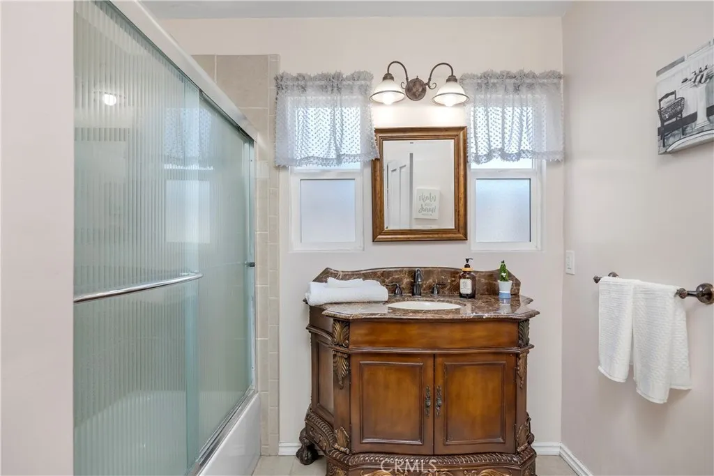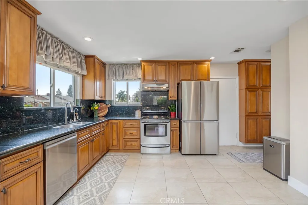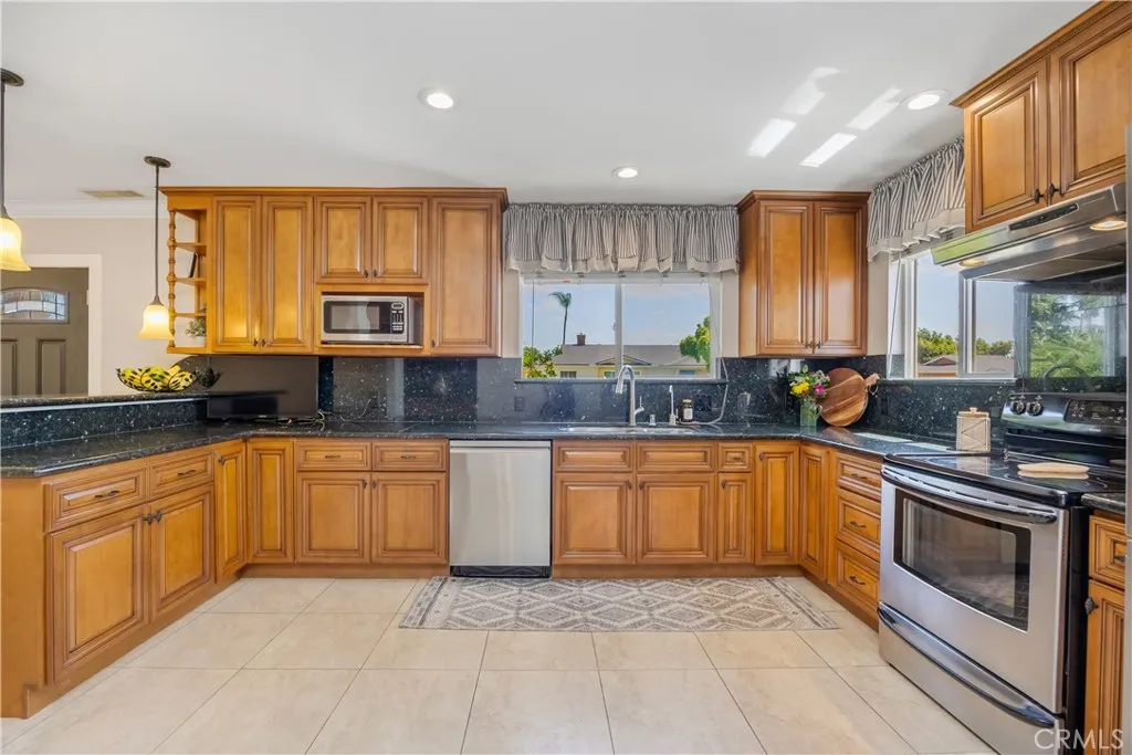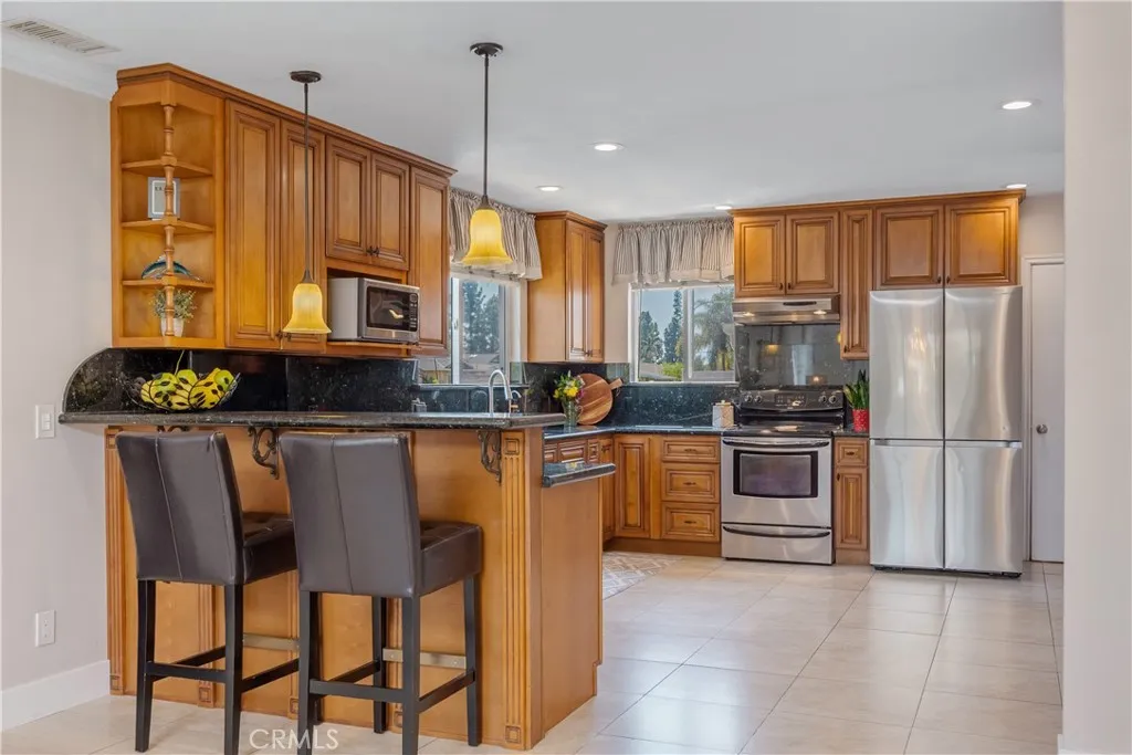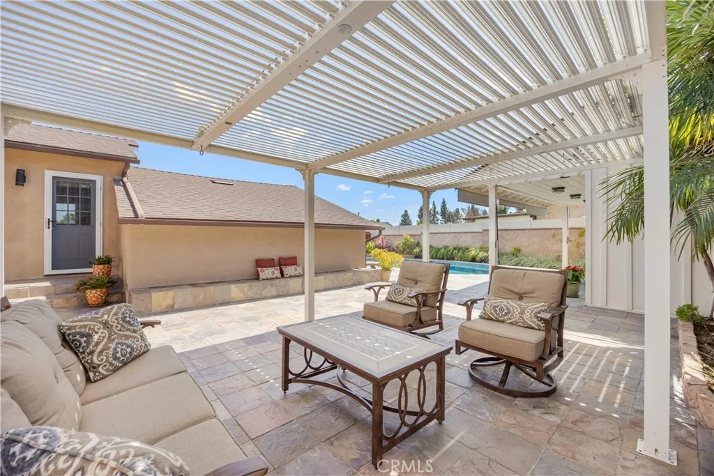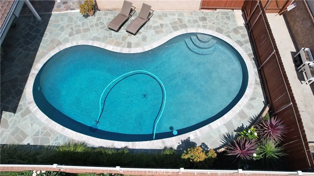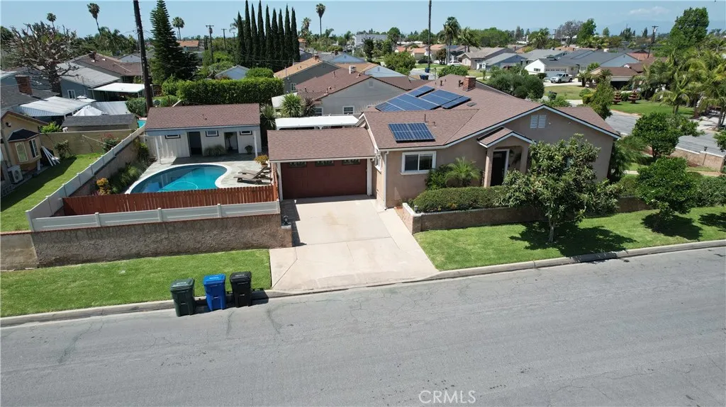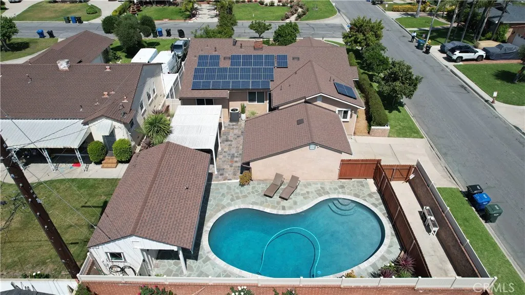 A North Downey private and secured residence, larger living at 2280 sq-ft. Featuring a complete open floor plan, no walls between the already large Living Rm-with a fireplace , Dining Rm with large bay windows, Family Rm with a 2nd door entrance, and a larger kitchen with granite counter tops, custom all wood cabinetes, stainless steel appliances and a standalone built-in wine bar. This home has bright natural light coming in from the upgraded dual-pan windows throughout and recess lighting for the evenings. Featuring 3 bedrooms, 2.5 bathrooms. The primary suite has a bathroom with tiled shower and a door to the backyard. Major system improvements provide peace of mind, including full copper plumbing, with upgrades extending to the section connecting to the water meter at the curb, a complete electrical rewire throughout the home, including walls and electrical panel upgraded to 240 volts. Additional upgrades include a tankless water heater, newer central A/C-Heater, a newer roof (approximately 1 year old), with upgraded rain gutters. Energy efficiency is a standout feature with a fully paid solar system, designed for long-term savings and sustainability. Be delighted by a true entertainers dream backyard featuring a custom-built barbecue area, an outdoor fireplace, multiple seating area, and a pergola to cover the hot sun when desired. A beautifully designed enclosed newer pool cabana, (possible ADU) offers a covered deck with lighting and ample interior space and a bathroom. Enjoy the resort style flooring, a premium slate tile hardscaping, including higher-end unfading g