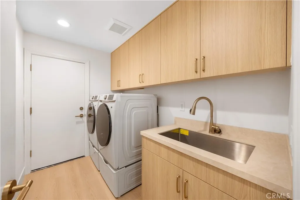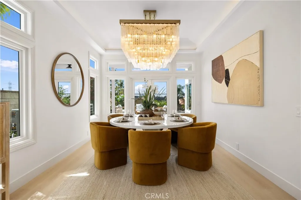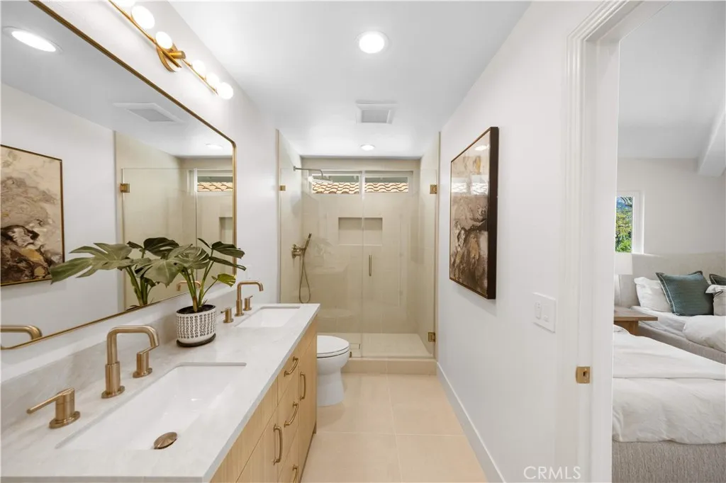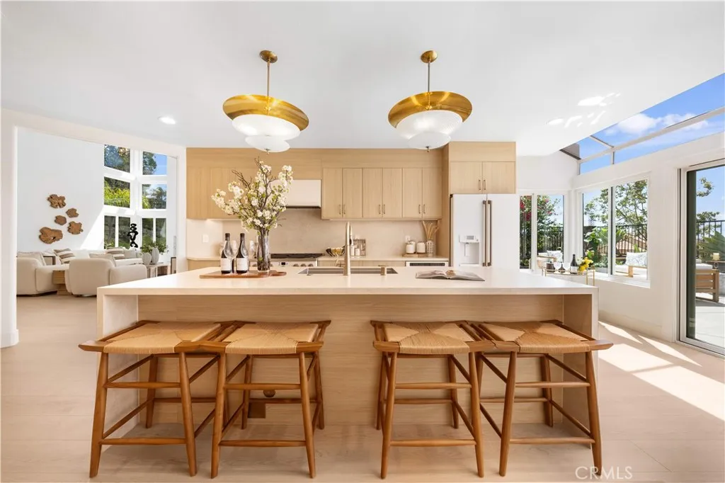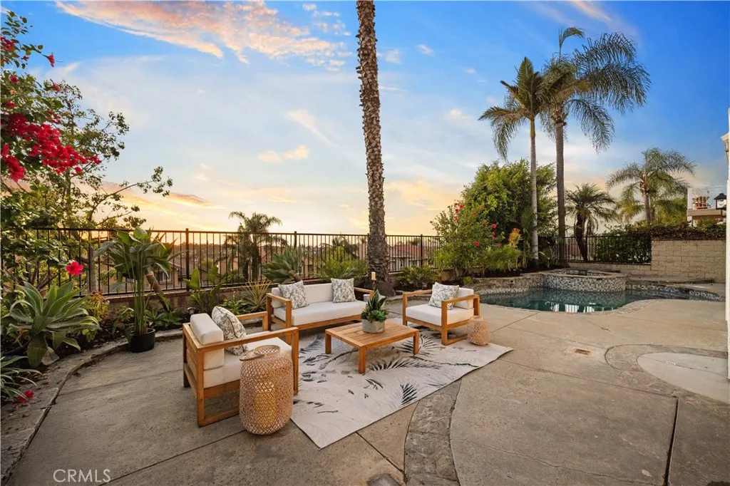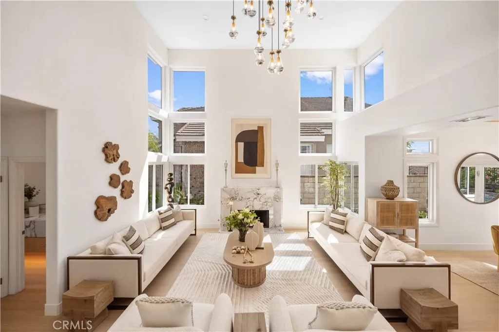 Located within the guard-gated Canyon Crest community, this designer residence blends LA design sensibility with the OC lifestyle, thoughtfully reimagined with approx $700K in permitted renovations. The home presents a cohesive design language where warm wood tones, curated stone, statement lighting, and clean architectural lines come together to create a calm, elevated living environment. Light, flow, and proportion are carefully considered, giving the home a sense of openness, balance, and quiet sophistication. Offering 5 beds and 4.5 baths, the layout is both functional and flexible, featuring a desirable main-level suite and an expansive upstairs bonus room ideal for a media room, lounge, gym, or multi-purpose use. Upon entry, soaring ceilings and large windows bring in abundant natural light, anchored by a designer fireplace, statement chandelier, skylight, and architectural staircase, creating a central space that feels both open and inviting. The dining area connects seamlessly to the backyard, supporting effortless indoor-outdoor living and entertaining. The kitchen serves as the heart of the home with a waterfall island, light-filled breakfast area, premium GE Caf appliances, and custom cabinetry, complemented by a new washer and dryer, curated designer lighting, and optional furniture for a true move-in ready experience. Upstairs, the primary suite offers a private balcony, spacious walk-in closet, and a spa-style bath with dual vanities, soaking tub, walk-in shower, and a large picture window capturing sweeping views while maintaining privacy. The backyard featur