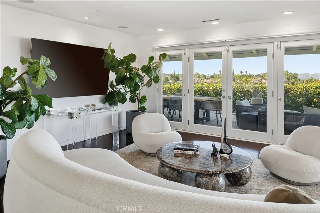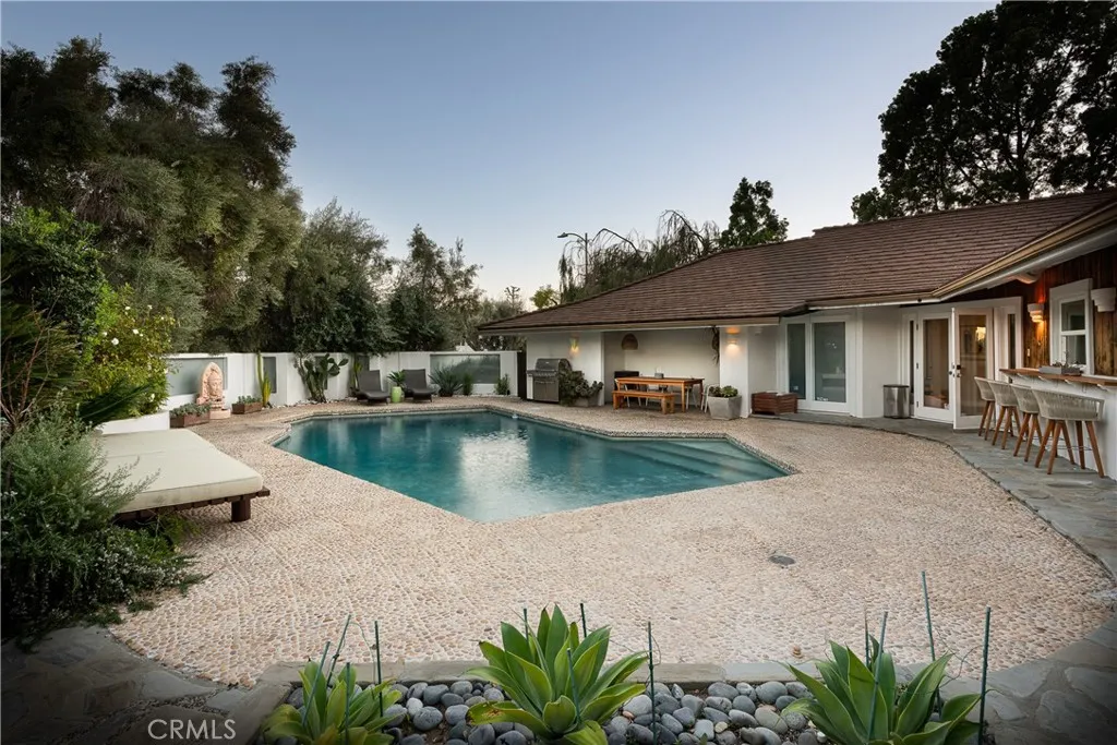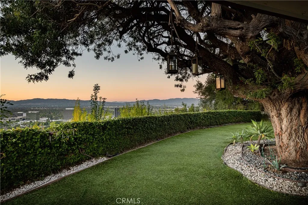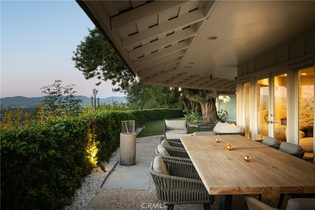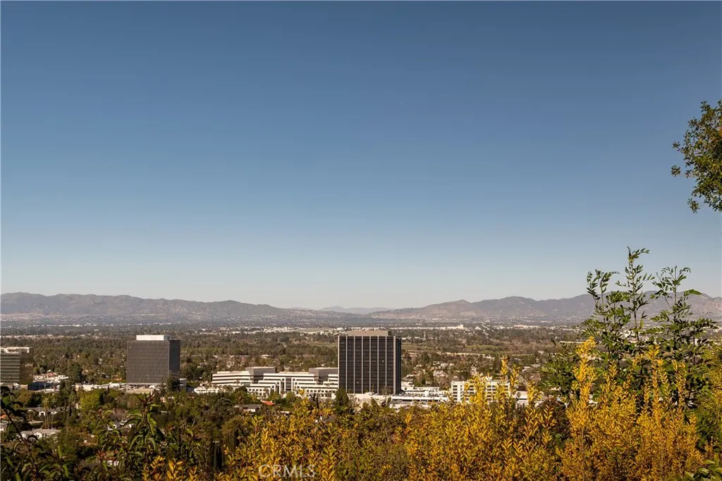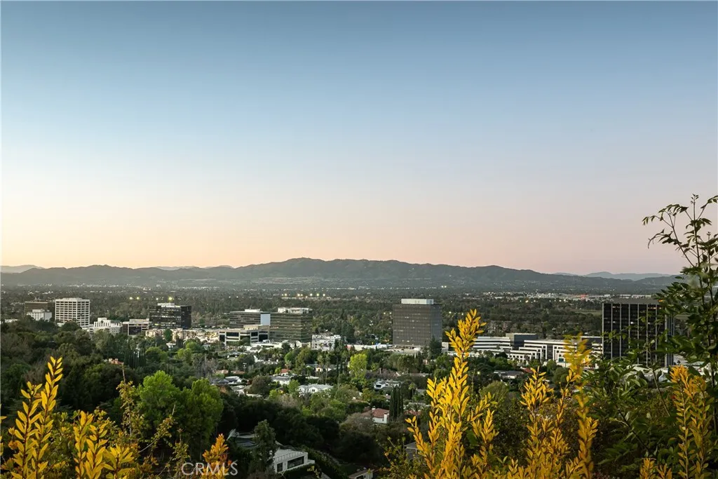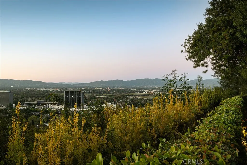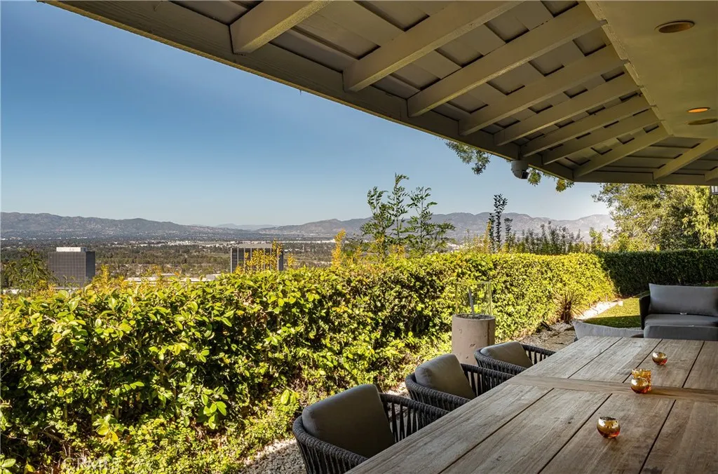 Tucked away on a quiet cul-de-sac in the coveted Royal Oaks neighborhood of Encino, this gated single-story residence offers a rare blend of privacy, design, with show stopping panoramic Valley views. Featuring 4 bedrooms and 4 bathrooms, the property unfolds as a true compound, set behind lush, mature landscaping and centered around a private courtyard that anchors the indoor-outdoor living experience. Walls of glass and French doors wrap the home, flooding the interiors with natural light while creating a seamless connection to the courtyard and surrounding outdoor spaces, with pass-through windows connecting to an interior bar and enhancing the indoor-outdoor flow. The open-concept layout features a modern chefs kitchen with a waterfall-edge island, custom cabinetry, and top-tier stainless steel appliances, leading into the expansive living and dining areas designed for entertaining. The living spaces open directly to covered outdoor dining and lounge areas overlooking panoramic views. The primary suite offers a tranquil retreat with direct outdoor access, a spacious walk-in closet, and a spa-inspired bath with elevated, hotel-style finishes. Secondary bedrooms are generously sized, including one with direct access to the courtyard. The outdoor spaces are arranged for both everyday use and entertaining, with a pool, multiple areas for dining and lounging, and a natural connection between the courtyard and view-facing terraces. Access to the backyard from the street adds a seamless convenience for entertaining. Located in the highly coveted Lanai School District and near