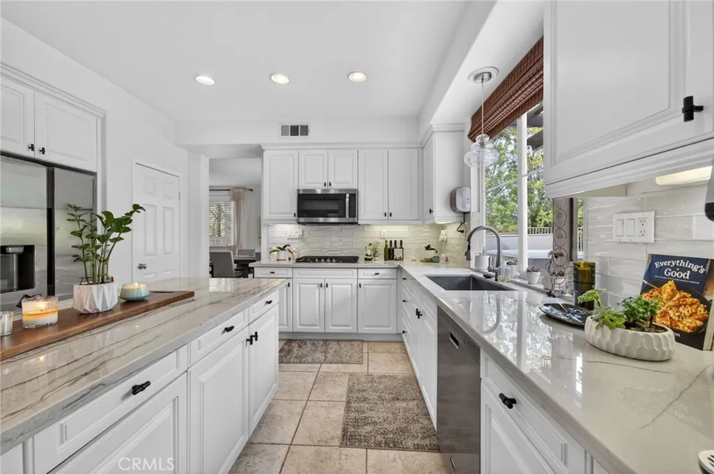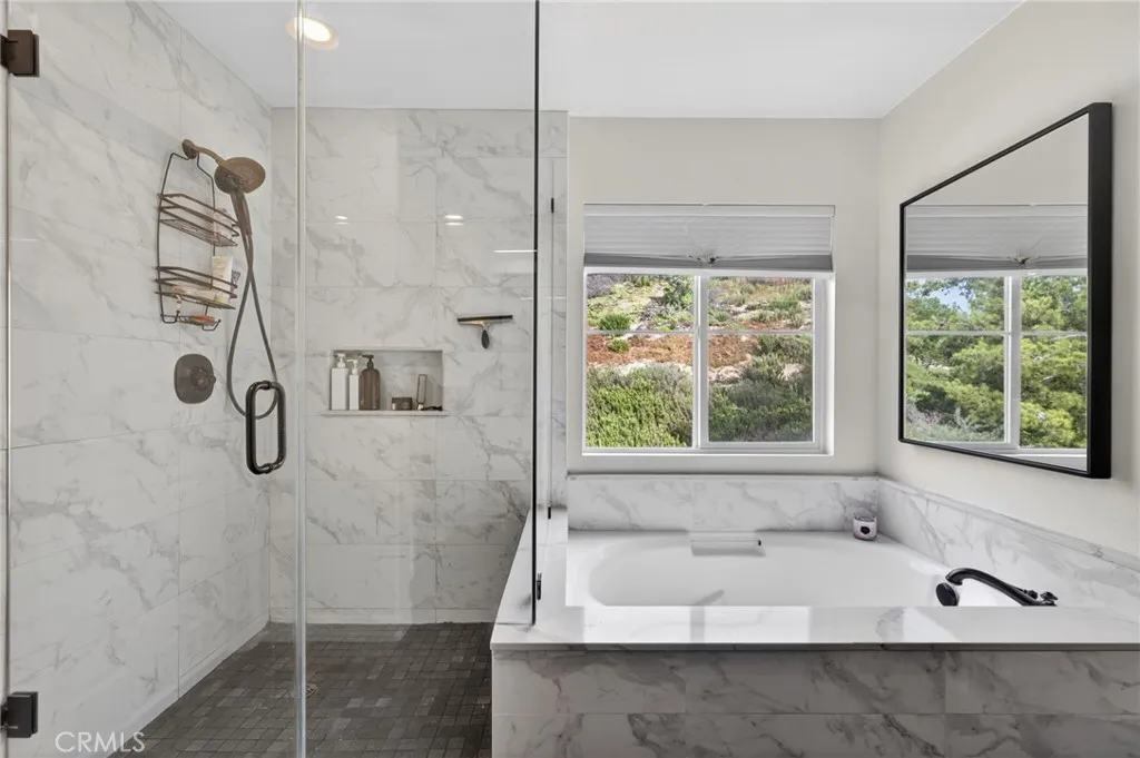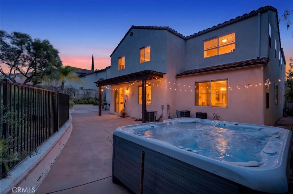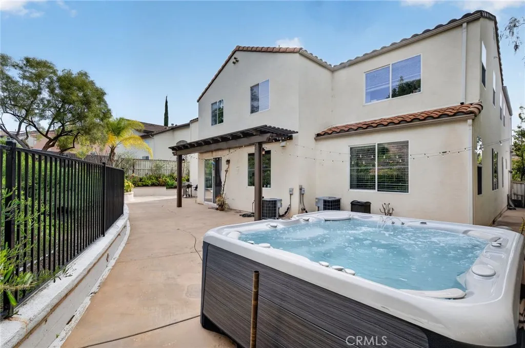 Welcome to The Fairways at Redhawk, Temecula's premier gated golf course community. This 4-bedroom, 3-bath home offers 3,545 square feet of bright, thoughtfully designed living space with neutral finishes and upgraded touches throughout. The remodeled kitchen features white raised-panel cabinetry, a large center island with dramatic stone countertops, gas cooktop, double oven, stainless steel appliances, and subway tile backsplash. A bright breakfast nook opens to the backyard through a sliding glass door and flows into the family room, making it a comfortable space for everyday living and entertaining. The master suite is a true retreat. Vaulted ceilings and dual barn doors set the tone, with one opening to a private attached office and the other to a fully remodeled spa-style bath. The ensuite features dual vanities with stone countertops, a dedicated makeup vanity, frameless glass walk-in shower with floor-to-ceiling marble tile, a soaking tub with marble surround, and a spacious walk-in closet. Black hardware and designer lighting complete the look. The flexible floor plan also includes a main-level bedroom and full bath, ideal for guests or multigenerational living, plus three additional bedrooms upstairs and a large bonus room ready to serve as a media room, playroom, or gym. Step outside and unwind in your own private oasis, complete with an above-ground jacuzzi spa, perfect for Southern California evenings after a round on the course. Families will love the award-winning schools serving this neighborhood, consistently ranked among the best in Riverside County. A spl
