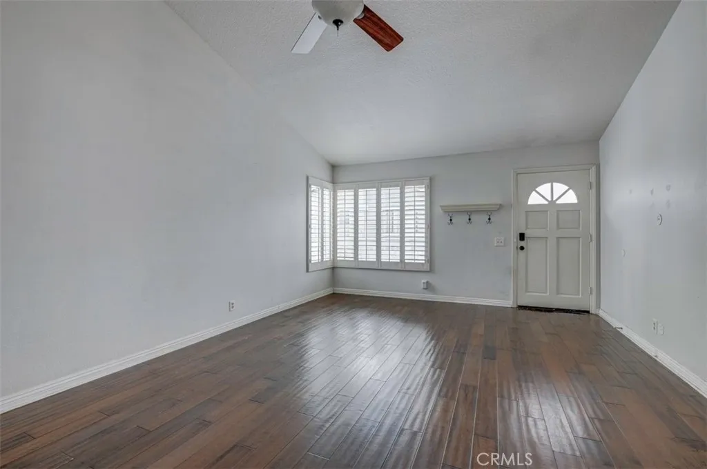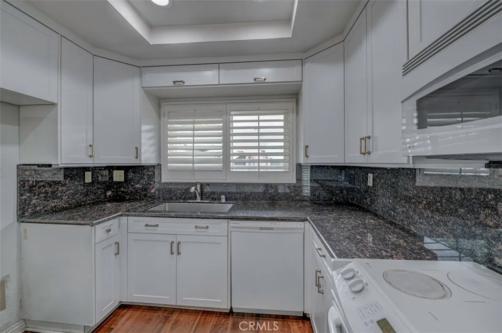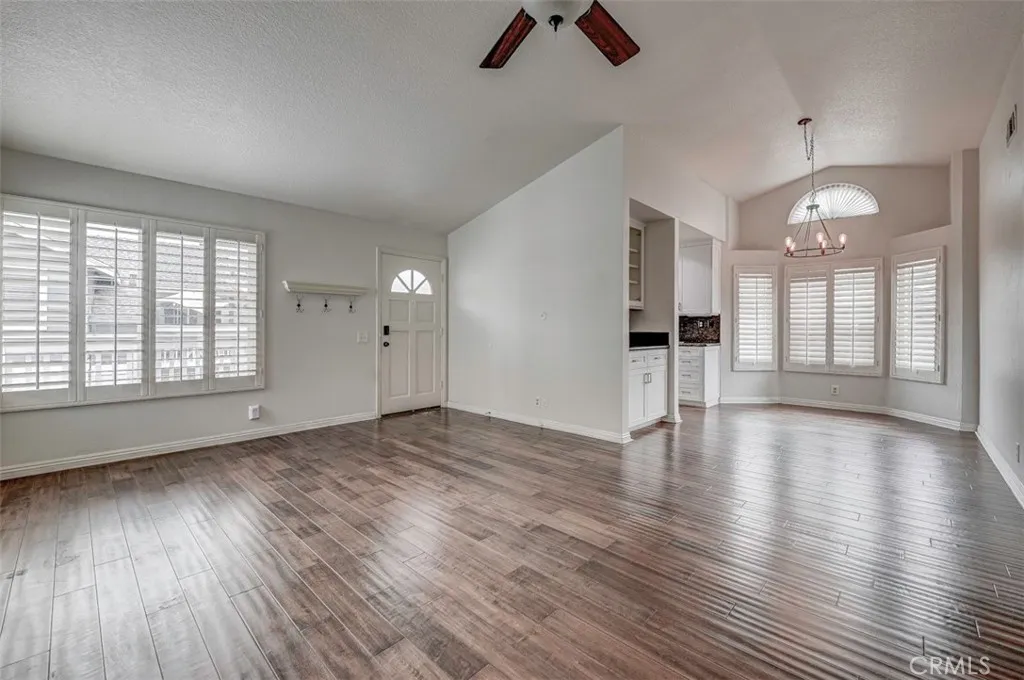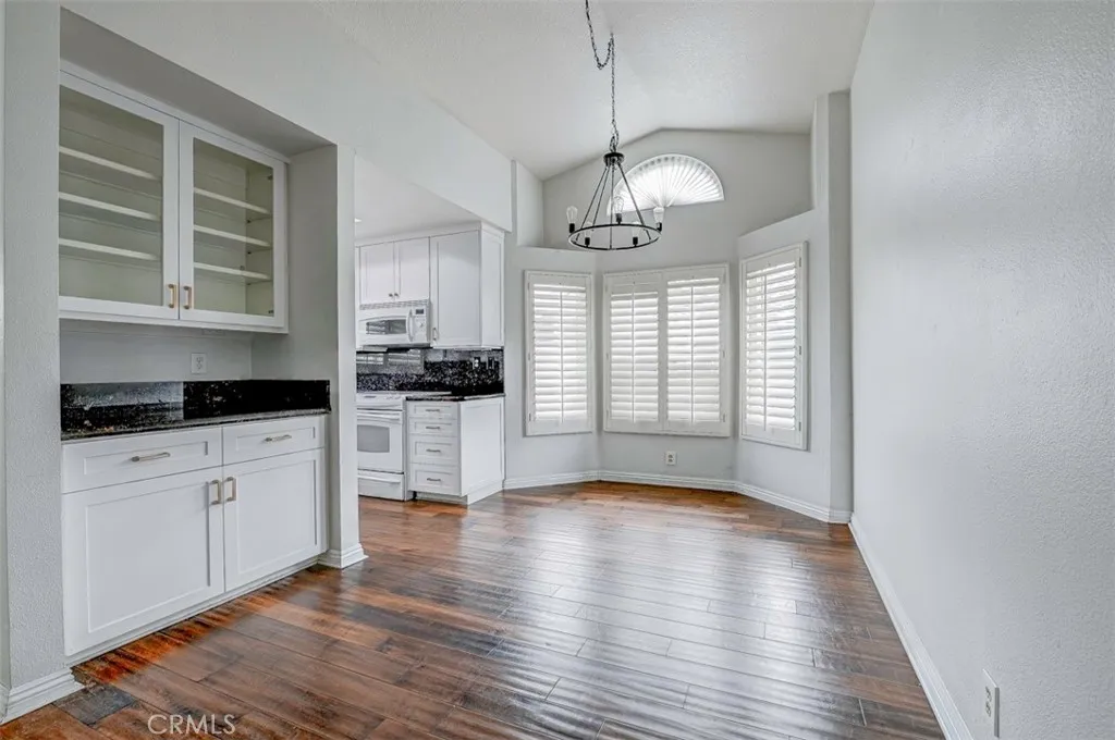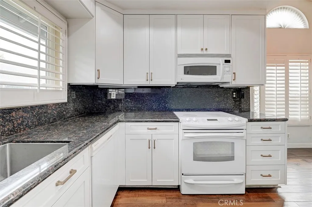 Warm, inviting and filled with natural light, this beautiful home offers a comfortable and stylish living experience. The spacious layout features wood flooring throughout the living room, dining area, kitchen and hallway complemented by granite countertops in both the kitchen and bathrooms. The kitchen is equipped with white cabinetry and appliances, a charming farmhouse sink and recessed lighting. A convenient cabinet niche in the dining room, complete with glass cabinetry and granite surfaces serves perfectly as a bar or decorative display. The living and dining rooms showcase elegant vaulted ceilings and an upgraded ceiling fan, creating a bright, open feel. Plantation shutters throughout add a timeless touch, while upgraded baseboards enhance the overall finish. The primary suite offers a large walk-in closet and direct access through a sliding glass door to the patio, creating a private and relaxing retreat. A secondary bedroom features mirrored closet doors for added style and functionality. Step outside to enjoy the spacious, enclosed patio ideal for outdoor living. Additional highlights include a detached garage conveniently located near the unit. This light-filled home blends comfort, charm, and thoughtful upgrades throughout.
