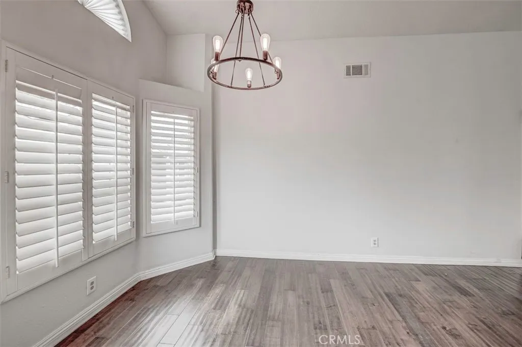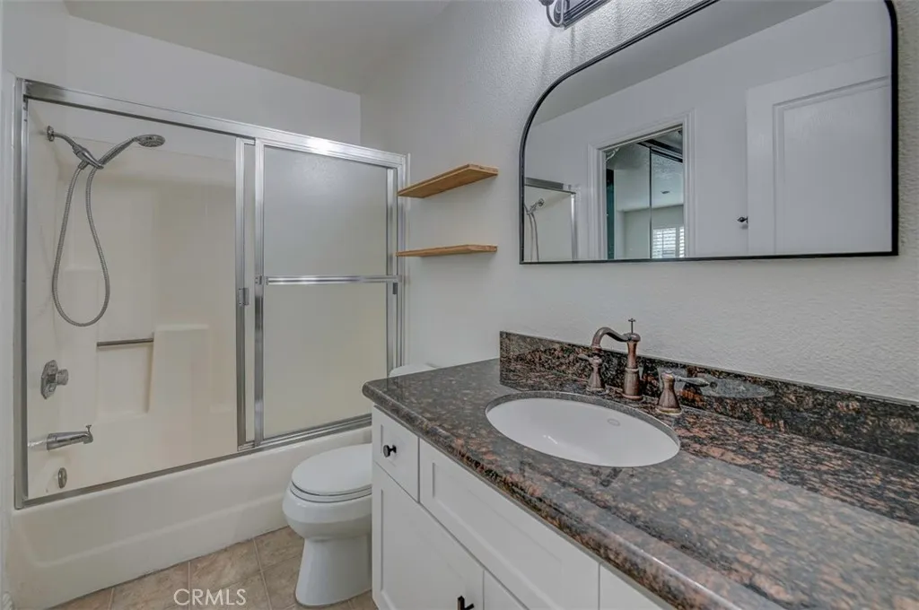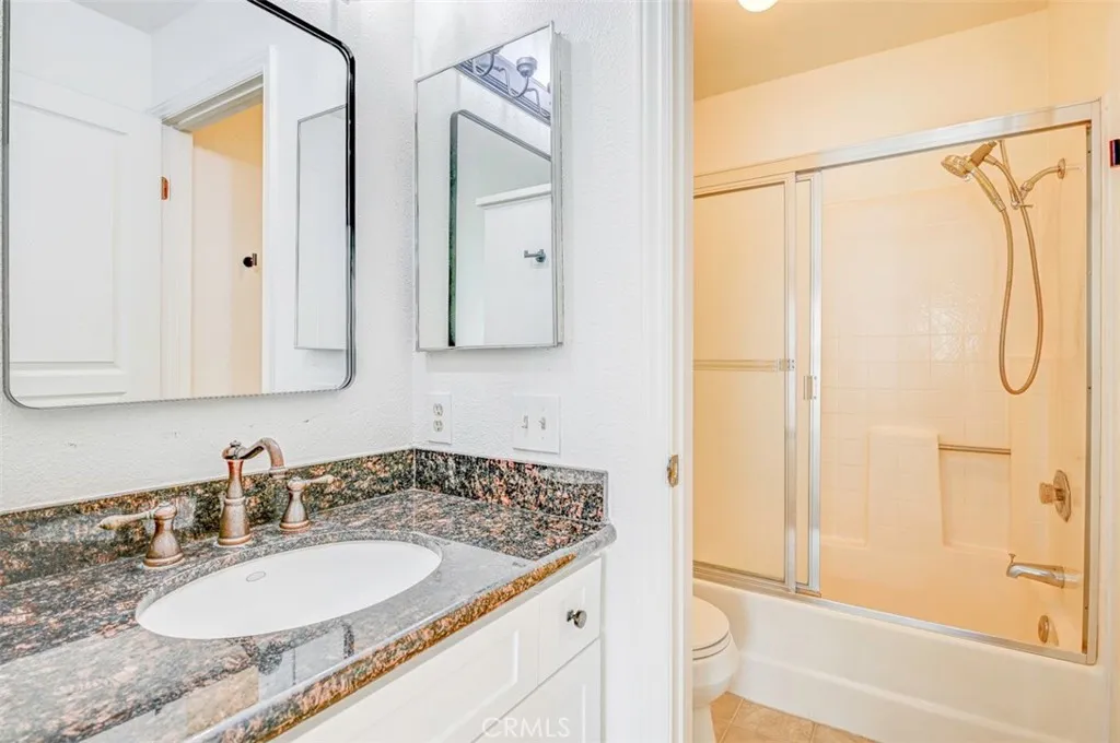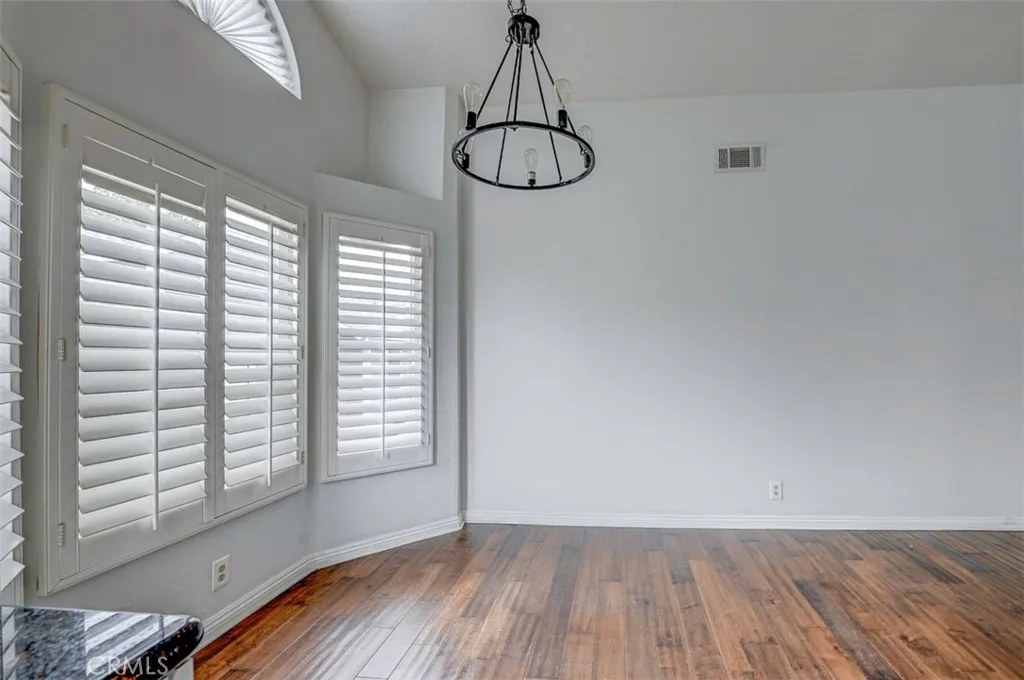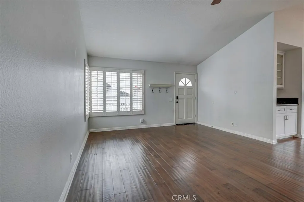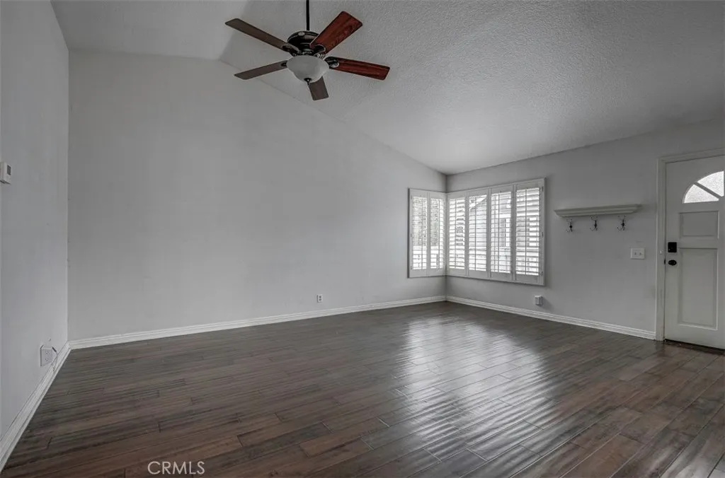 Warm, inviting and filled with natural light, this beautiful home offers a comfortable and stylish living experience. The spacious layout features wood flooring throughout the living room, dining area, kitchen and hallway complemented by granite countertops in both the kitchen and bathrooms. The kitchen is equipped with white cabinetry and appliances, a charming farmhouse sink and recessed lighting. A convenient cabinet niche in the dining room, complete with glass cabinetry and granite surfaces serves perfectly as a bar or decorative display. The living and dining rooms showcase elegant vaulted ceilings and an upgraded ceiling fan, creating a bright, open feel. Plantation shutters throughout add a timeless touch, while upgraded baseboards enhance the overall finish. The primary suite offers a large walk-in closet and direct access through a sliding glass door to the patio, creating a private and relaxing retreat. A secondary bedroom features mirrored closet doors for added style and functionality. Step outside to enjoy the spacious, enclosed patio ideal for outdoor living. Additional highlights include a detached garage conveniently located near the unit. This light-filled home blends comfort, charm, and thoughtful upgrades throughout.